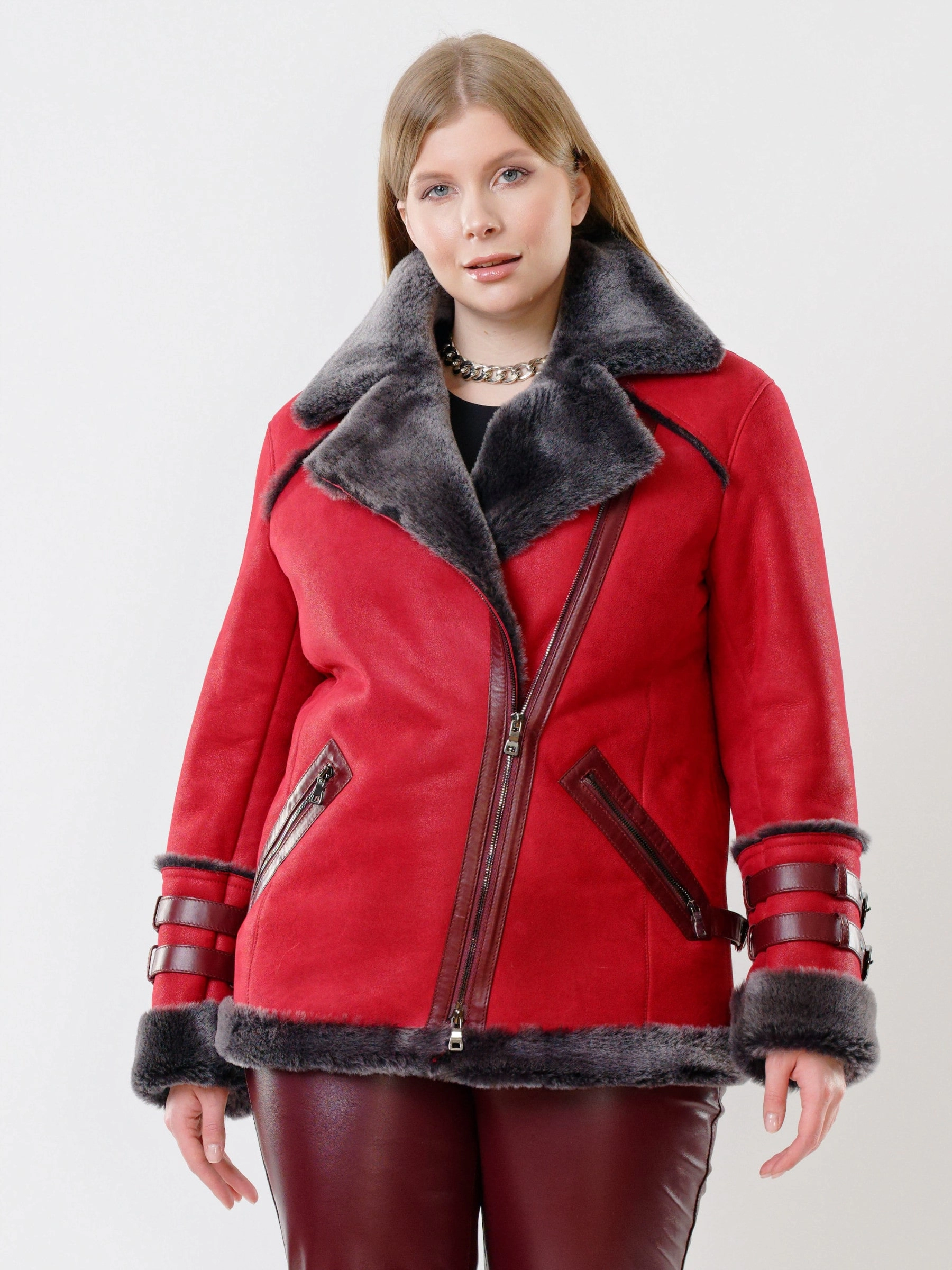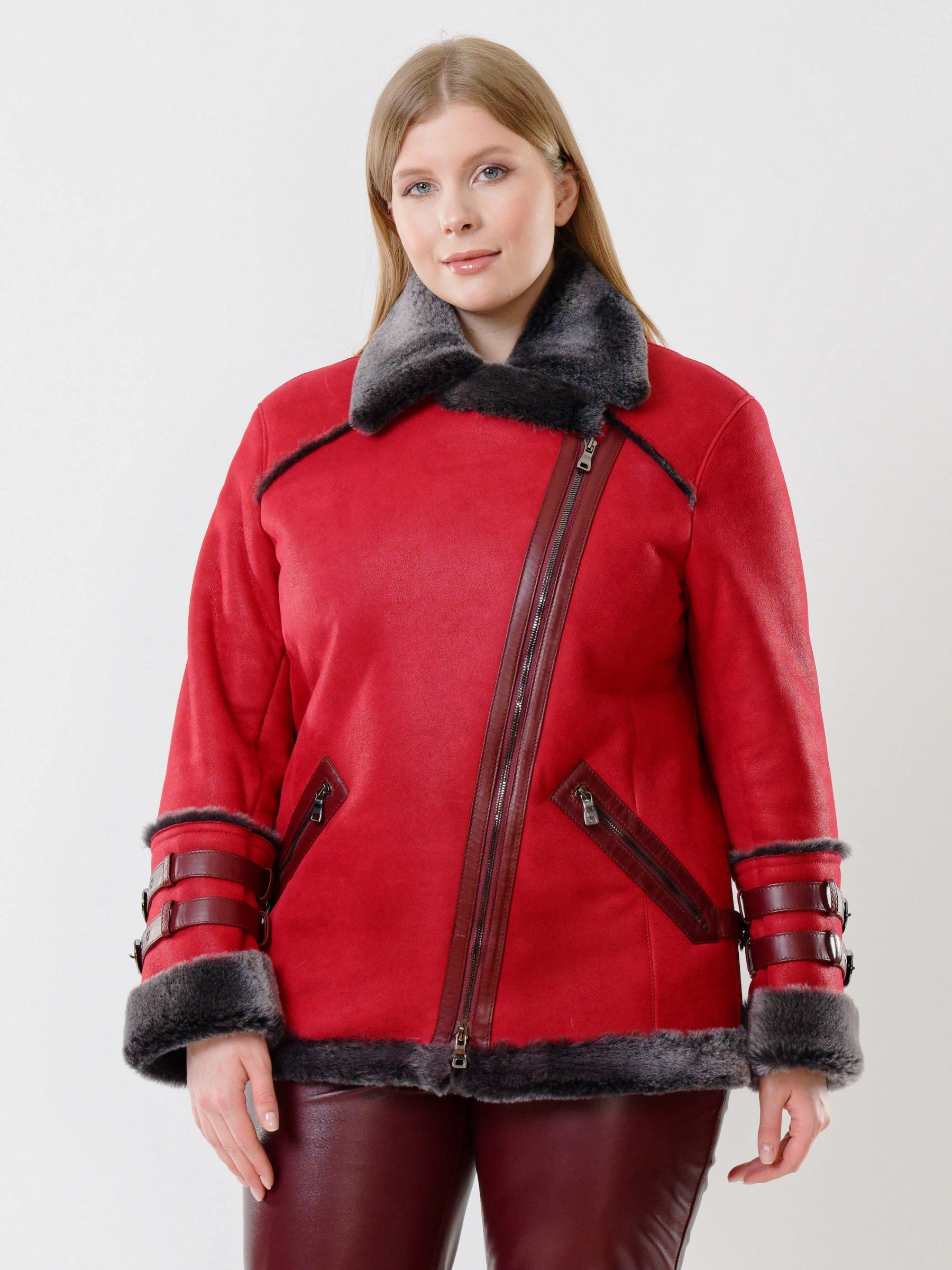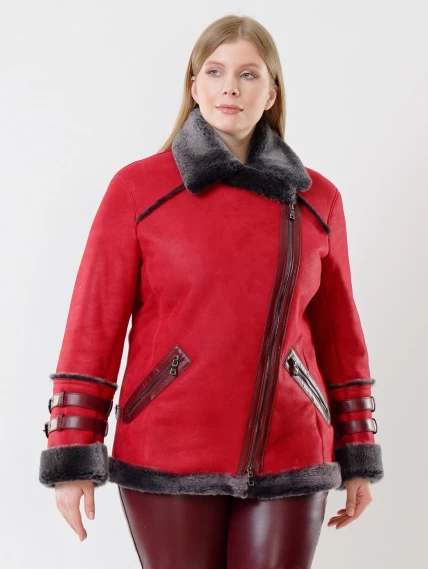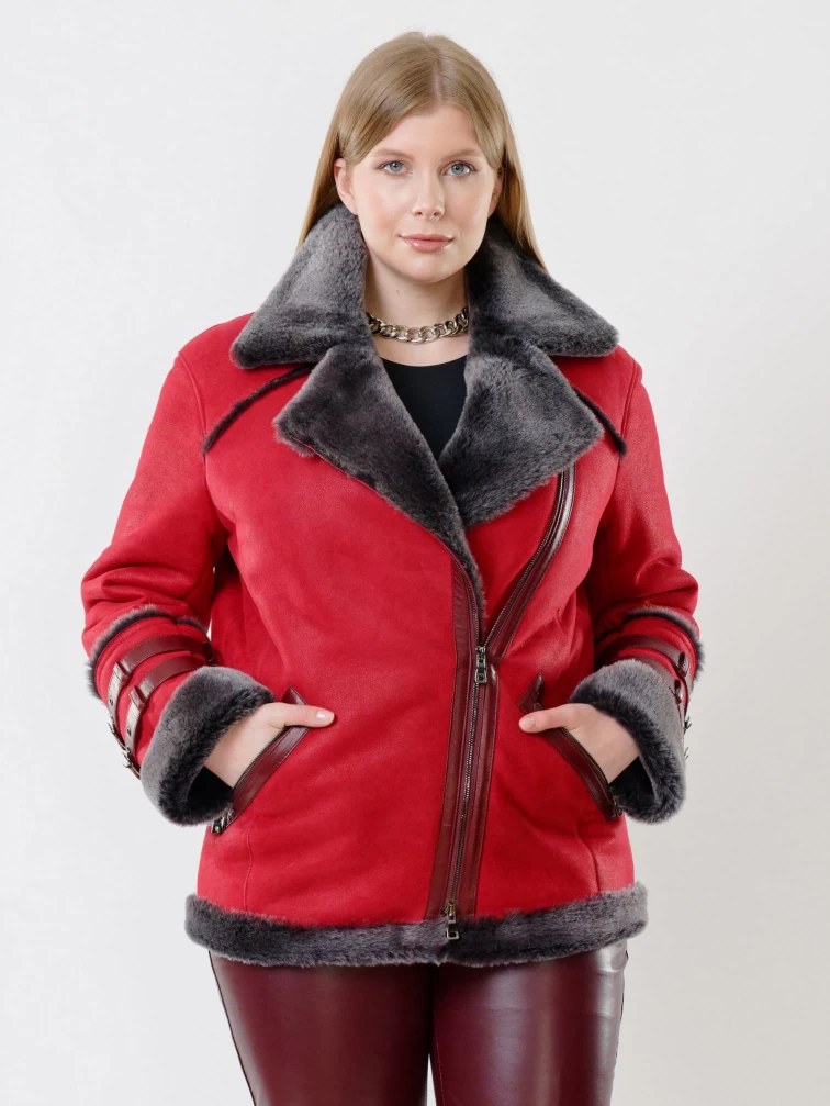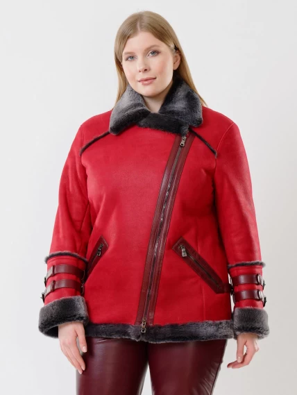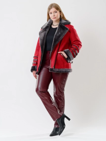 Товар женская короткая дубленка косуха из керли 290, красная, размер 44, артикул 61141 выполнен из овчина "мерино" с застежкой молния. Рассчитан на сезон: осень-зима. Длина изделия 70 см, силуэт прямой.