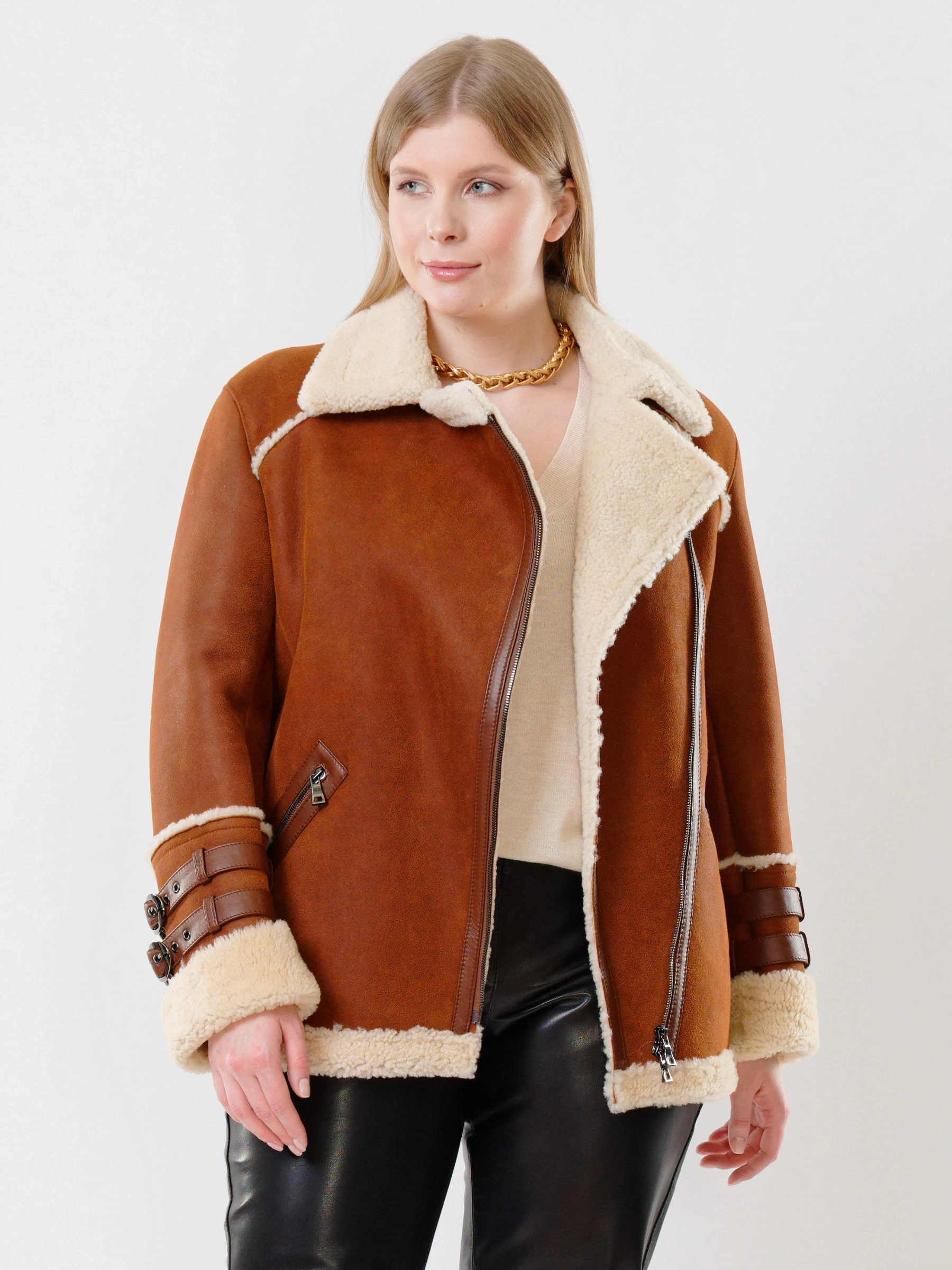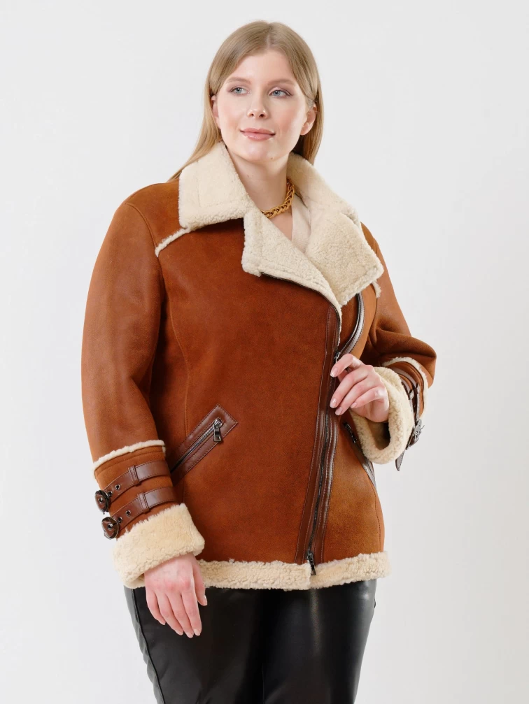 Женская короткая дубленка-косуха из теплой натуральной овчины «керли» подарит брутальный шарм и защитит от холода! Свободный силуэт спортивного кроя обеспечивает комфорт и свободу движений, а густой шелковистый мех согреет в мороз. Застежка-молния, английский воротник с лацканами, регулируемые манжеты и кожаные паты на рукавах и по бокам создают непокорный дух. Практичные врезные карманы на молниях дополняют образ. Сочетайте её с кожаными штанами и худи или объемным свитером для дерзкого повседневного образа.