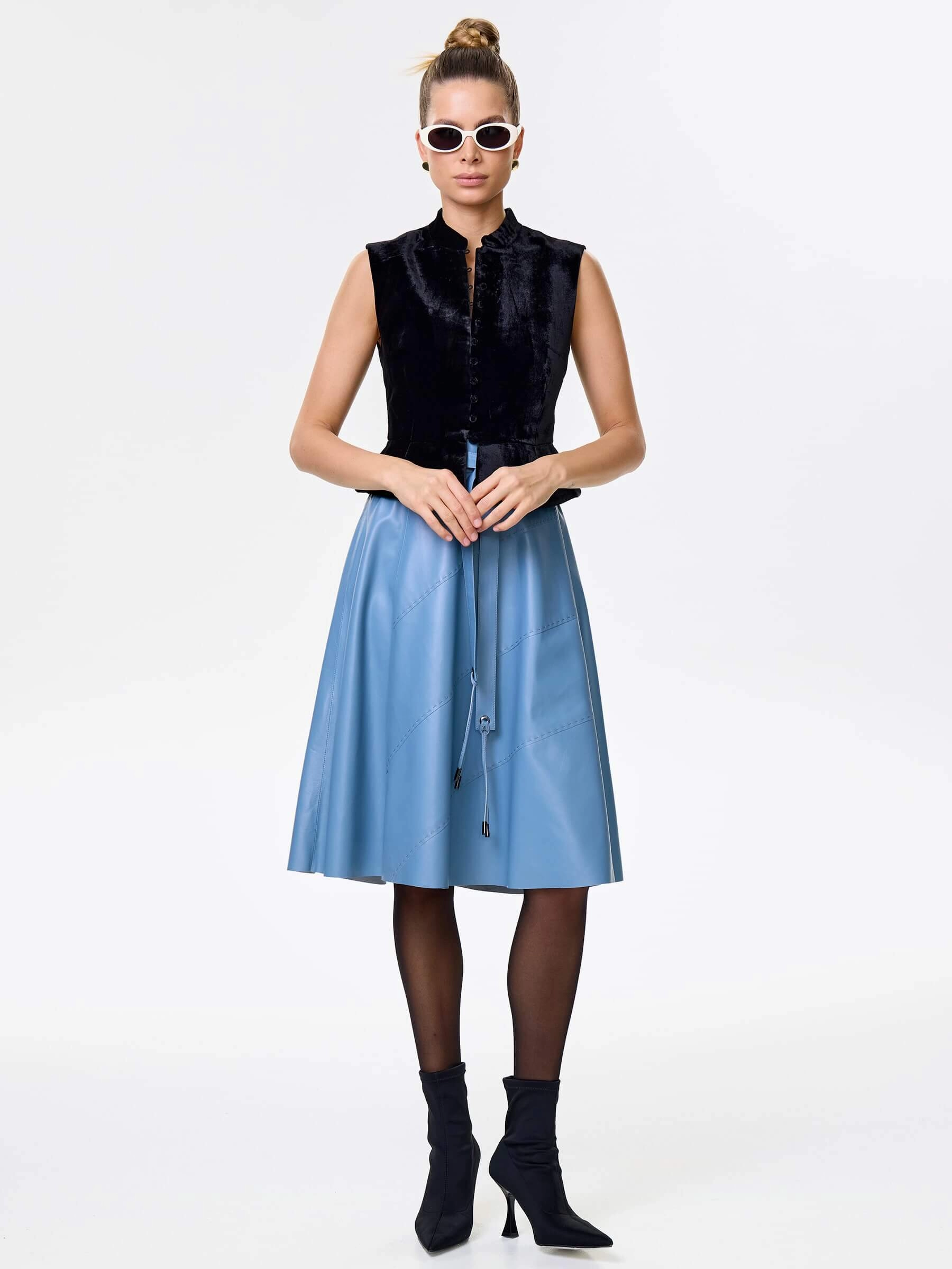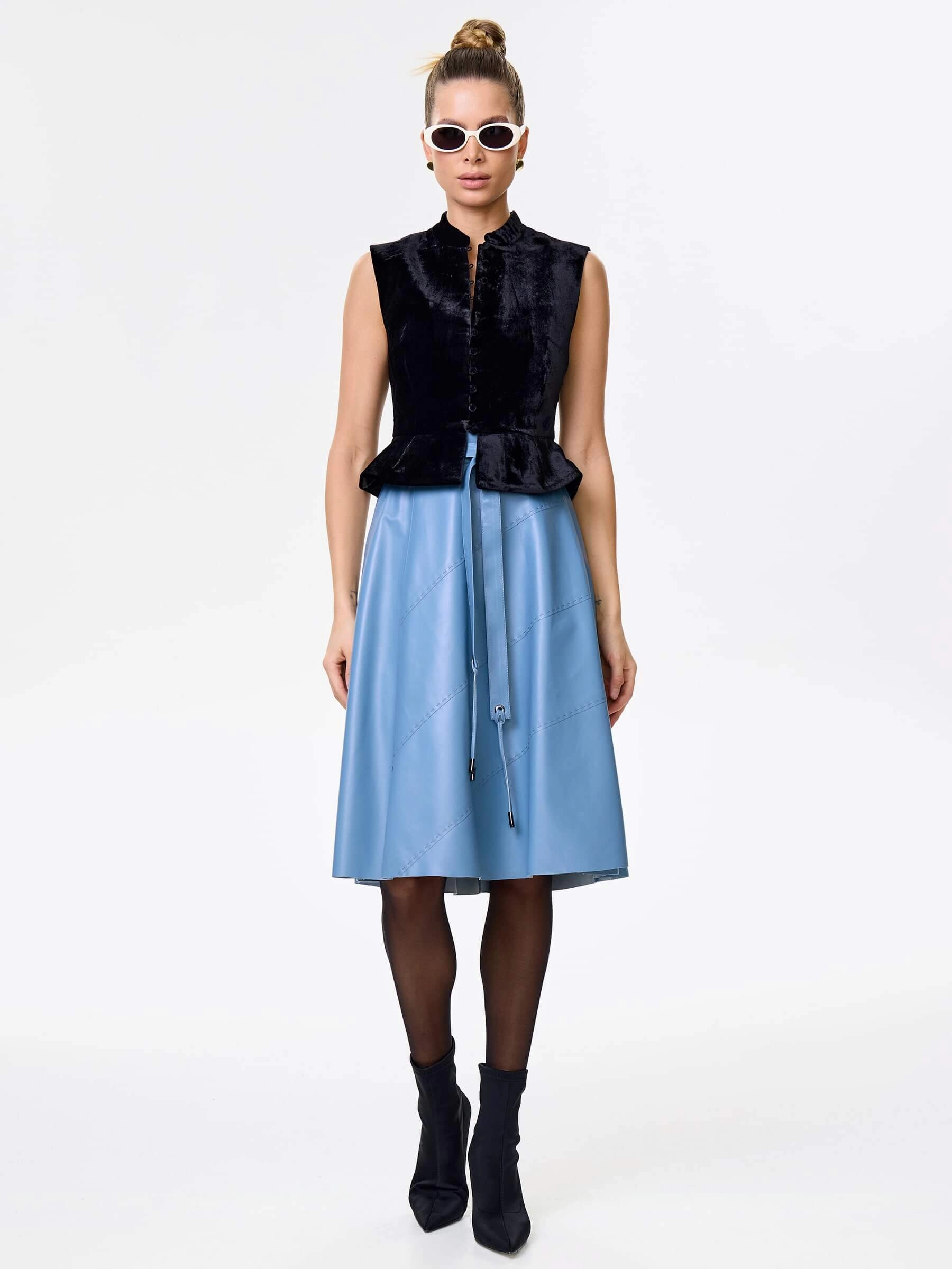 Товар голубая кожаная юбка 01рс, размер 46, артикул 85452 выполнен из натуральной кожи с застежкой молния. Рассчитан на сезон: демисезон. Длина изделия 70 см, силуэт расклешенный.