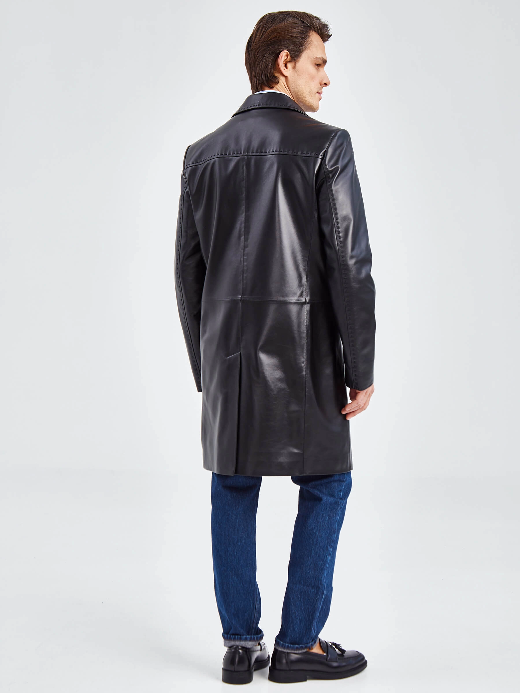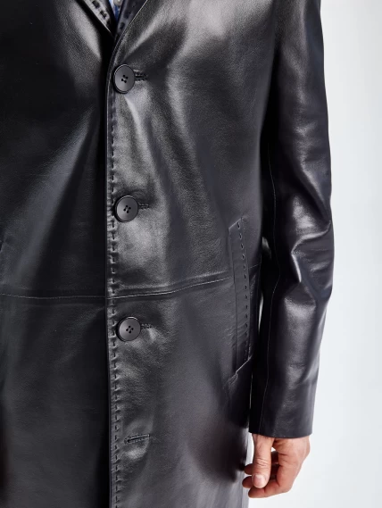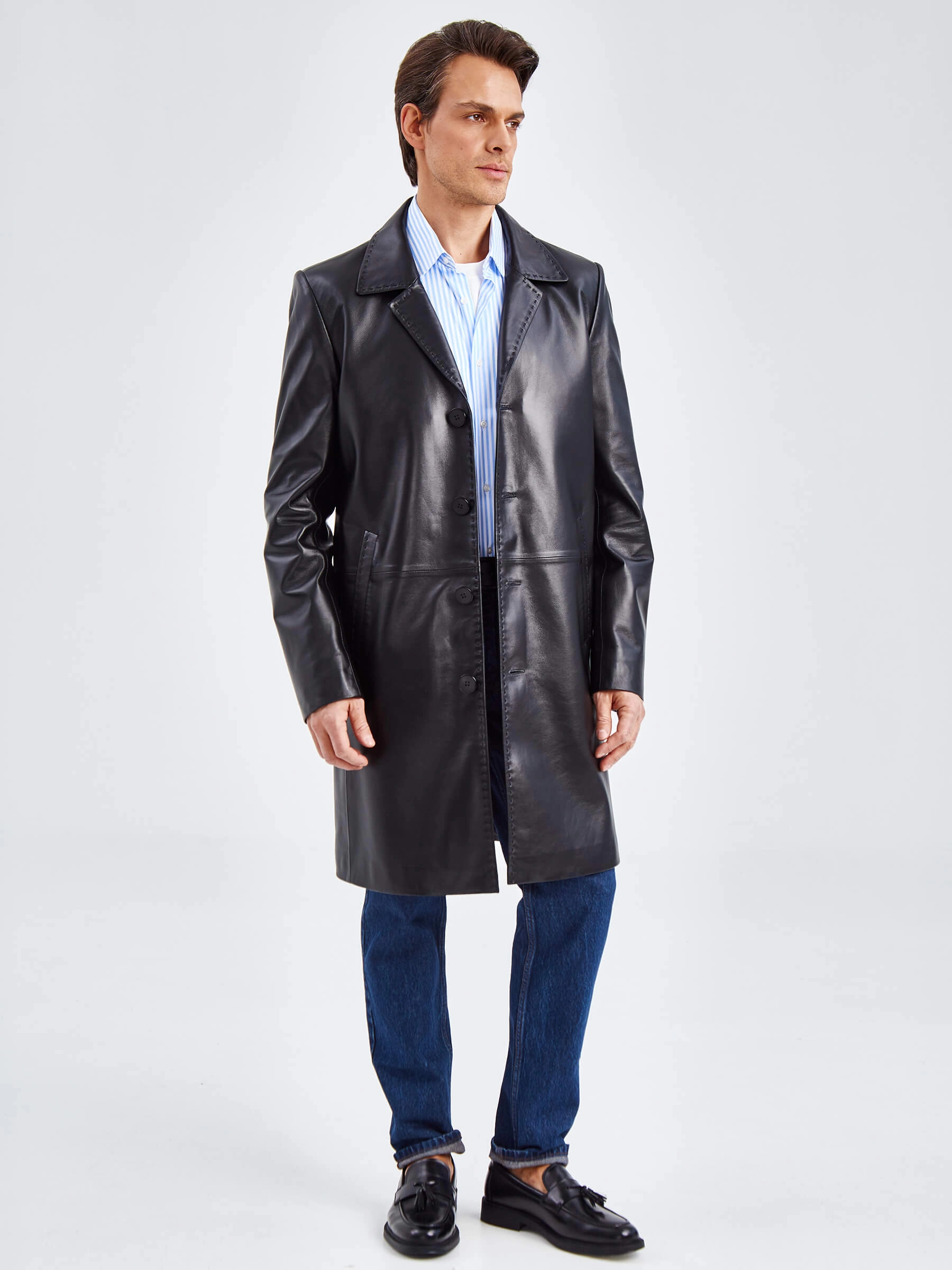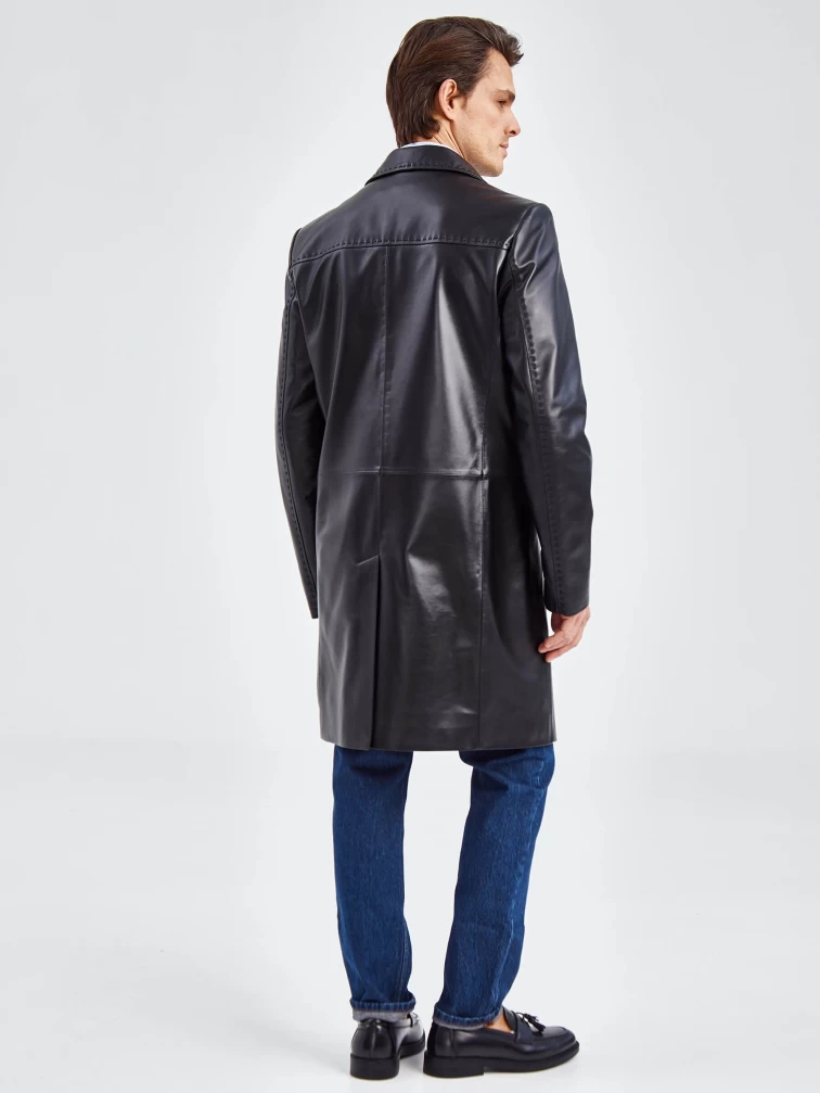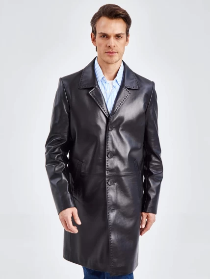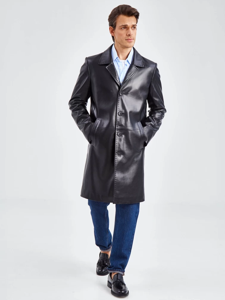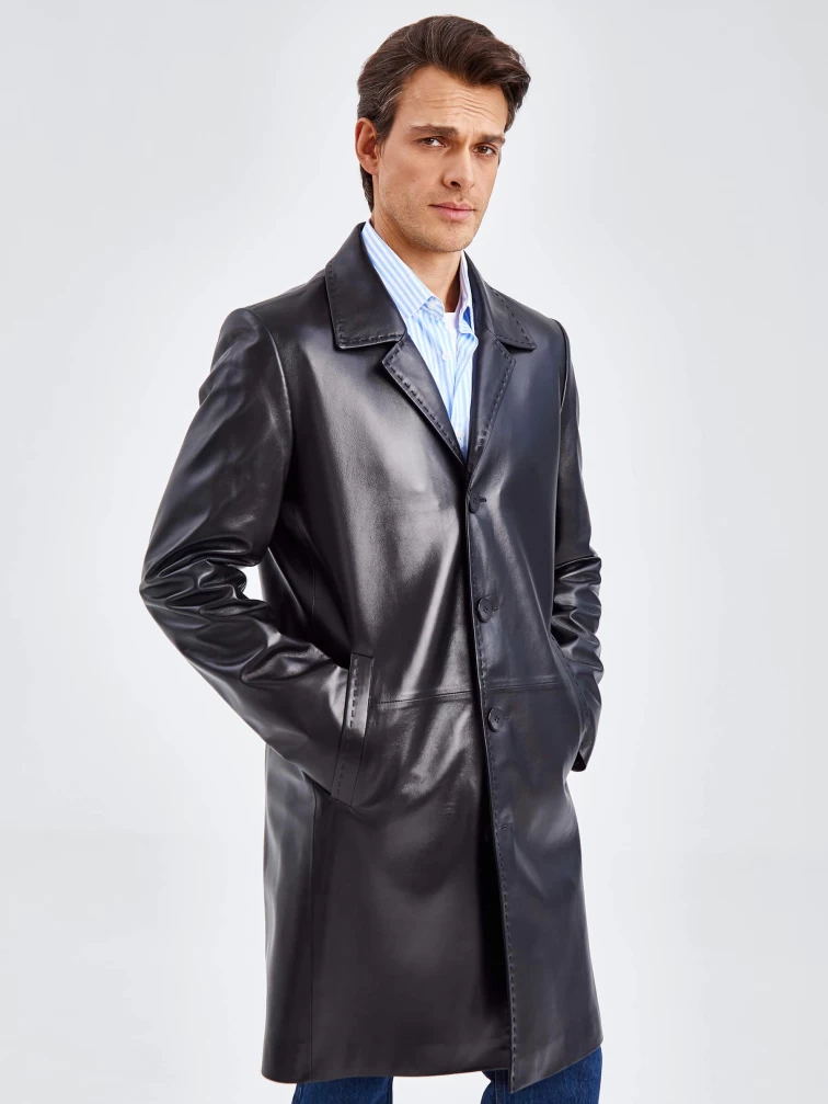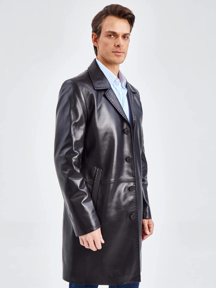 Товар классическое кожаное пальто мужское премиум класса 2010-11, черное, размер 52, артикул 71360 выполнен из натуральной кожи с застежкой пуговицы. Рассчитан на сезон: весна-лето. Длина изделия 98 см, силуэт полуприлегающий.