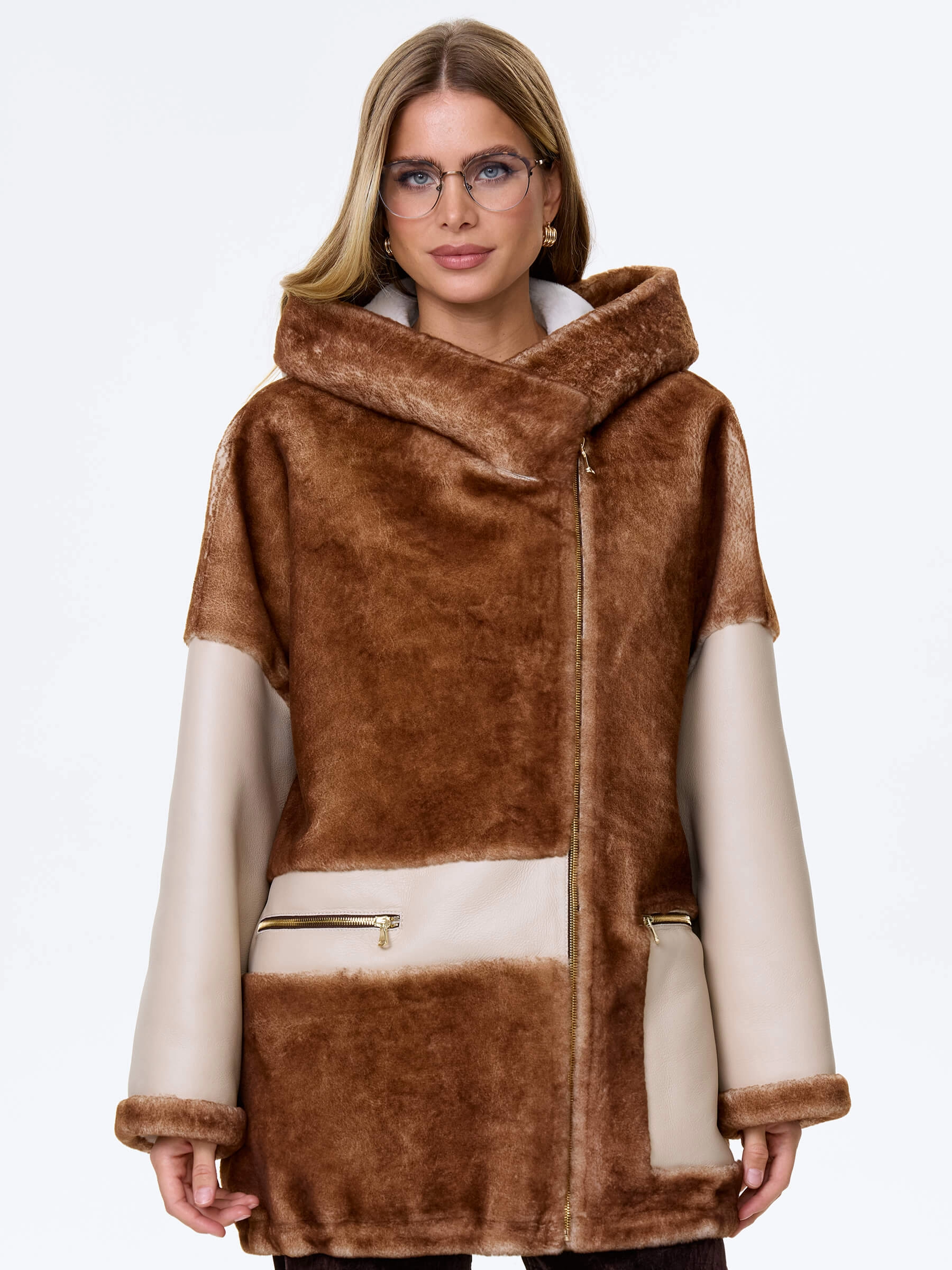 Товар комбинированная женская дубленка с капюшоном из астрагана премиум класса 2058, бежевая, размер 52, артикул 64140 выполнен из овчина "мерино" с застежкой молния. Рассчитан на сезон: осень-зима. Длина изделия 77 см, силуэт свободный.
