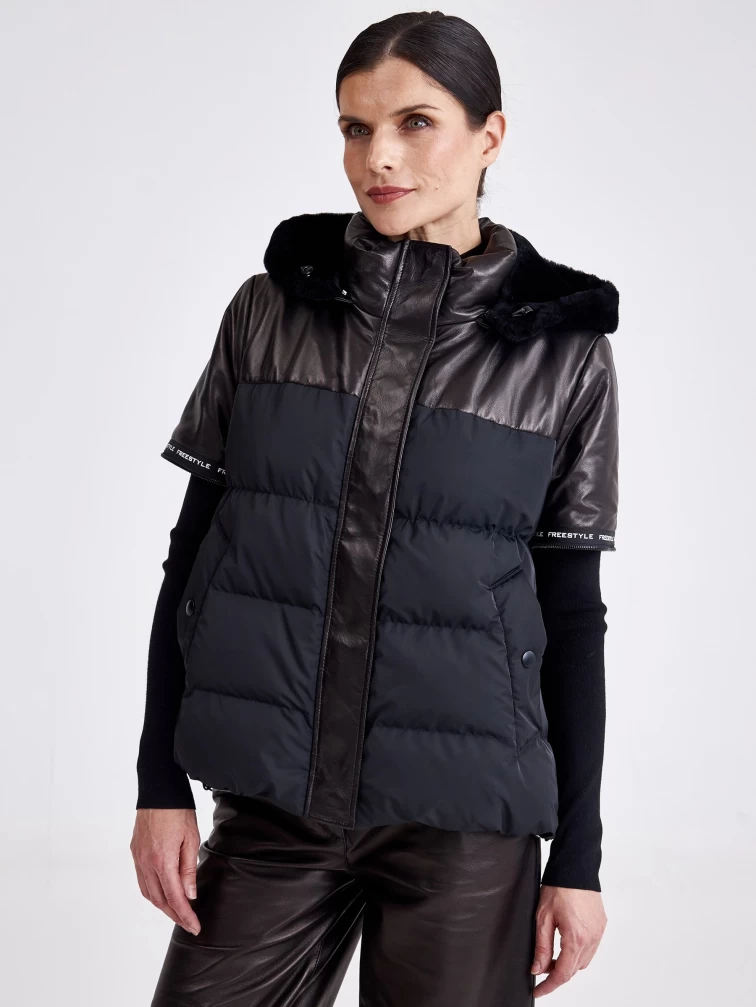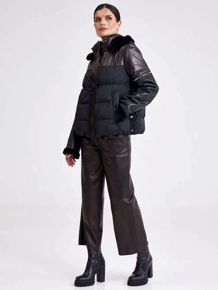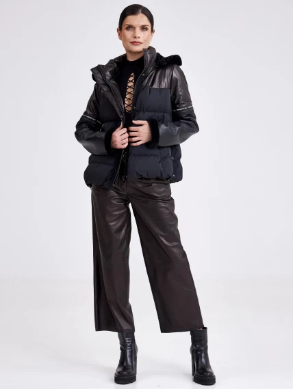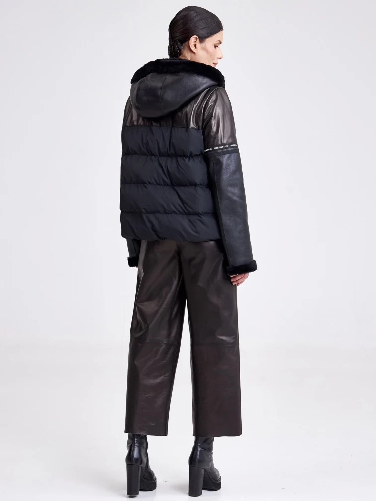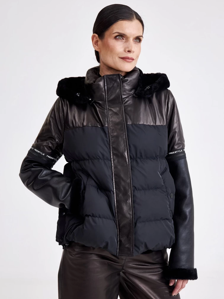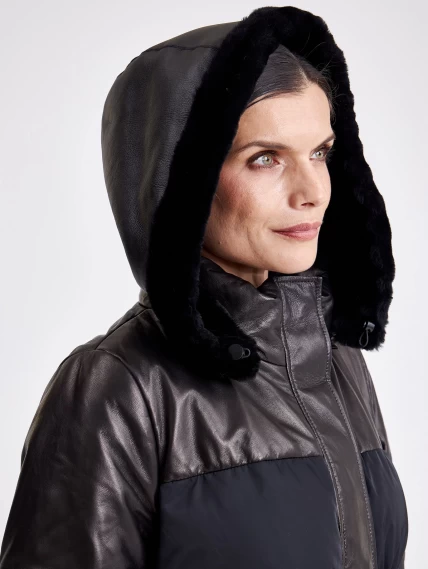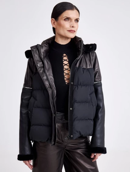 Комбинированная женская кожаная куртка с капюшоном 3030, черная, размер 44, артикул 23360