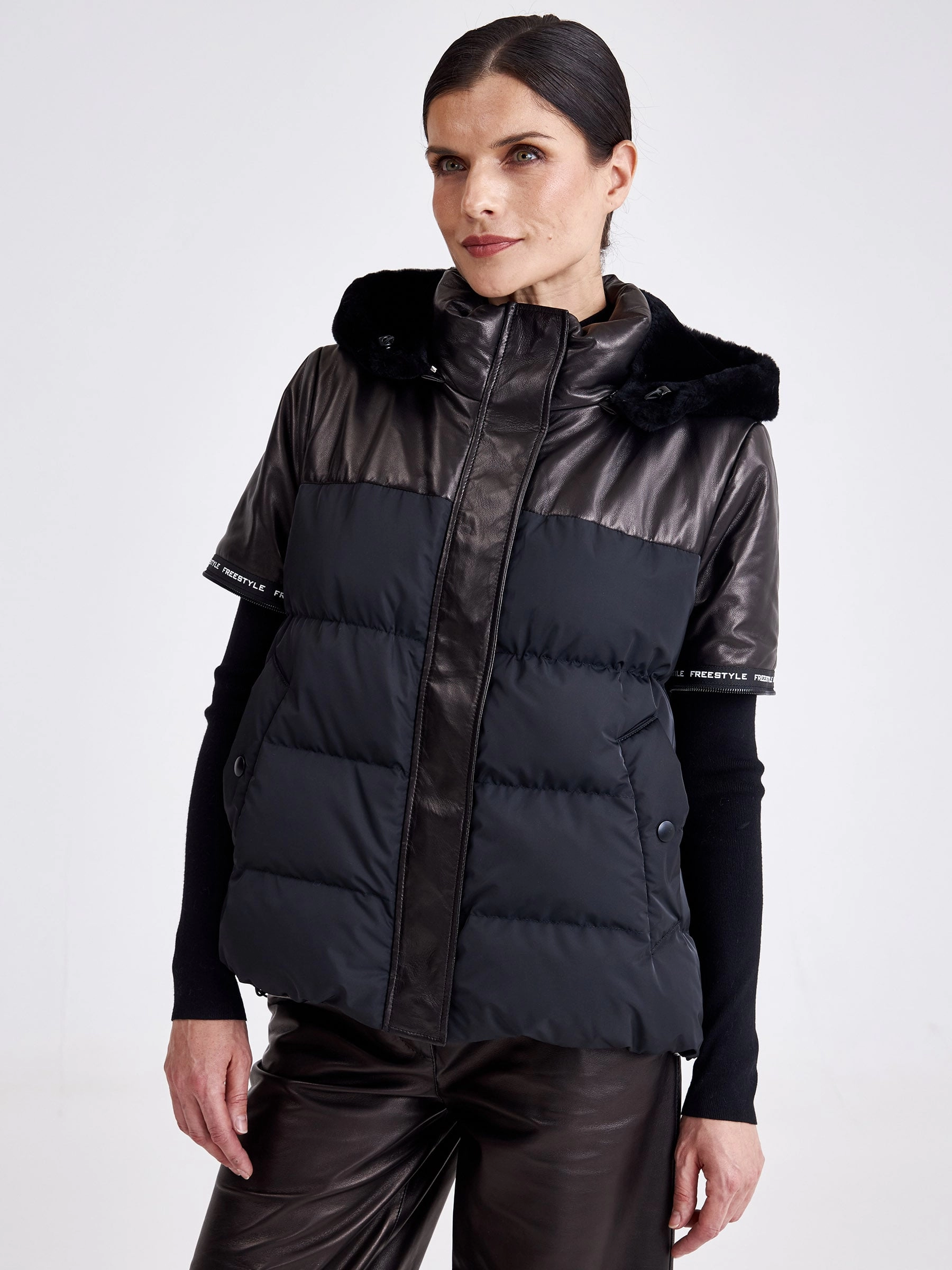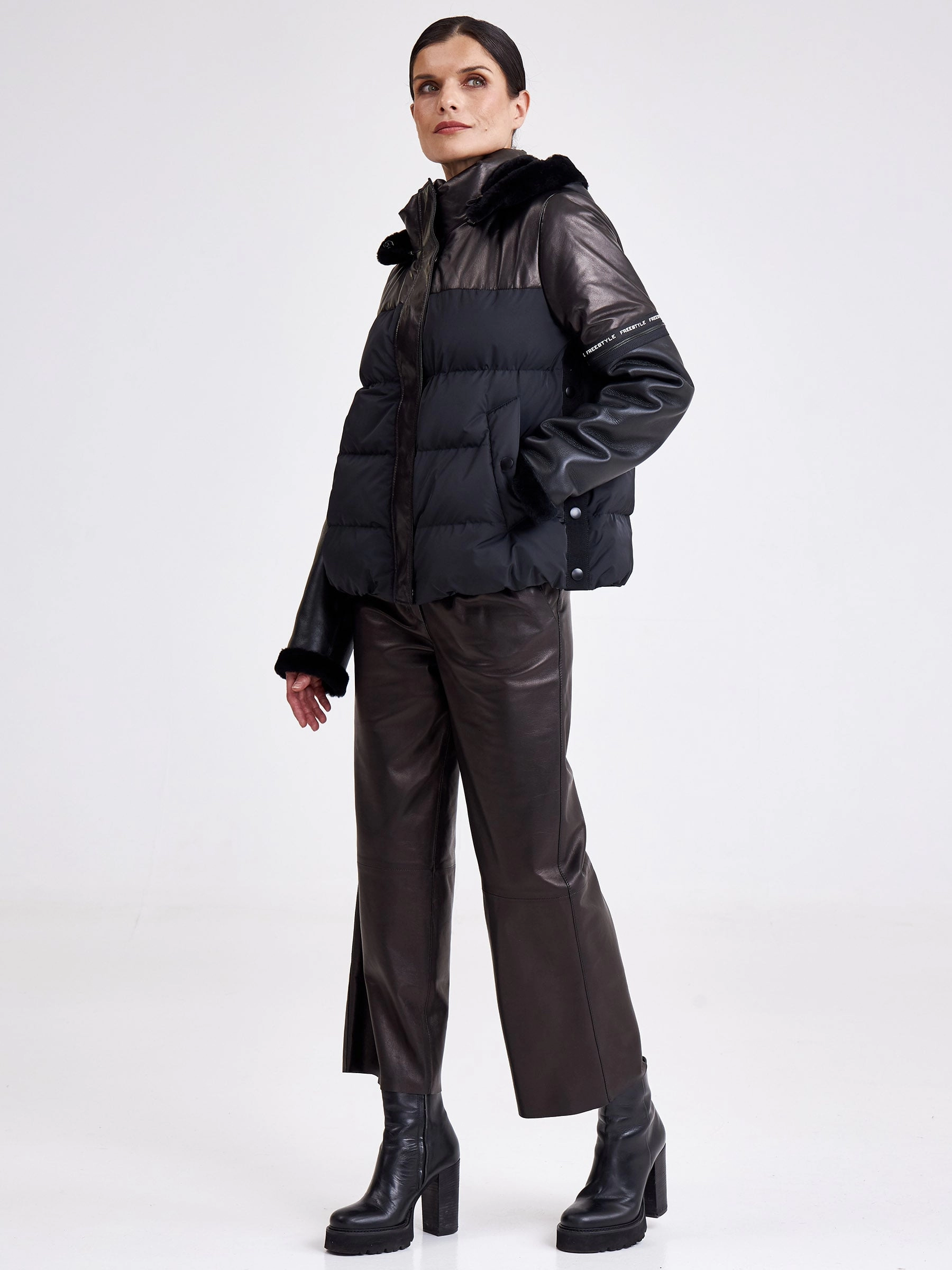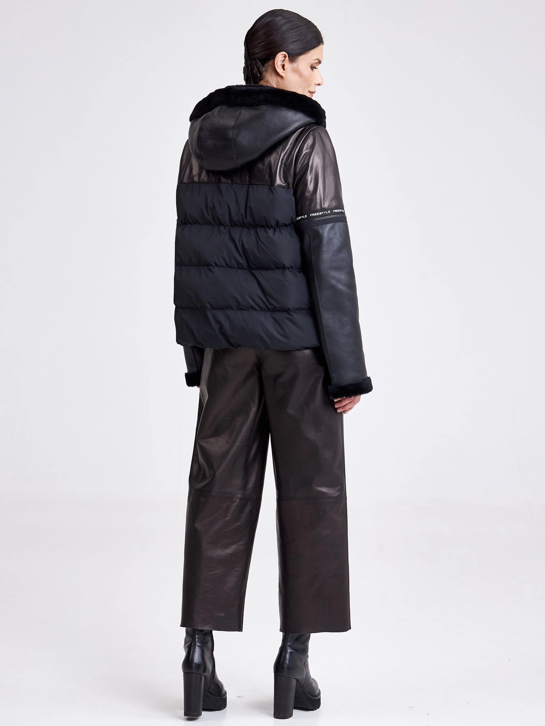 Черный короткая куртка сшита из натуральной кожи в комбинации с плотно водоотталкивающим материалом. Отстегивающие рукава. За дополнительный комфорт отвечает – глубокий съемный капюшон. Модель дополнили боковыми разрезами застегиющиеся на кнопки. Куртка с немецким утеплителем- синтепон Френденберг - это отличная теплоизоляция, превосходная парапроницаемость.