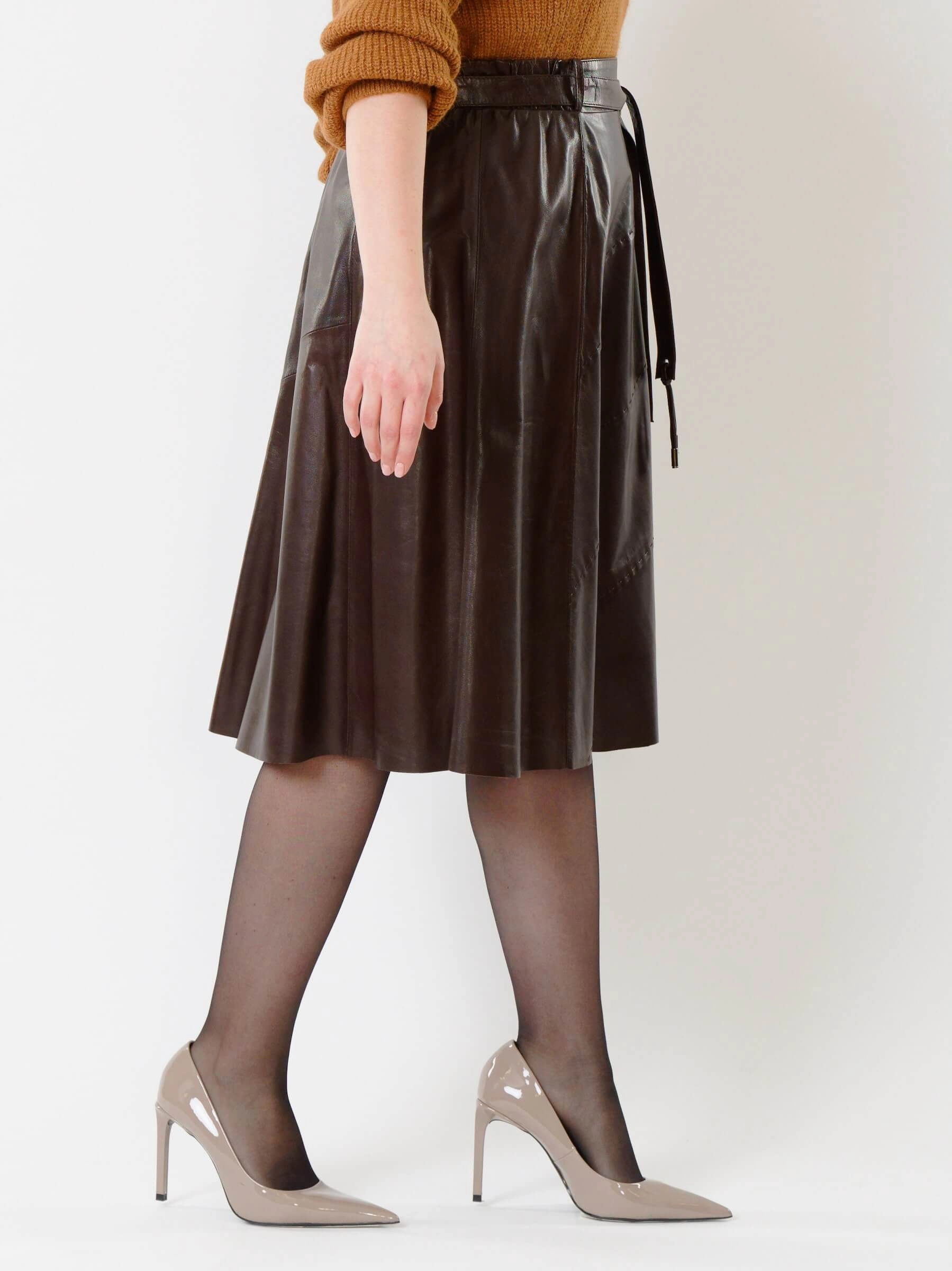 Товар коричневая кожаная юбка 01рс, размер 40, артикул 85132 выполнен из натуральной кожи с застежкой молния. Рассчитан на сезон: демисезон. Длина изделия 70 см, силуэт расклешенный.