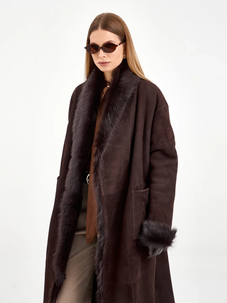 Товар коричневая женская дубленка из тосканы 2020, коричневая, размер 42, артикул 65090 выполнен из тосканская овчина с застежкой без застежки. Рассчитан на сезон: зима. Длина изделия 128 см, силуэт свободный.