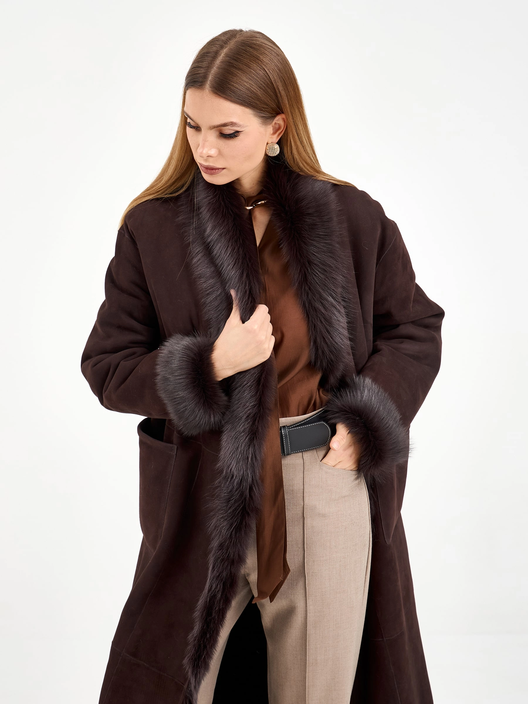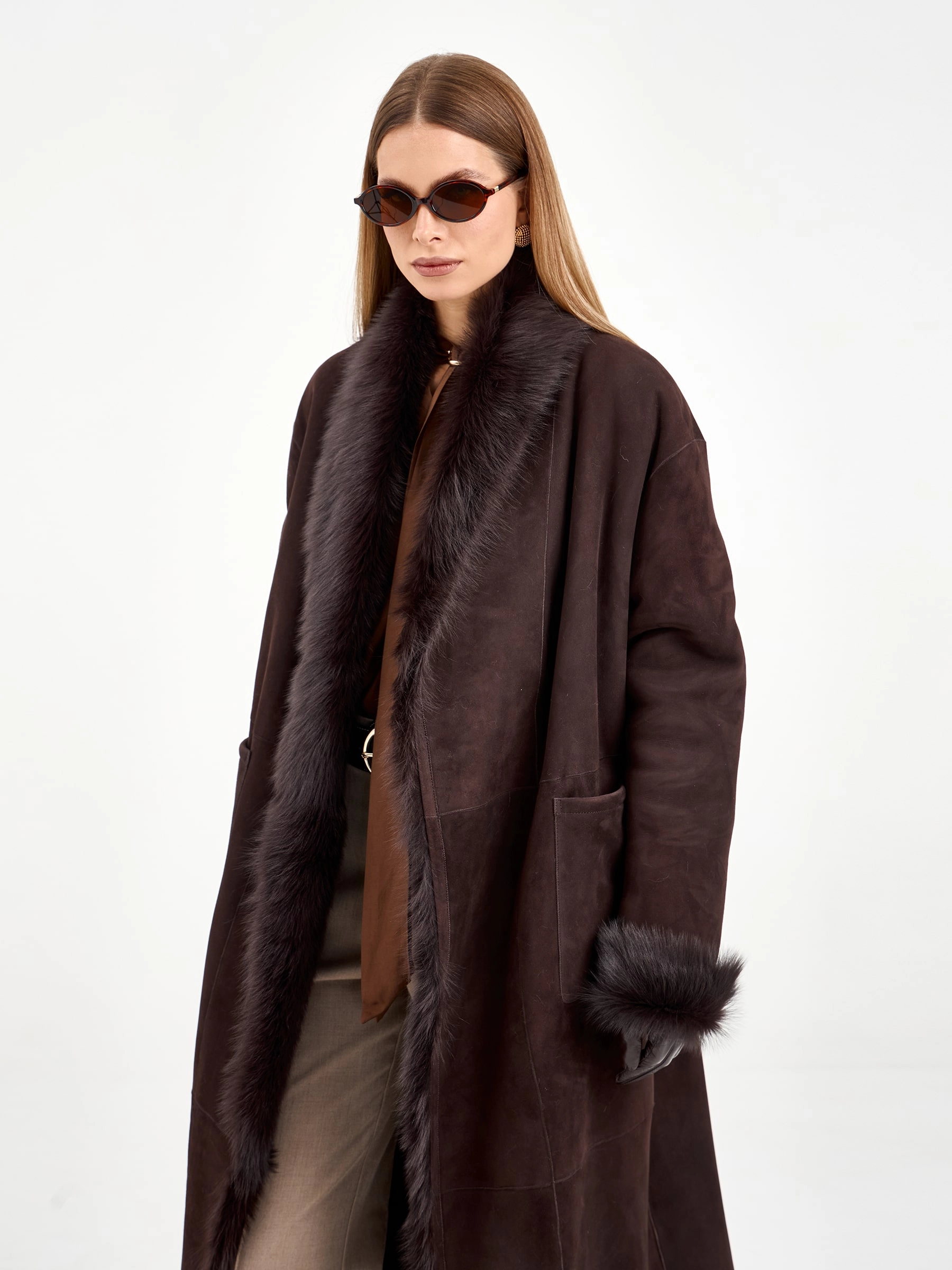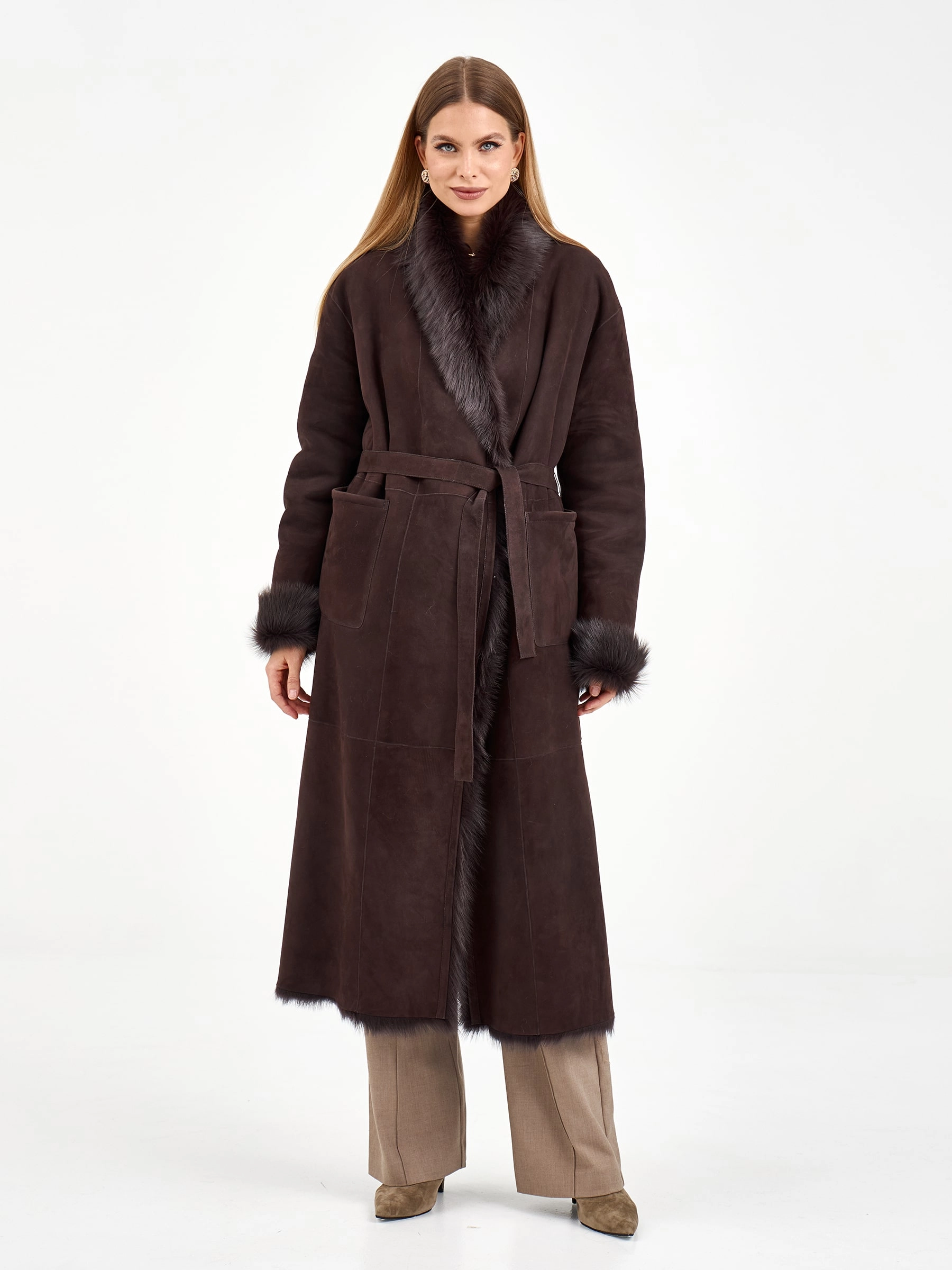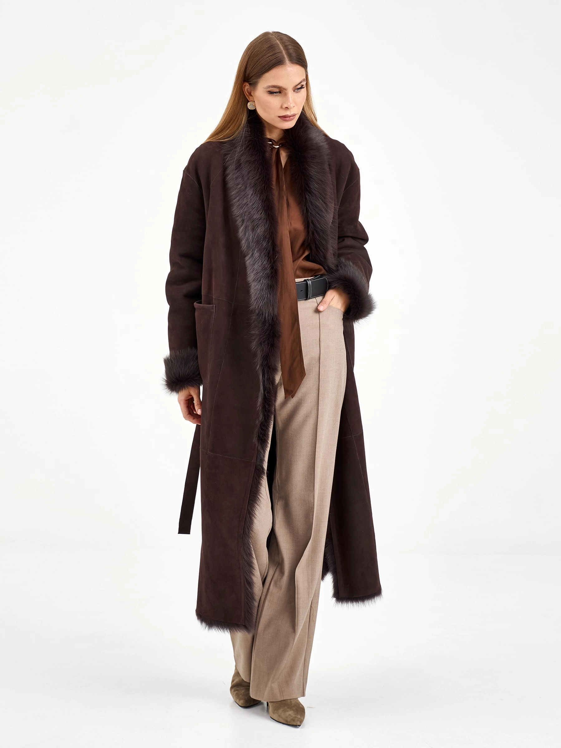 Эта длинная дубленка из натуральной овчины без капюшона воплощает современную классику. Свободный силуэт и запах, фиксируемый поясом, дарят комфорт и универсальность. Благодаря роскошной тосканской овчине и шалевидному воротнику модель выглядит по-настоящему дорого. Для создания законченного образа наденьте ее с водолазкой, кожаными брюками и уггами — это идеальный ансамбль для города в холодные дни.