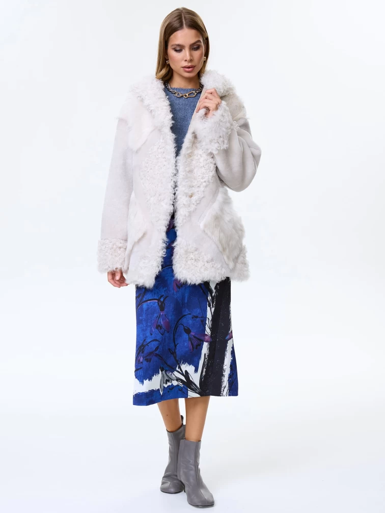 Товар короткая комбинированная женская дубленка с мехом тиградо премиум класса 2027, белая, размер 44, артикул 64190 выполнен из овчина "мерино" с застежкой кнопки. Рассчитан на сезон: осень-зима. Длина изделия 73 см, силуэт свободный.