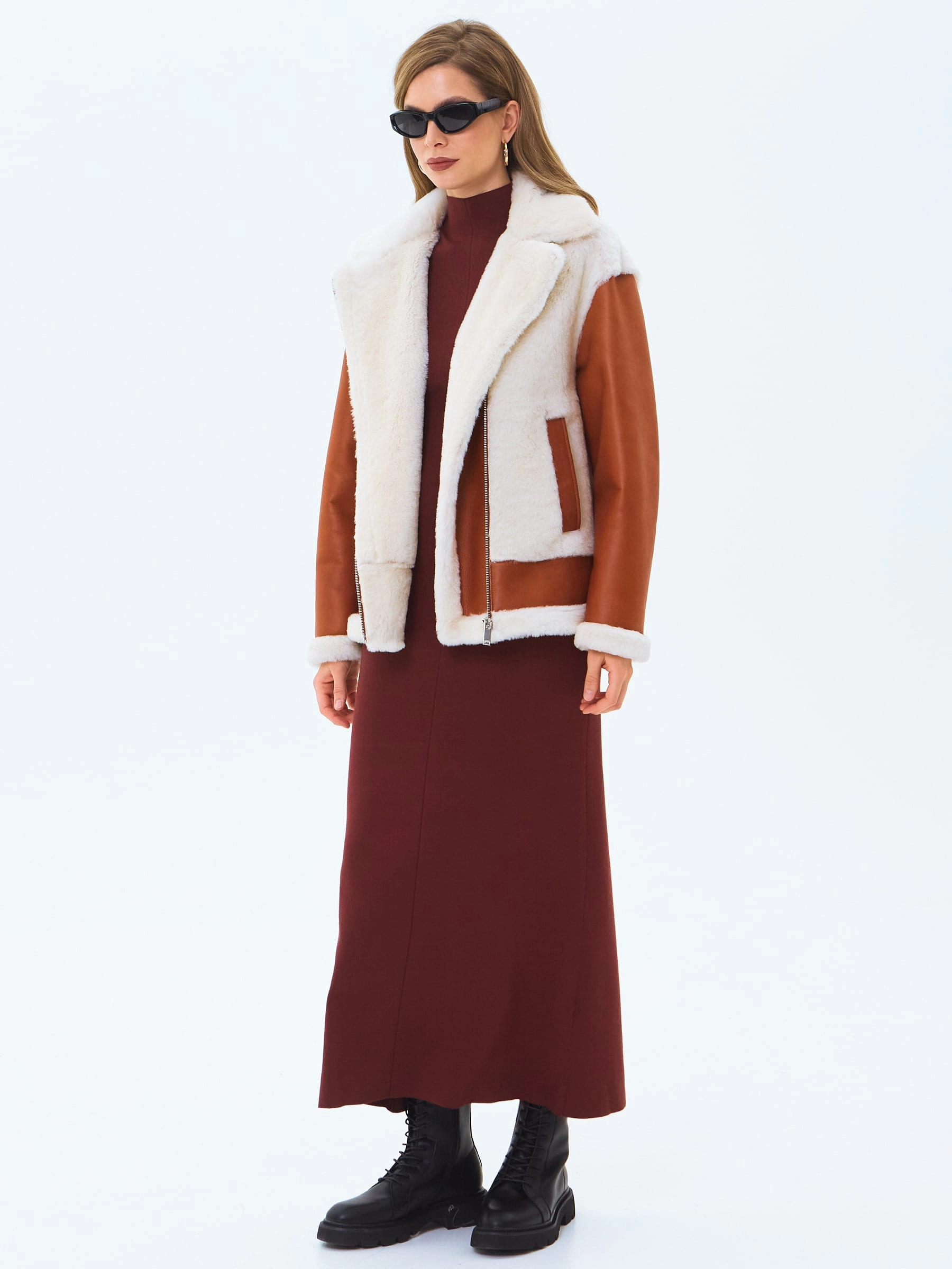 Укороченную дубленку-косуху выполнили из натуральной овчины мерино, сочетая детали с гладкой и меховой поверхностью. Модель свободного кроя с отложным воротником и широкими лацканами хорошо удерживает тепло в холодную погоду,надежно защитит от ветра. Изделие дополнили двумя врезными карманами и застежкой в виде крупной молнии.