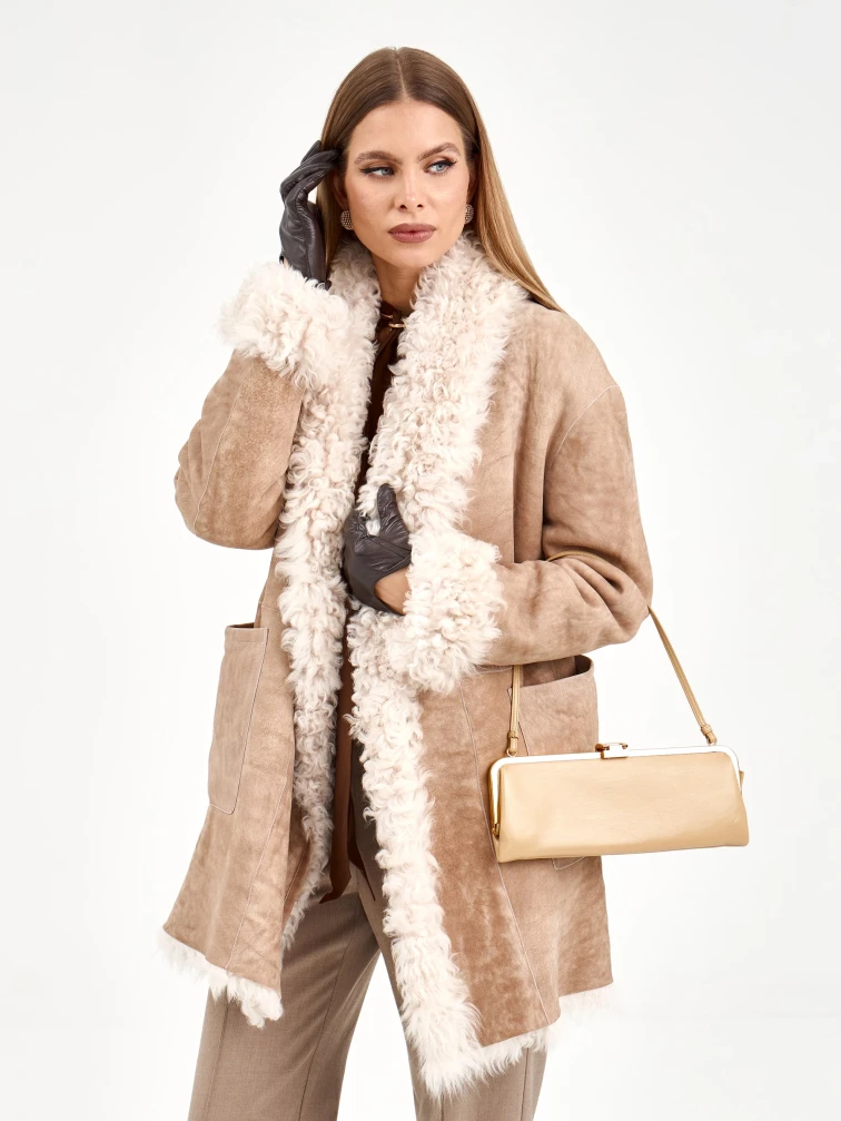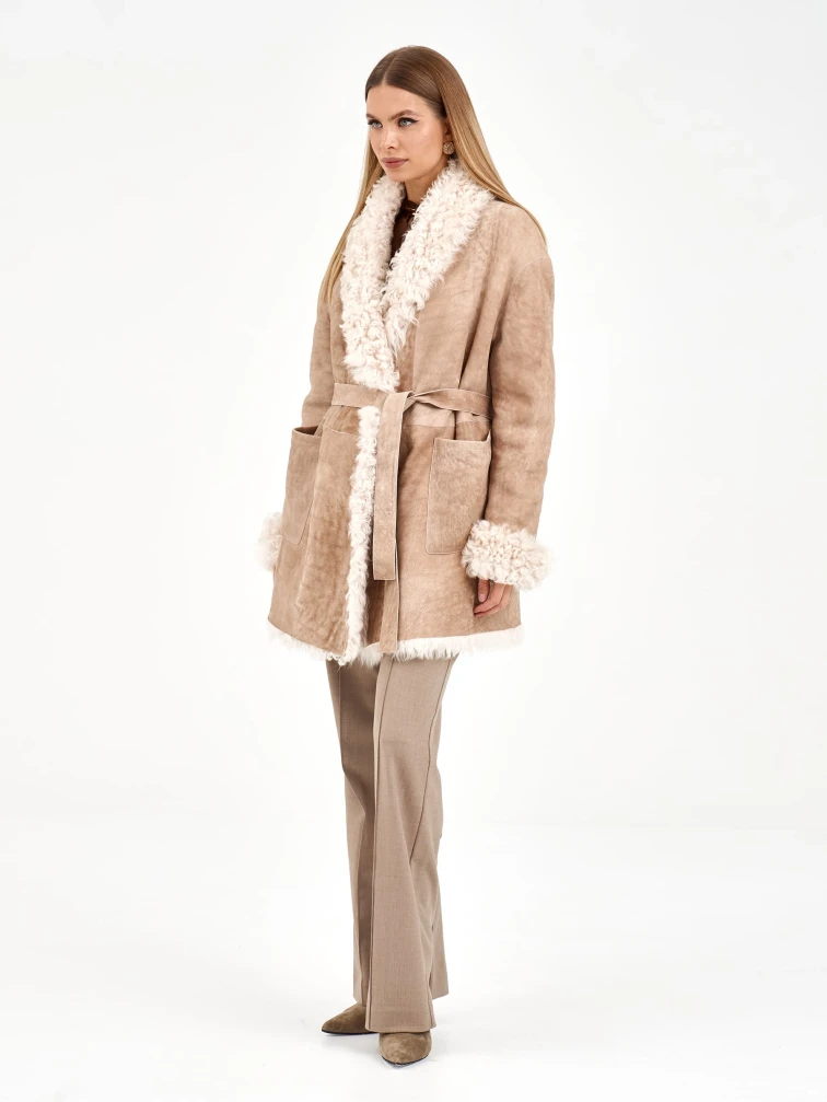 Товар короткая женская дубленка из тиградо 2078, бежевая, размер 44, артикул 65270. Длина изделия 80 см.