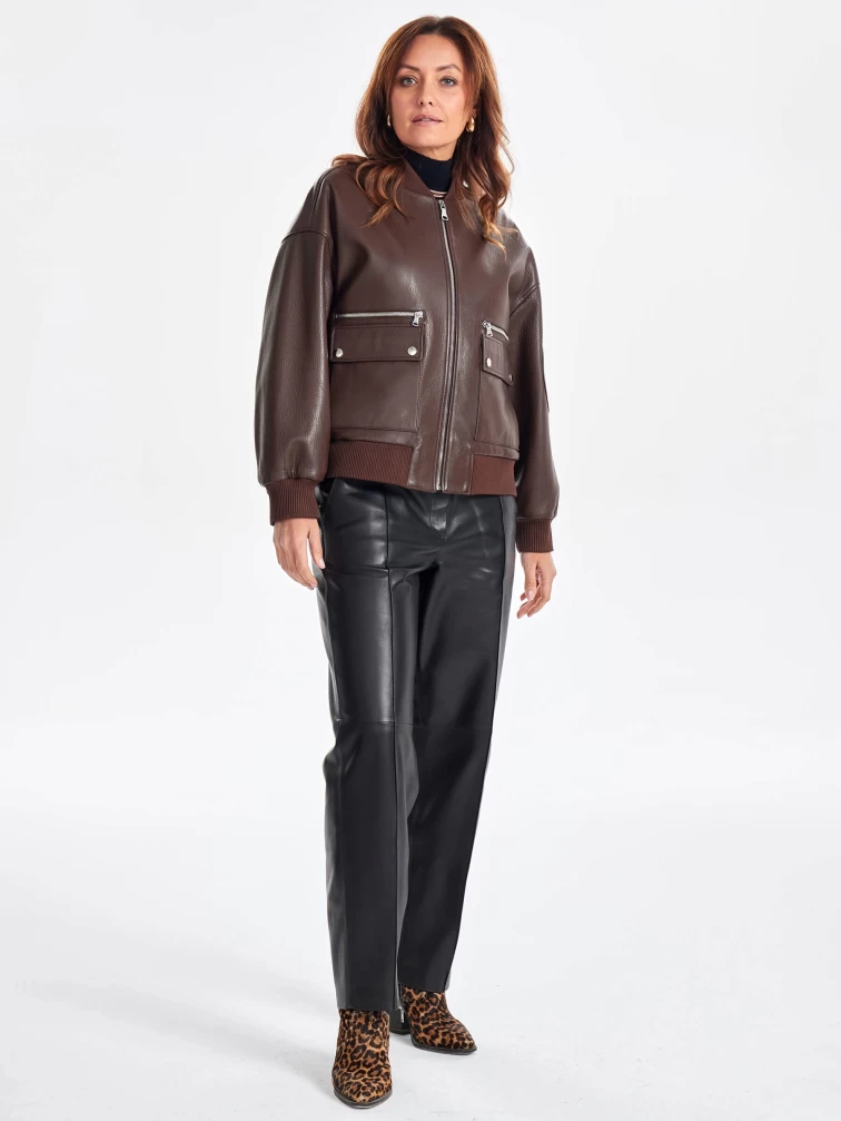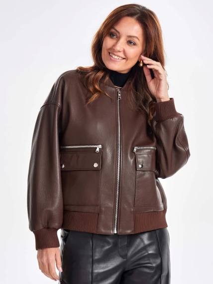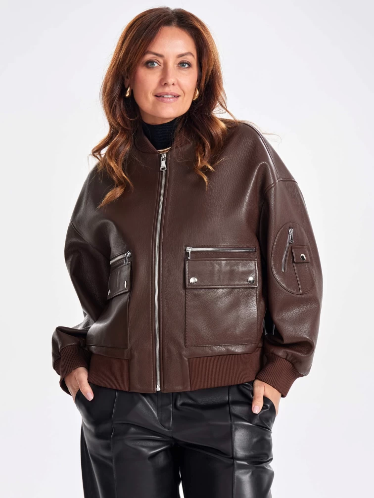 Короткая женская кожаная куртка бомбер премиум класса 3064, коричневая, размер 46, артикул 23760