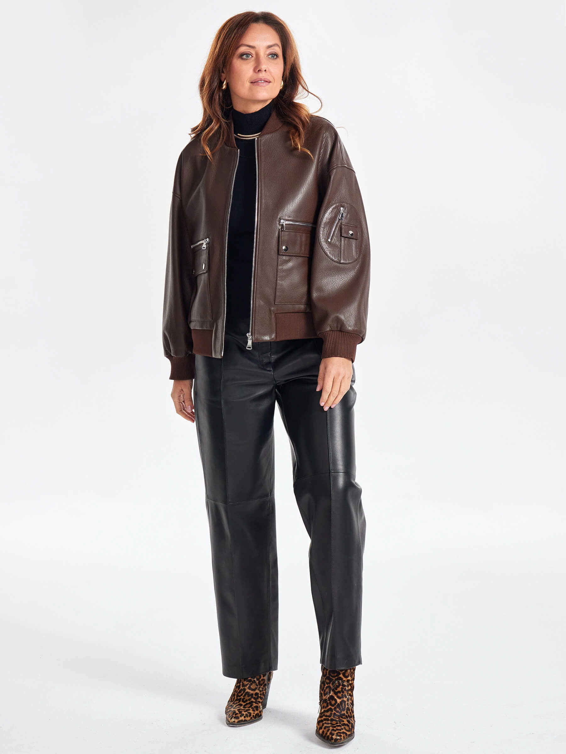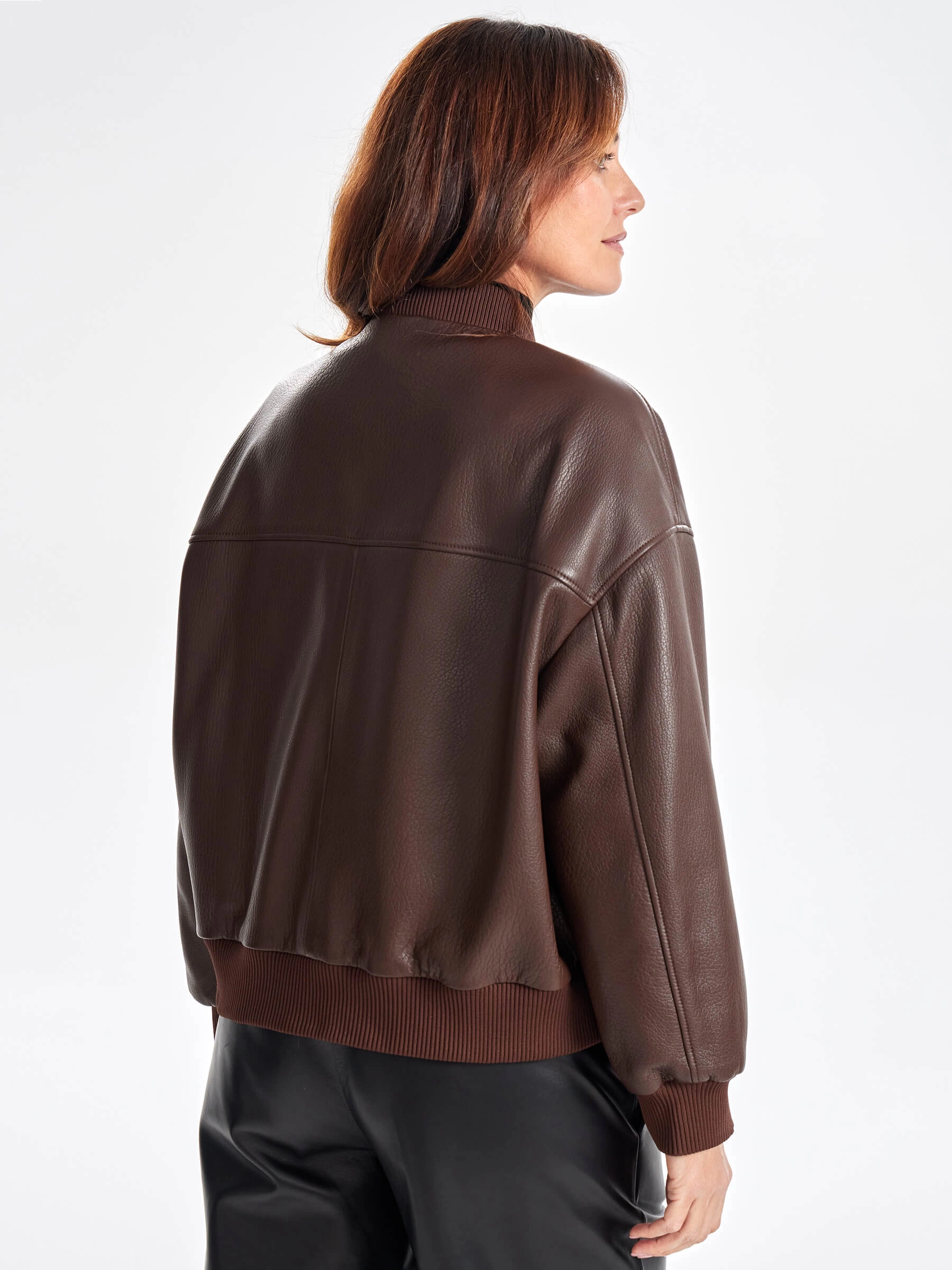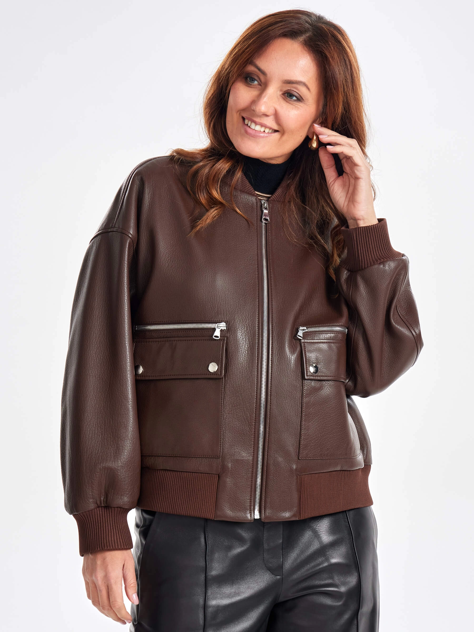 Товар короткая женская кожаная куртка бомбер премиум класса 3064, коричневая, размер 46, артикул 23760 выполнен из натуральной кожи с застежкой молния. Рассчитан на сезон: весна-осень. Длина изделия 60 см, силуэт свободный.