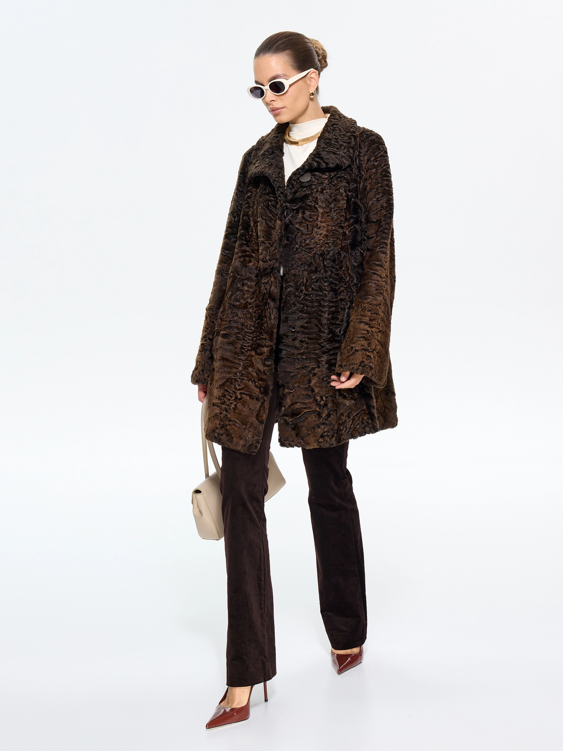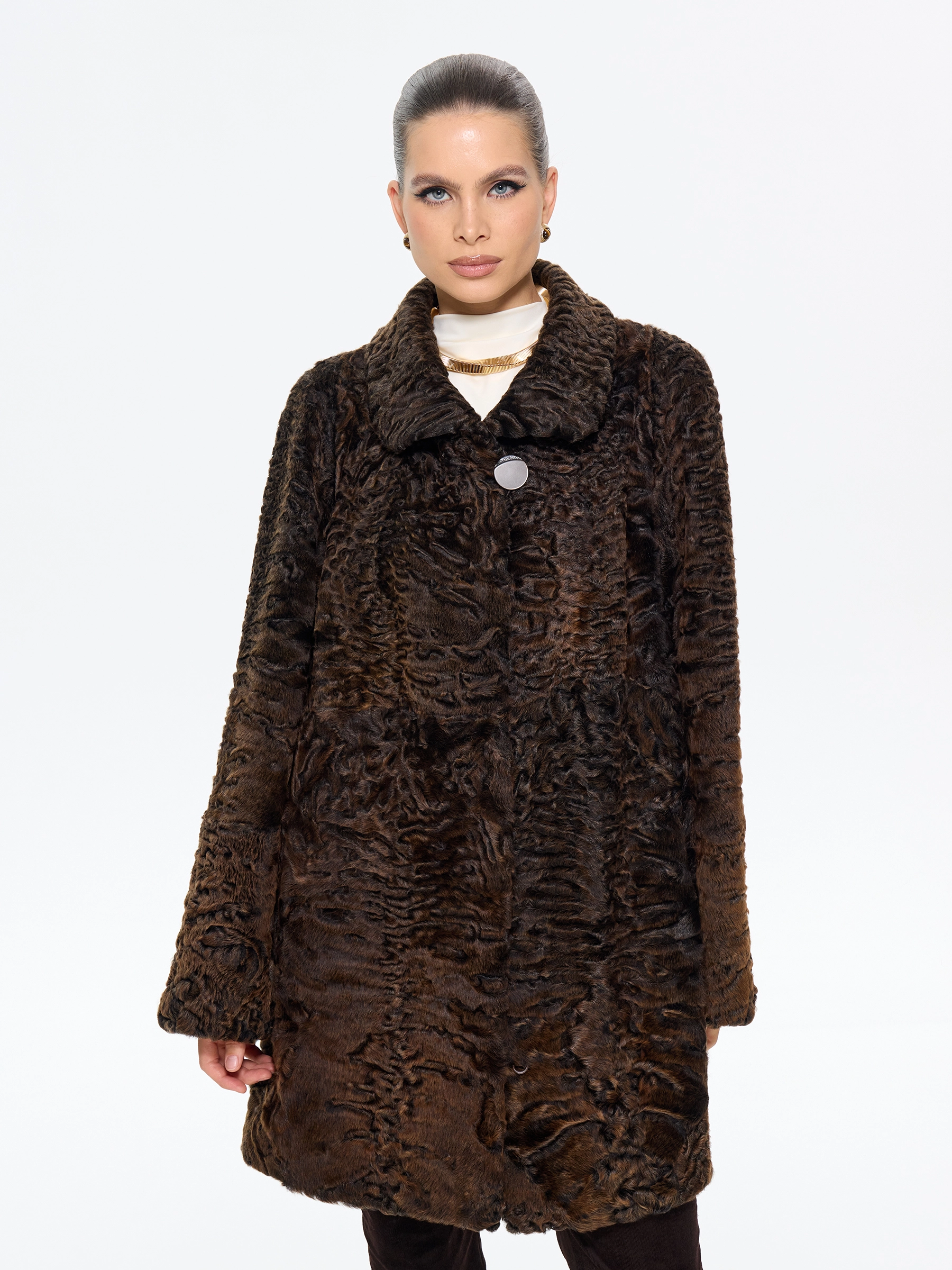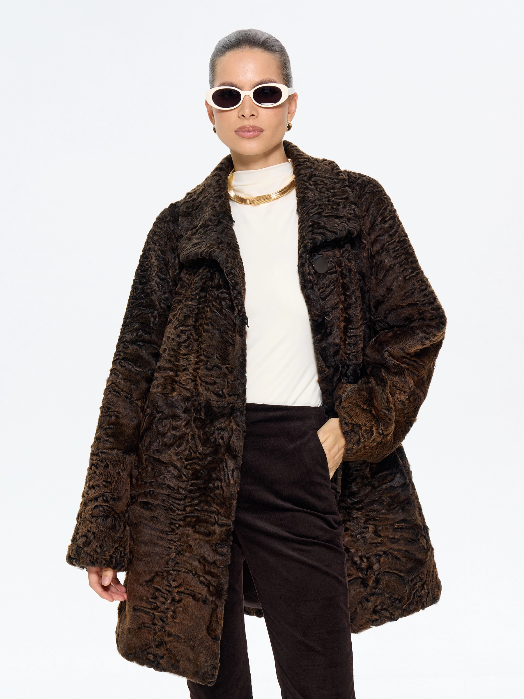 Коричневая шуба из меха каракульчи премиум-класса с элегантным воротником апаш. Модель в форме легкой трапеции длиной 80 см с втачными рукавами и застежкой-клипсами создает утонченный силуэт. Стилисты рекомендуют носить с кожаными сапогами и объемной сумкой для повседневного образа или с плиссированной юбкой и шелковым платком для элегантного выхода. Идеальное сочетание классики, комфорта и неповторимого шарма в каждой детали.