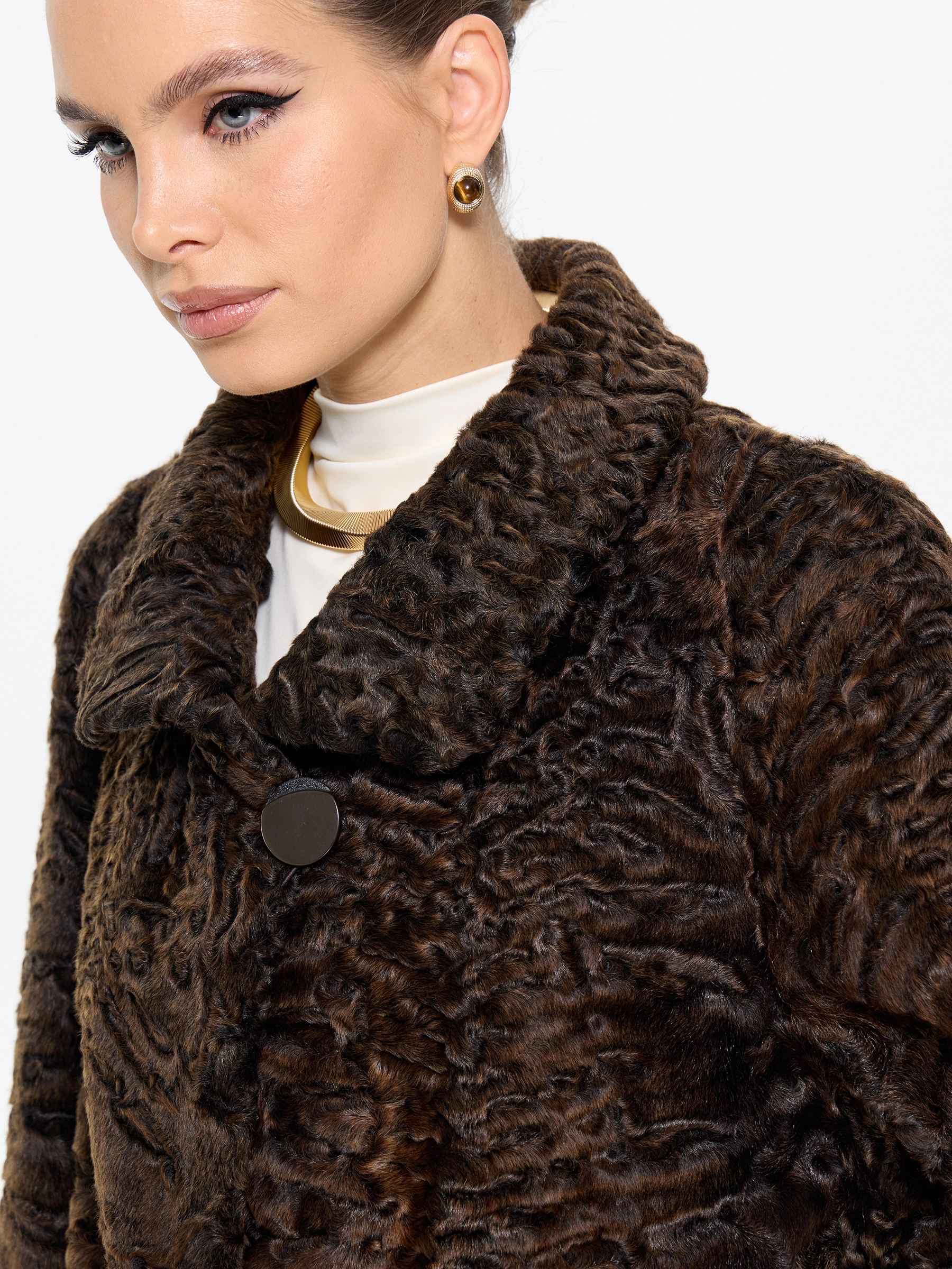 Товар короткая женская шуба из меха каракульчи лиза, коричневая, размер 60, артикул 65570 выполнен из мех каракульчи с застежкой клипсы. Рассчитан на сезон: весна-осень. Длина изделия 80 см, силуэт расклешенный.
