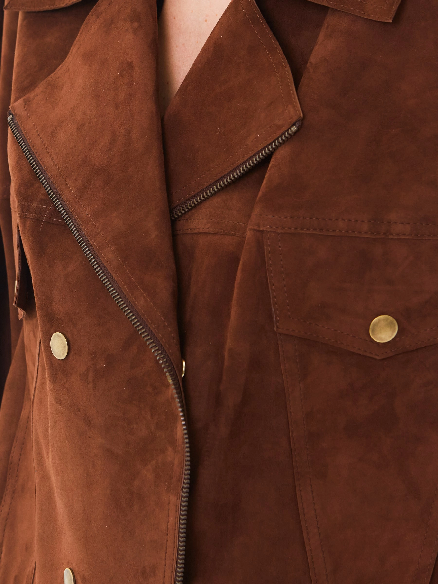 Для пошива косухи с широкими лацканами использовали замшу премиального класса. Спущенная линия плеча. Комфортная посадка по фигуре. Изделие дополнили фигурными боковыми карманами декорированные клапанами. Акцент сделали на крупные золотистые кнопки. Куртка застегивается молнией.