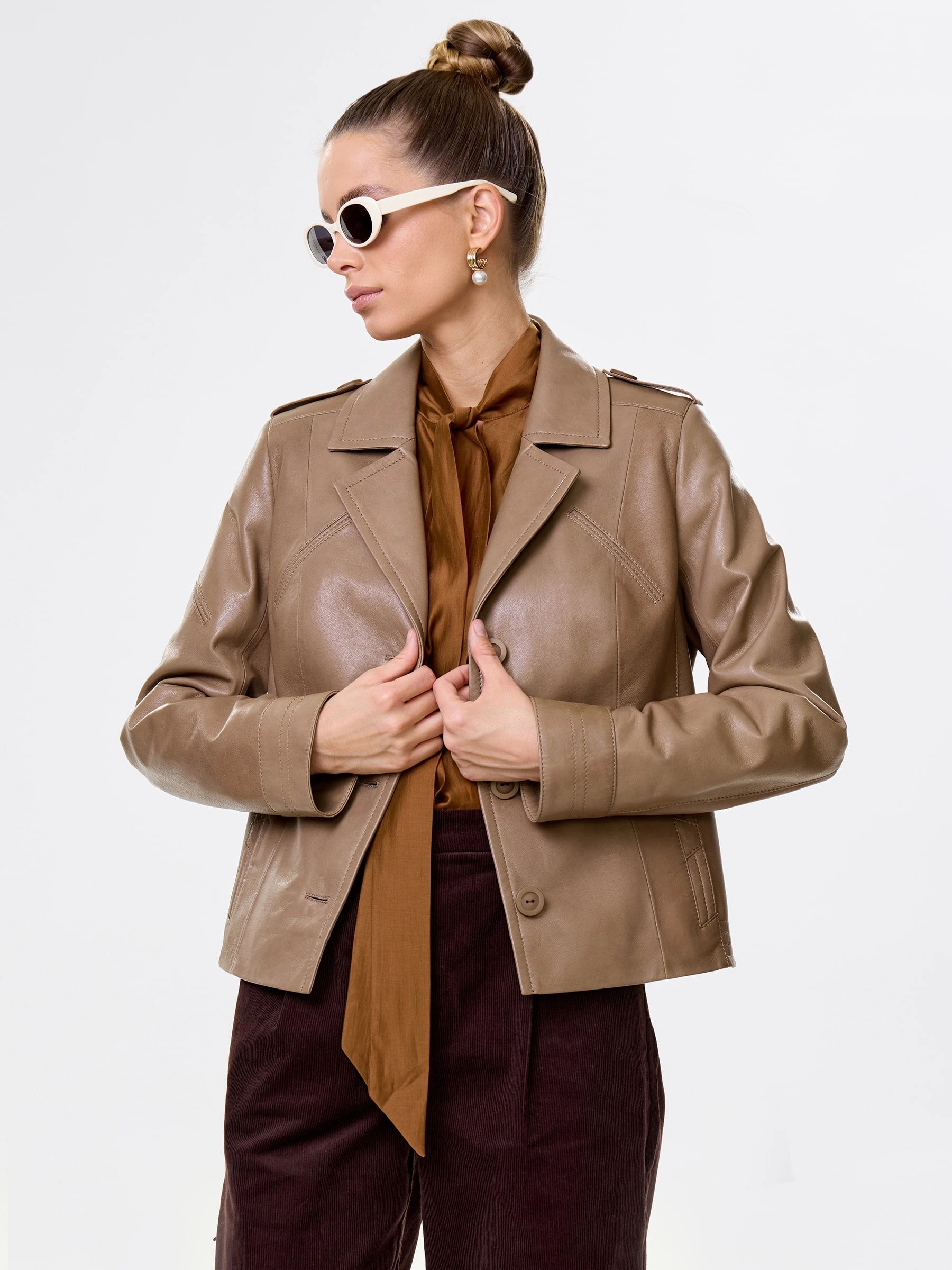 Товар короткий кожаный пиджак премиум класса для женщин 304, серо-коричневый, размер 46, артикул 23630 выполнен из натуральной кожи с застежкой пуговицы. Рассчитан на сезон: весна-лето. Длина изделия 56 см, силуэт полуприлегающий.
