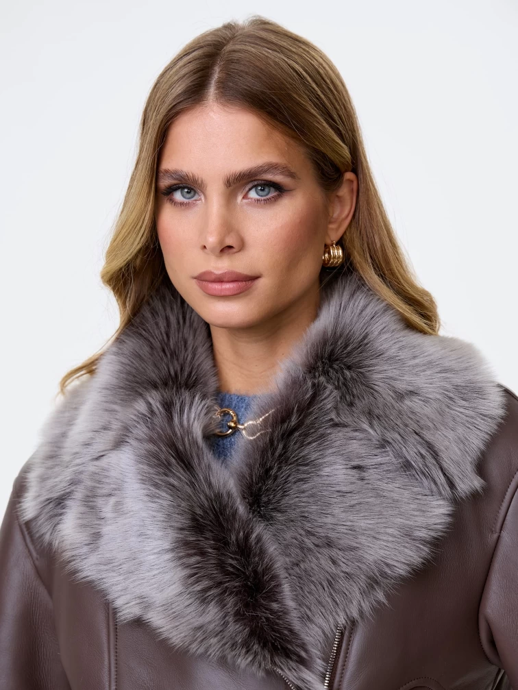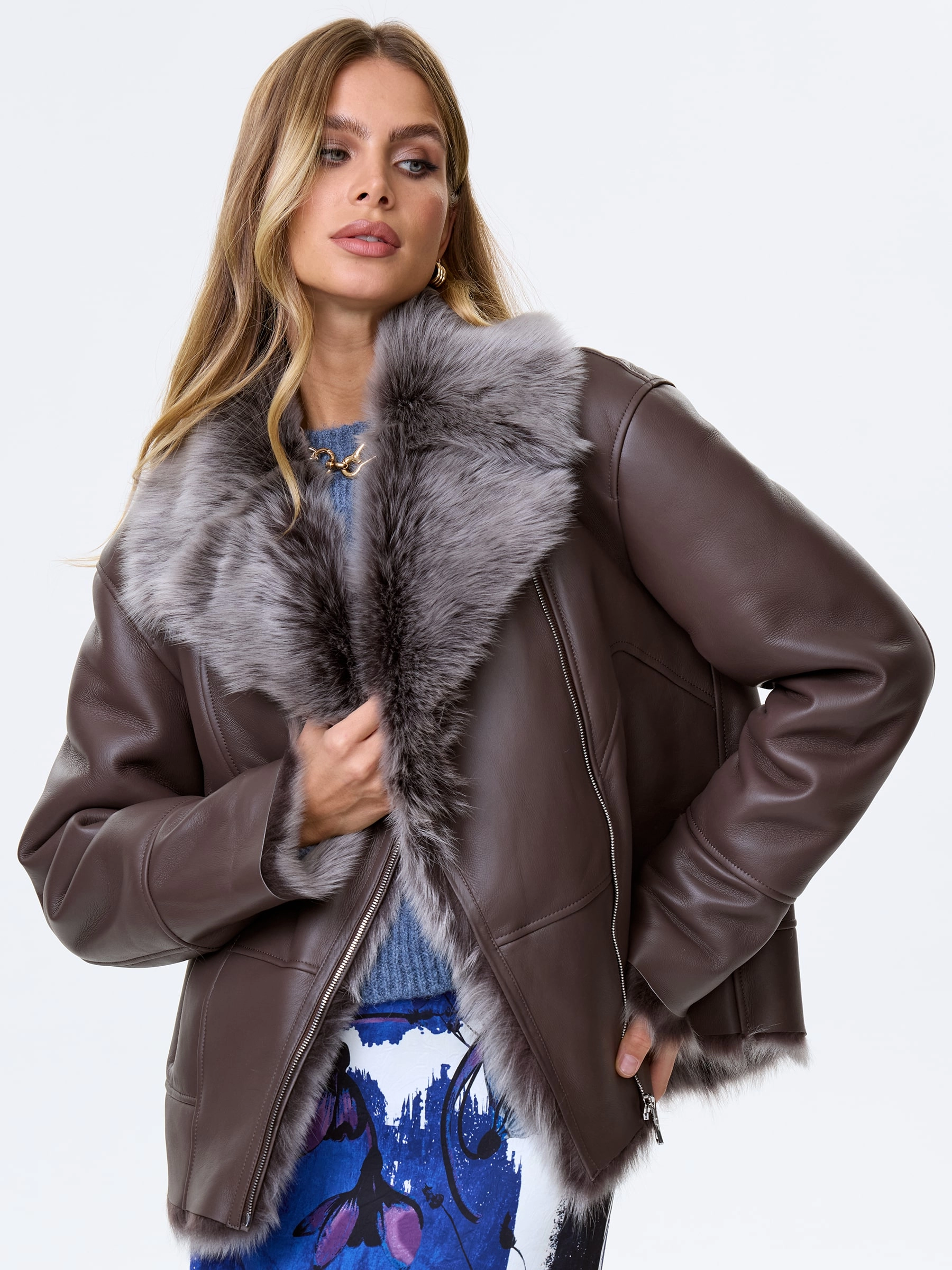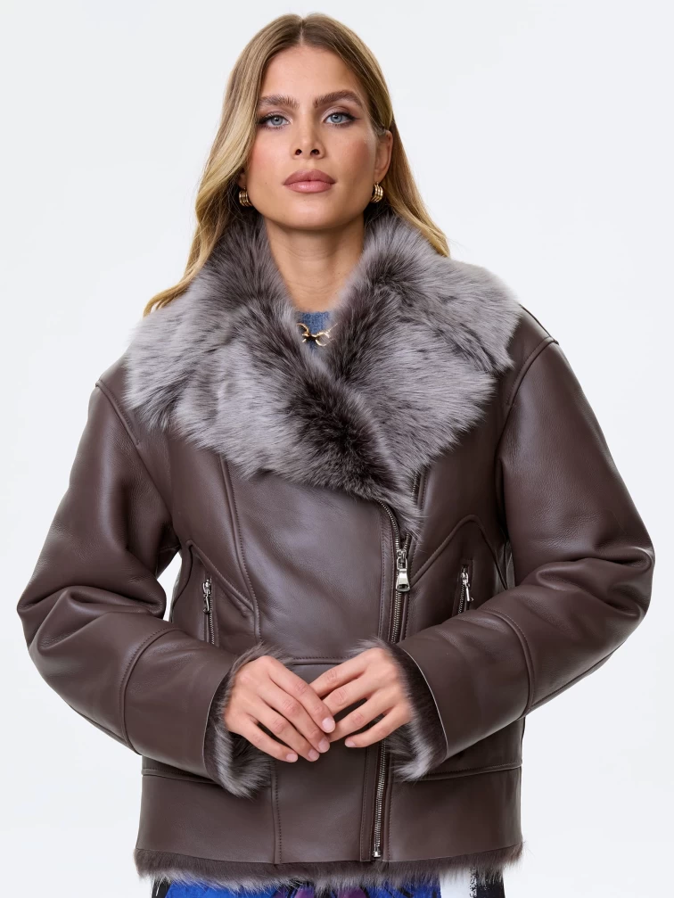 Для пошива короткой куртки-косуха использовали натуральную тосканскую овчину. Полуприлегающий крой, широкие лацканы, боковые карманы как и само изделие застегиваются крупной молнией. Комфортная посадка по фигуре.