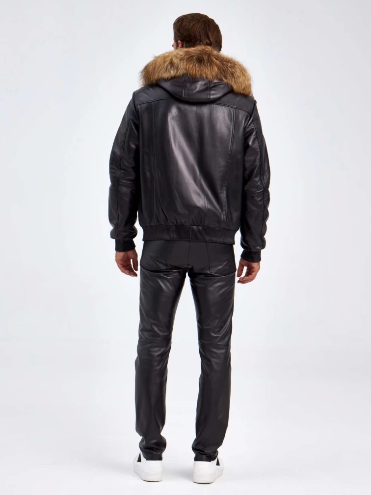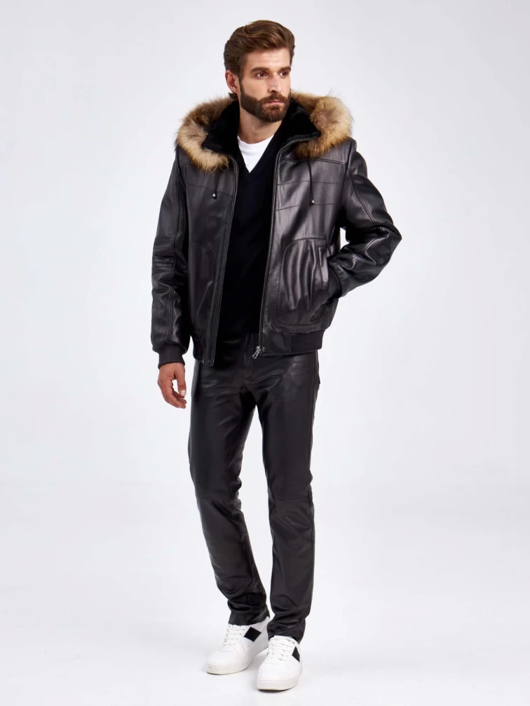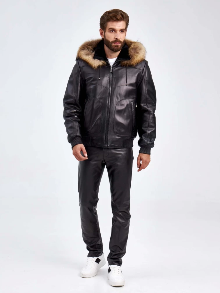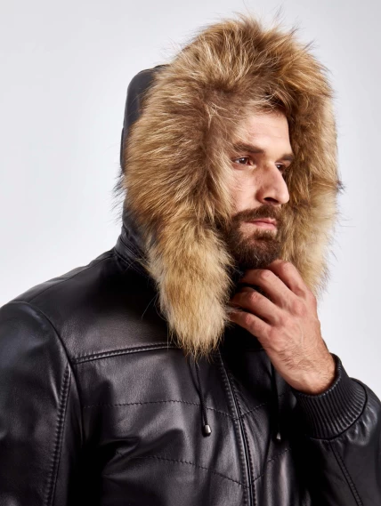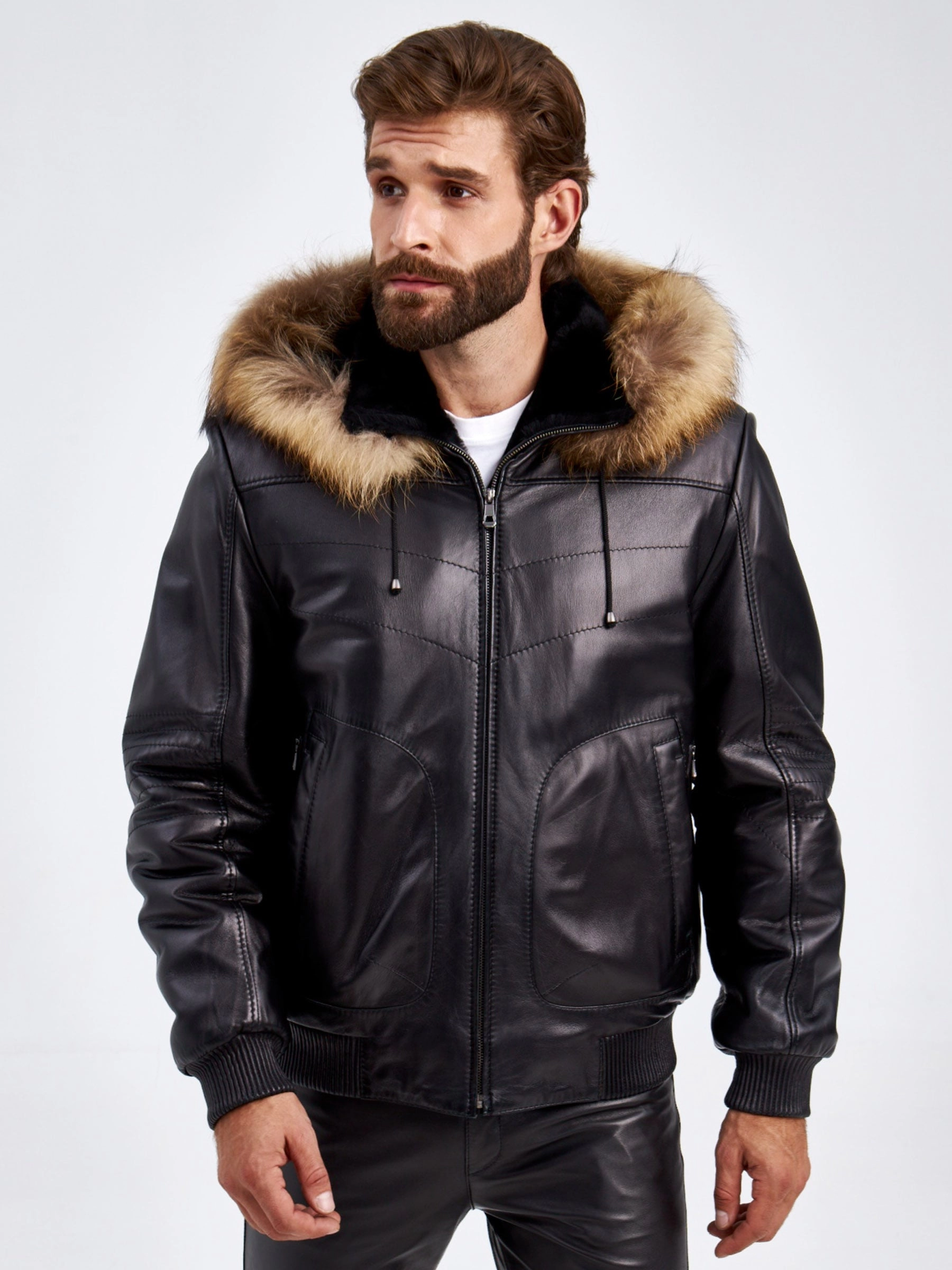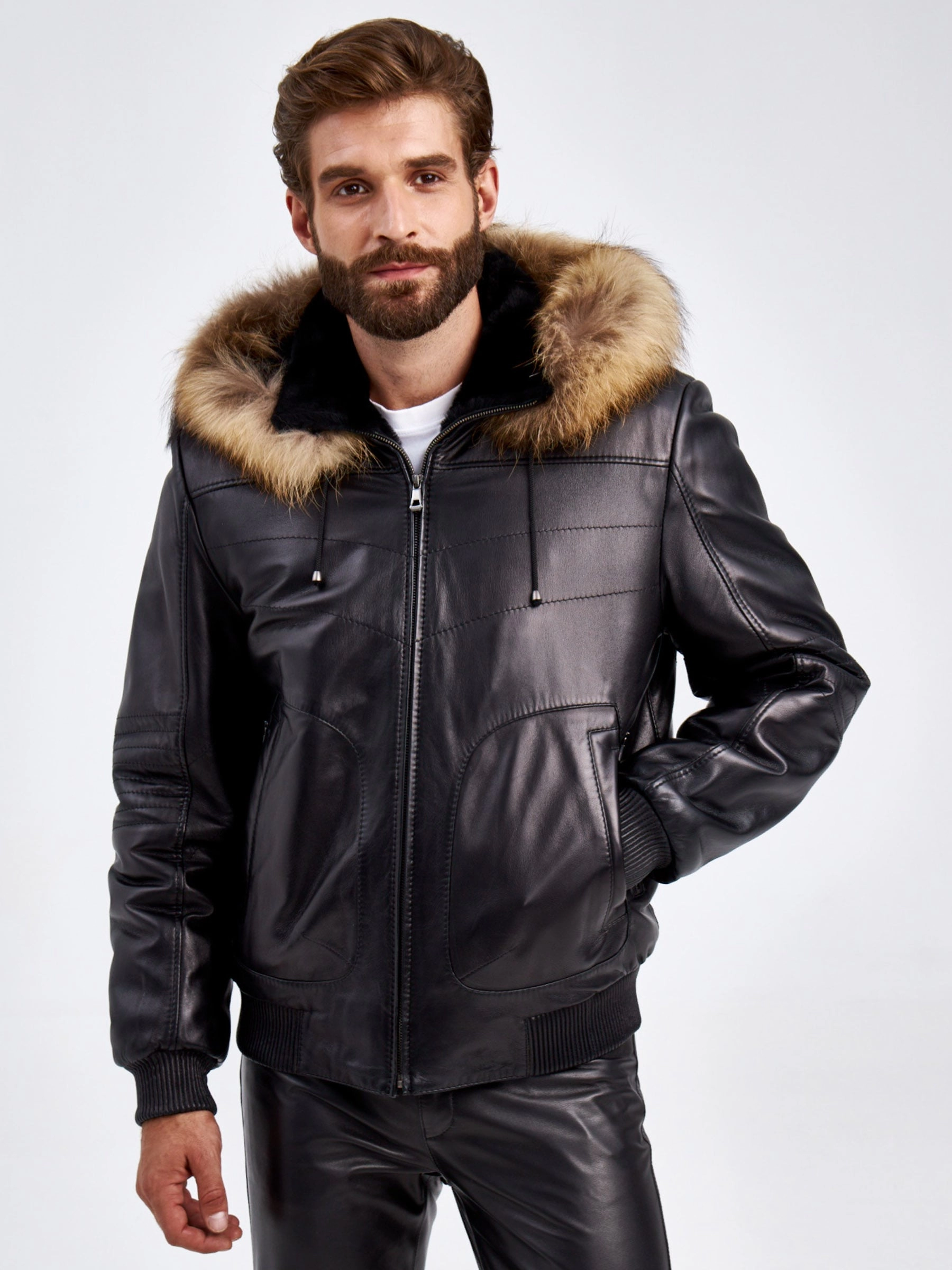 Кожаная мужская дубленка с капюшоном 4726, черный, размер 50, артикул 70910