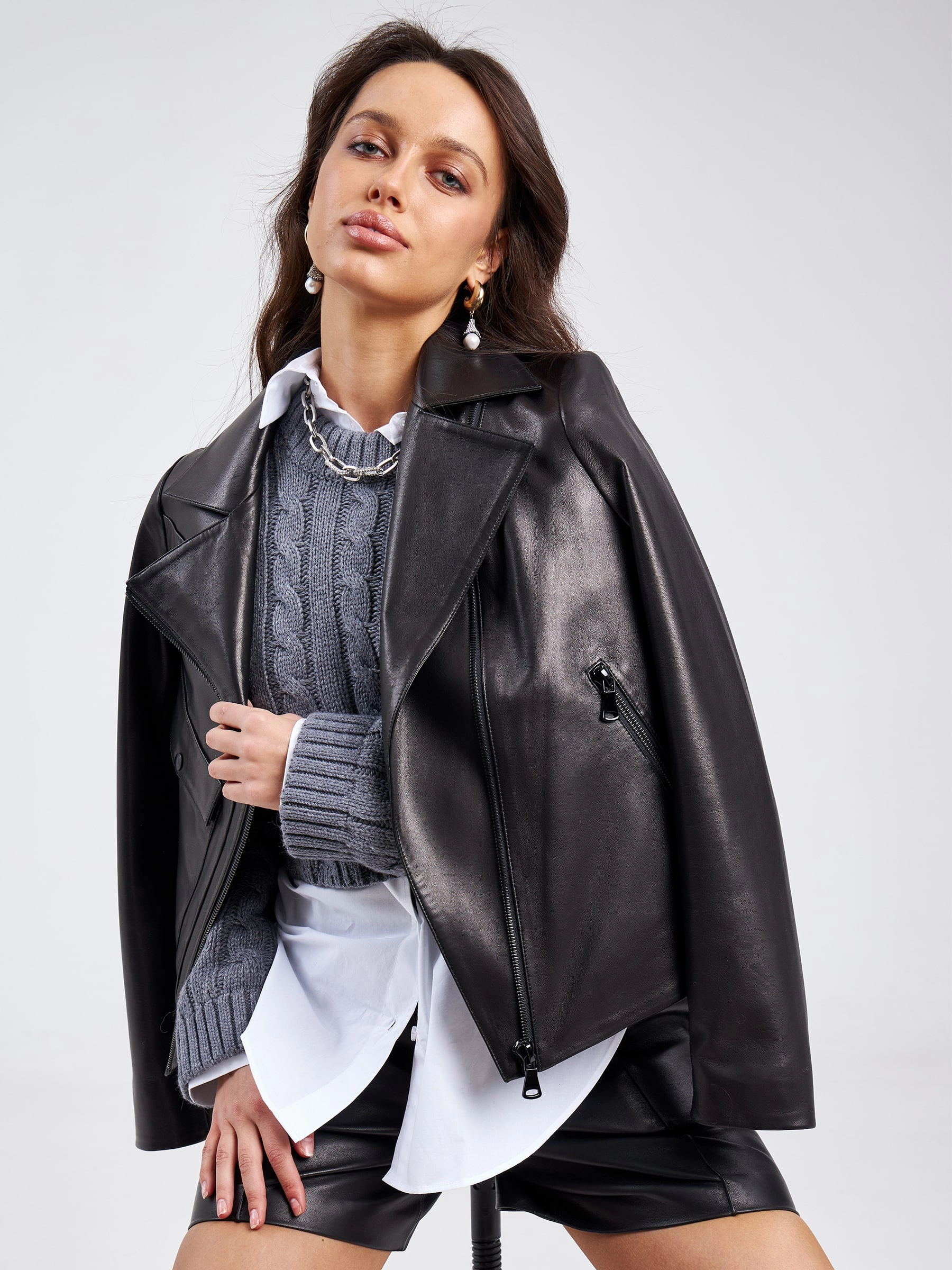 Короткую куртку прямого кроя с косой молнией и широкими лацканами выполнили из мягкой гладкой кожи премиум класс. Акцент сделали на двух асиммитричных карманах.