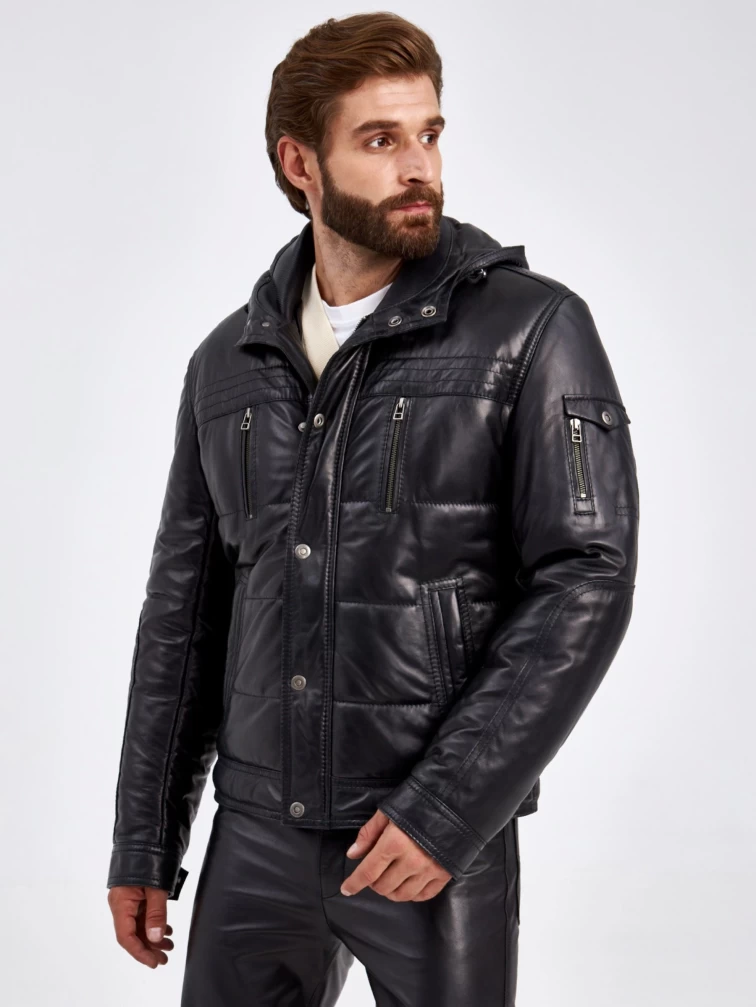 Товар утепленный мужской кожаный пуховик с капюшоном 2010-12, черный, размер 50, артикул 29150 выполнен из натуральной кожи с застежкой молния. Рассчитан на сезон: демисезон. Длина изделия 51-74 см, силуэт свободный.