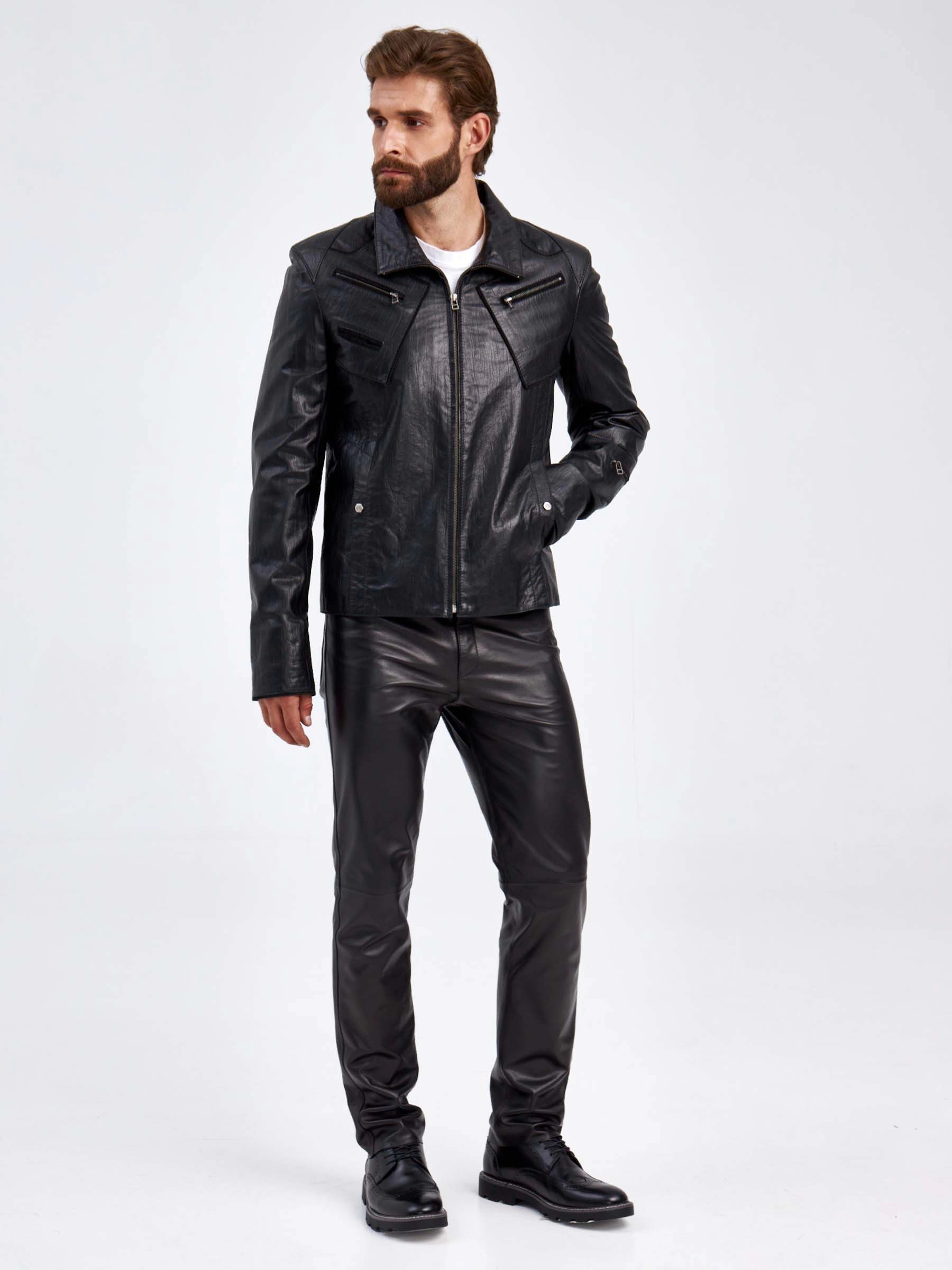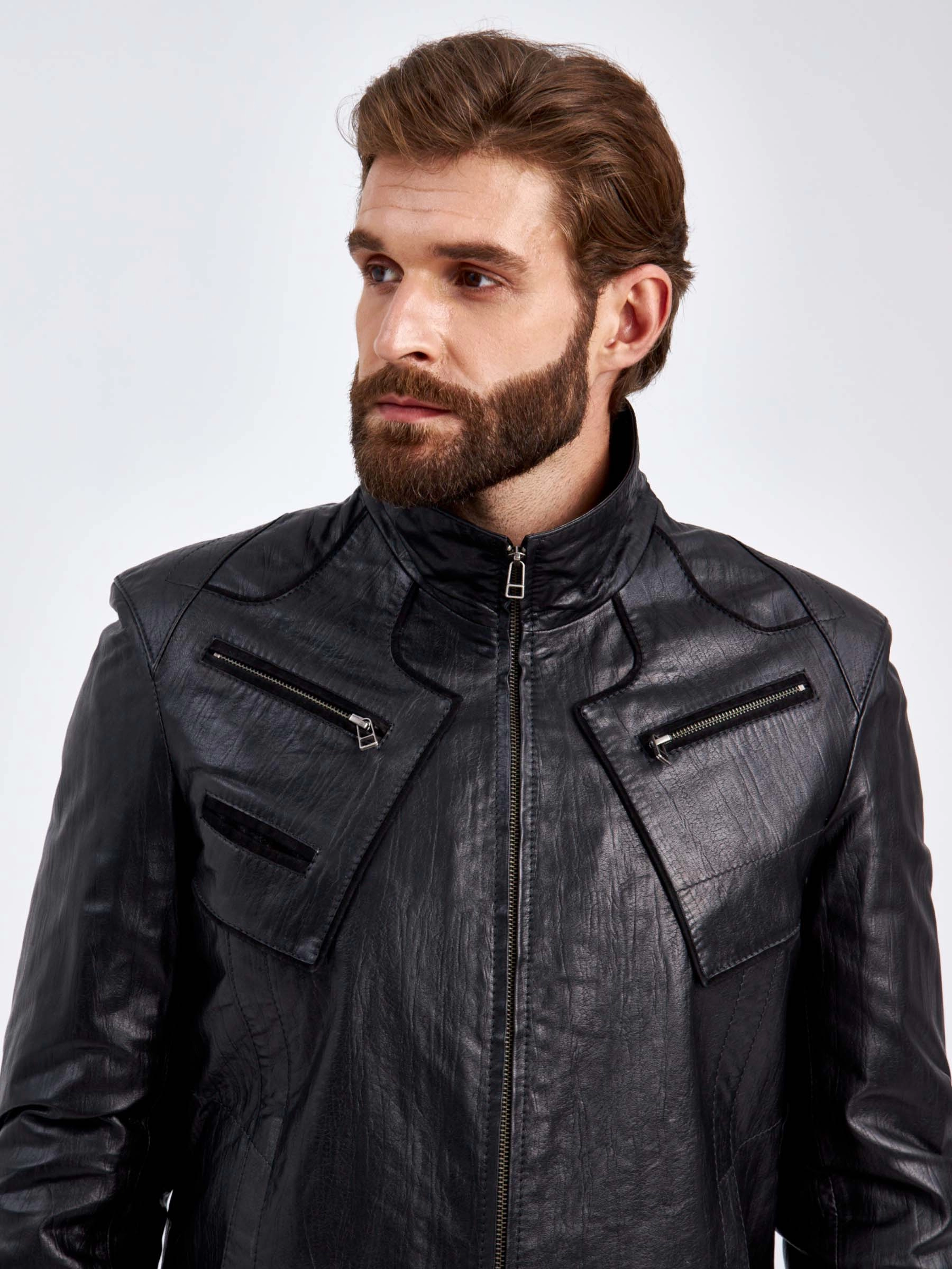 Мужская куртка в великолепной мягкой кожи черного цвета застегивающаяся на молнию. Прямого силуэта. Воротник –отложной плавно трансформируется в стойку. Модель дополнили асимметричными нагрудными карманами на молнии. Идеальная посадка по фигуре.