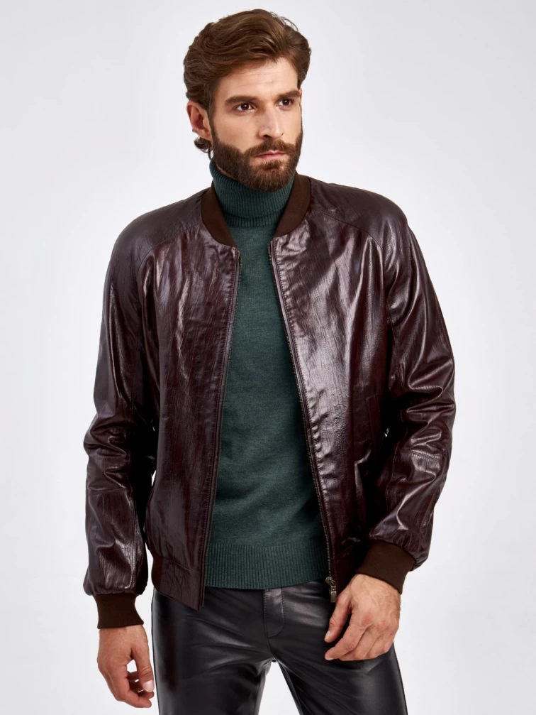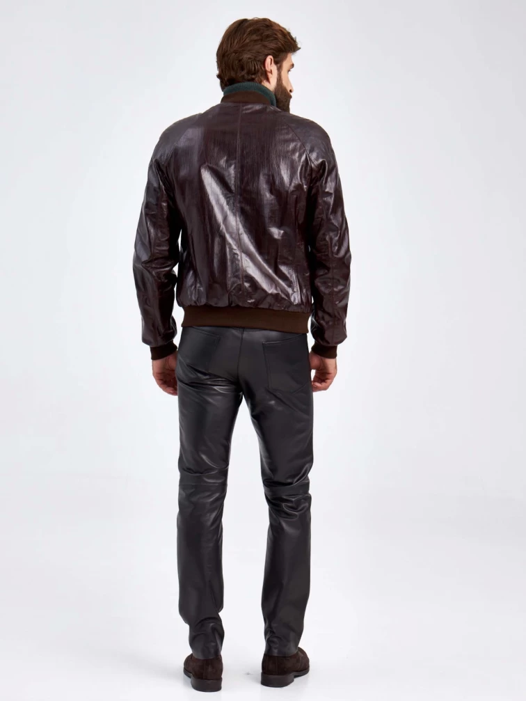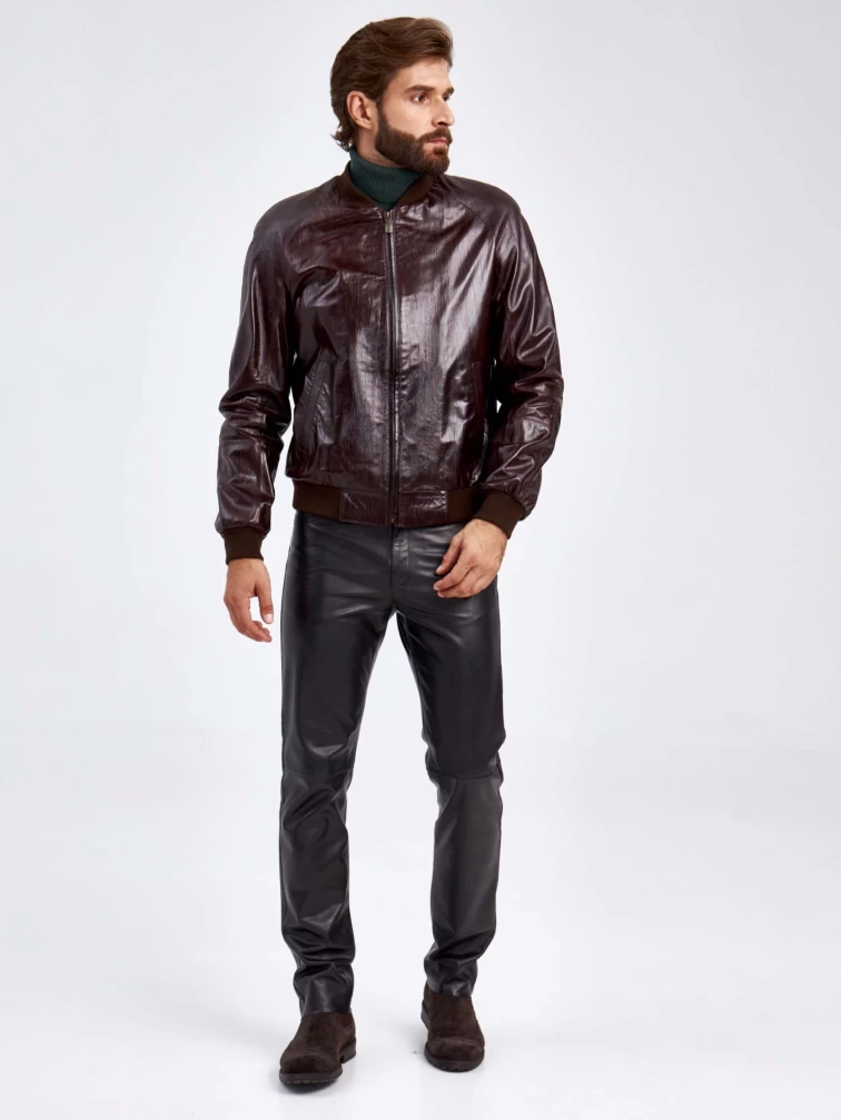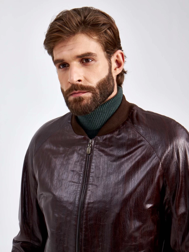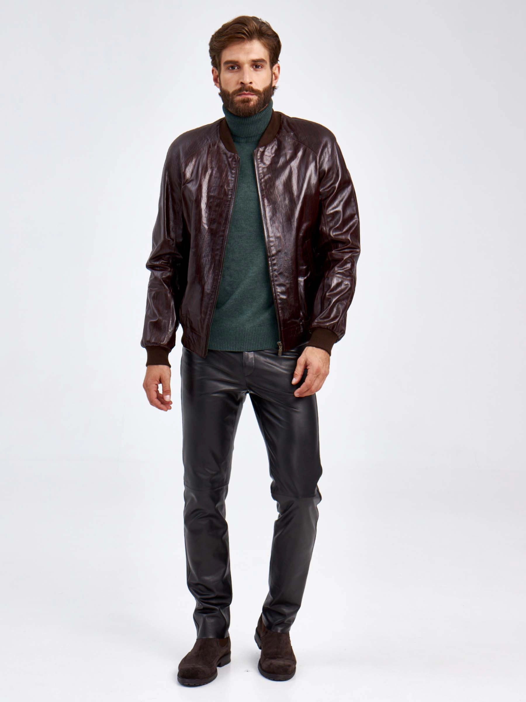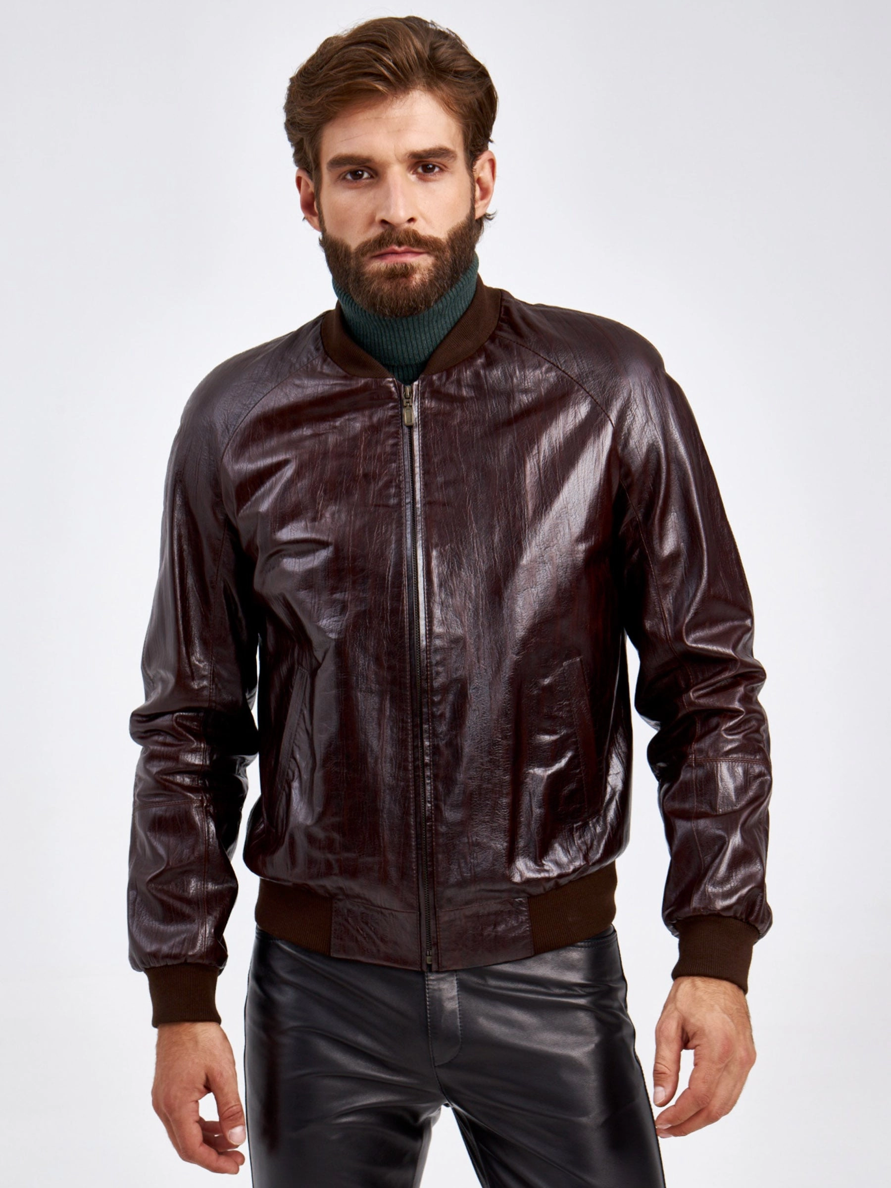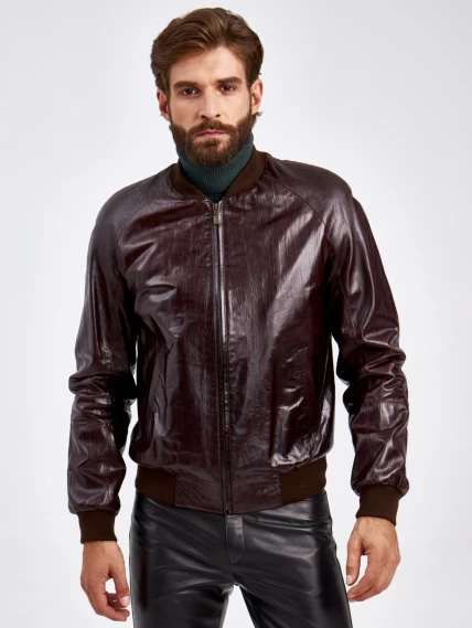 Короткая мужская кожаная куртка бомбер 535, коричневая, размер 50, артикул 29220