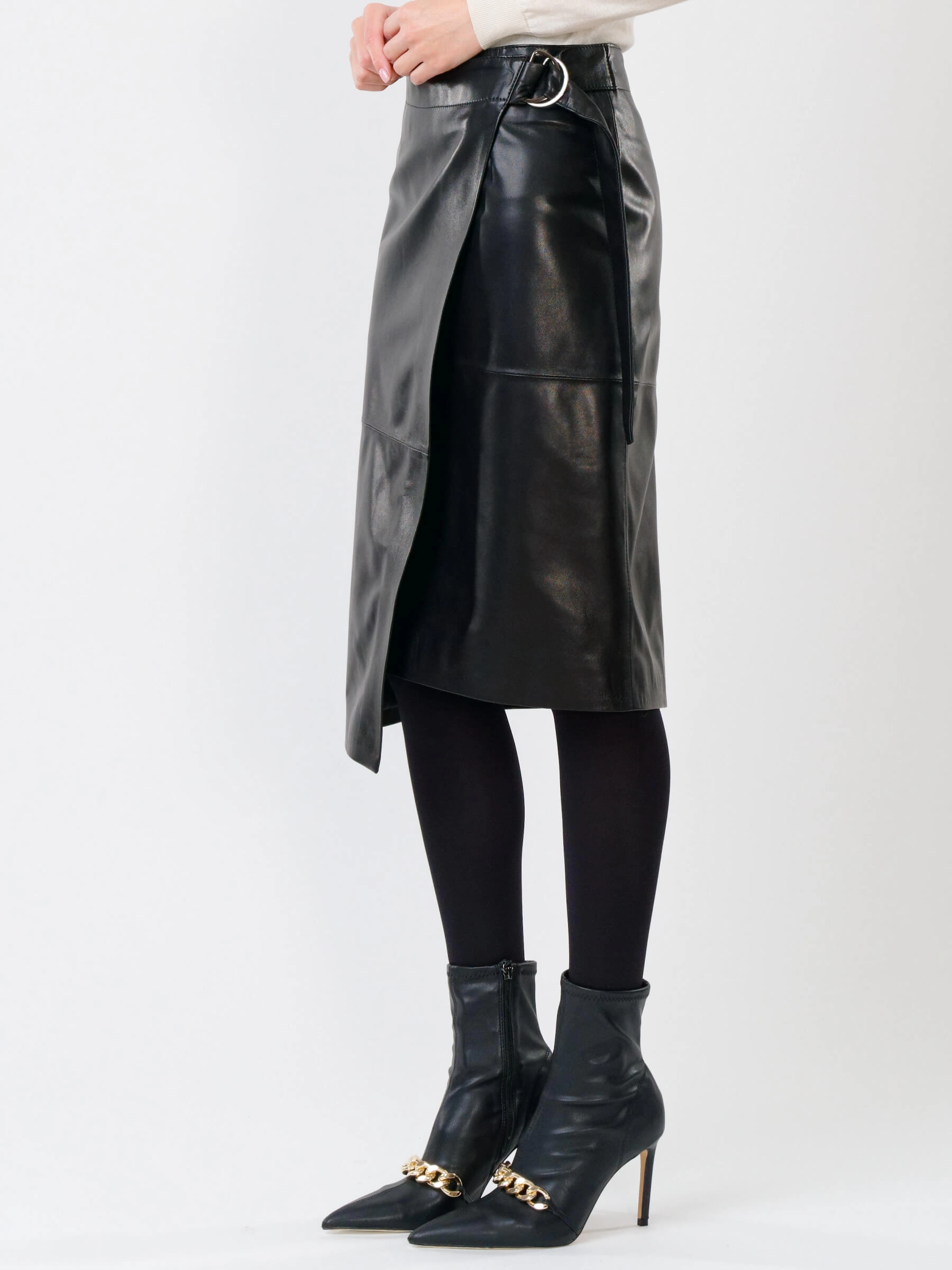 Товар кожаная юбка миди с запахом 07, черная, размер 44, артикул 85301 выполнен из натуральной кожи с застежкой молния. Рассчитан на сезон: демисезон. Длина изделия 65 см, силуэт прямой.