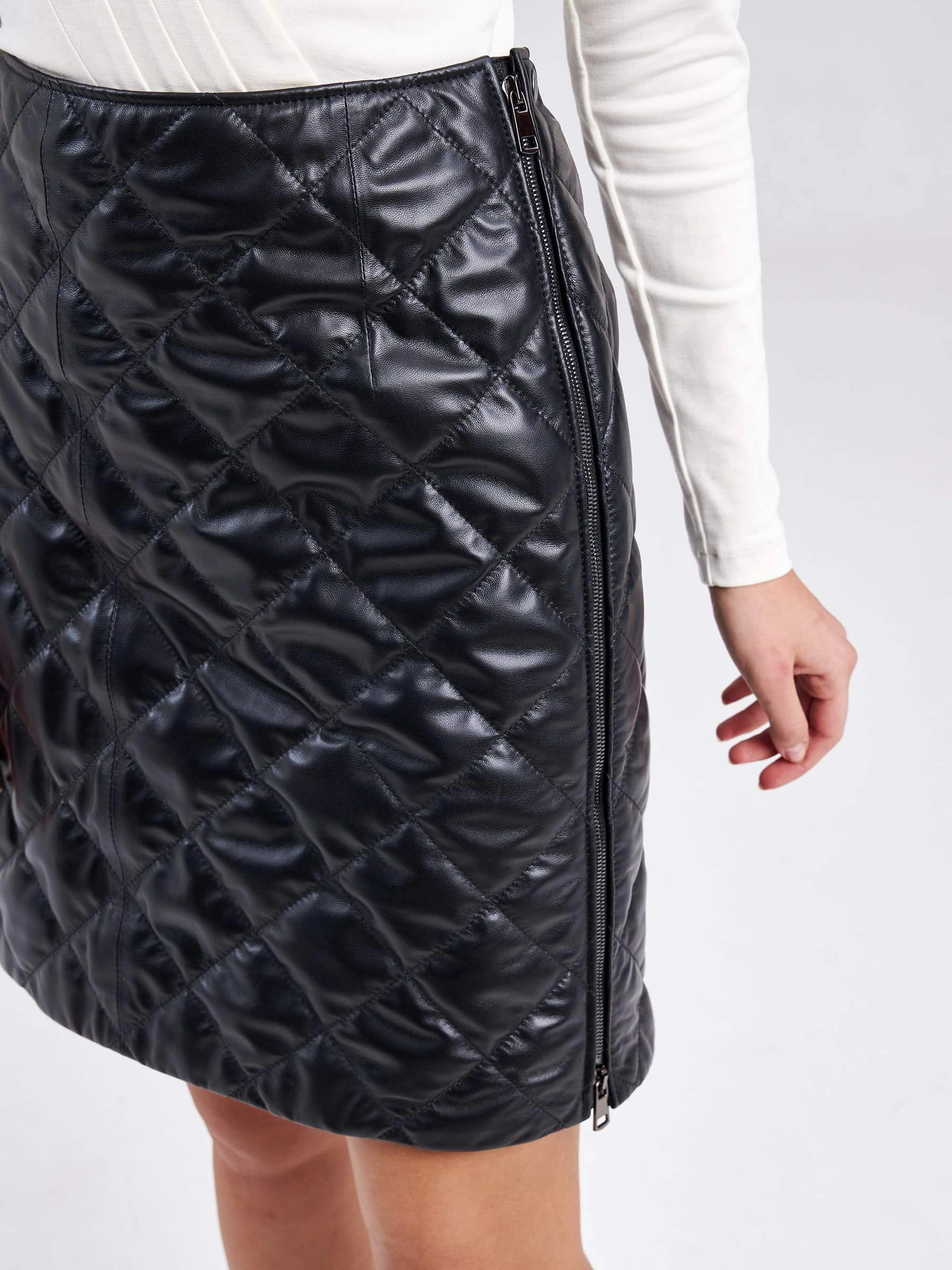 Товар стеганая юбка мини из натуральной кожи 11, черная, размер 50, артикул 85880 выполнен из натуральной кожи с застежкой молния. Рассчитан на сезон: весна-лето. Длина изделия 52 см, силуэт прямой.
