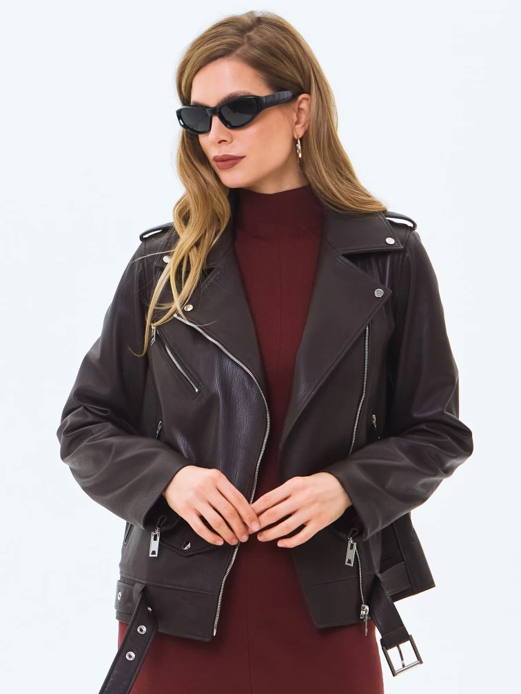 Кожаная женская куртка косуха с поясом премиум класса 3078, коричневая, размер 42, артикул 24580