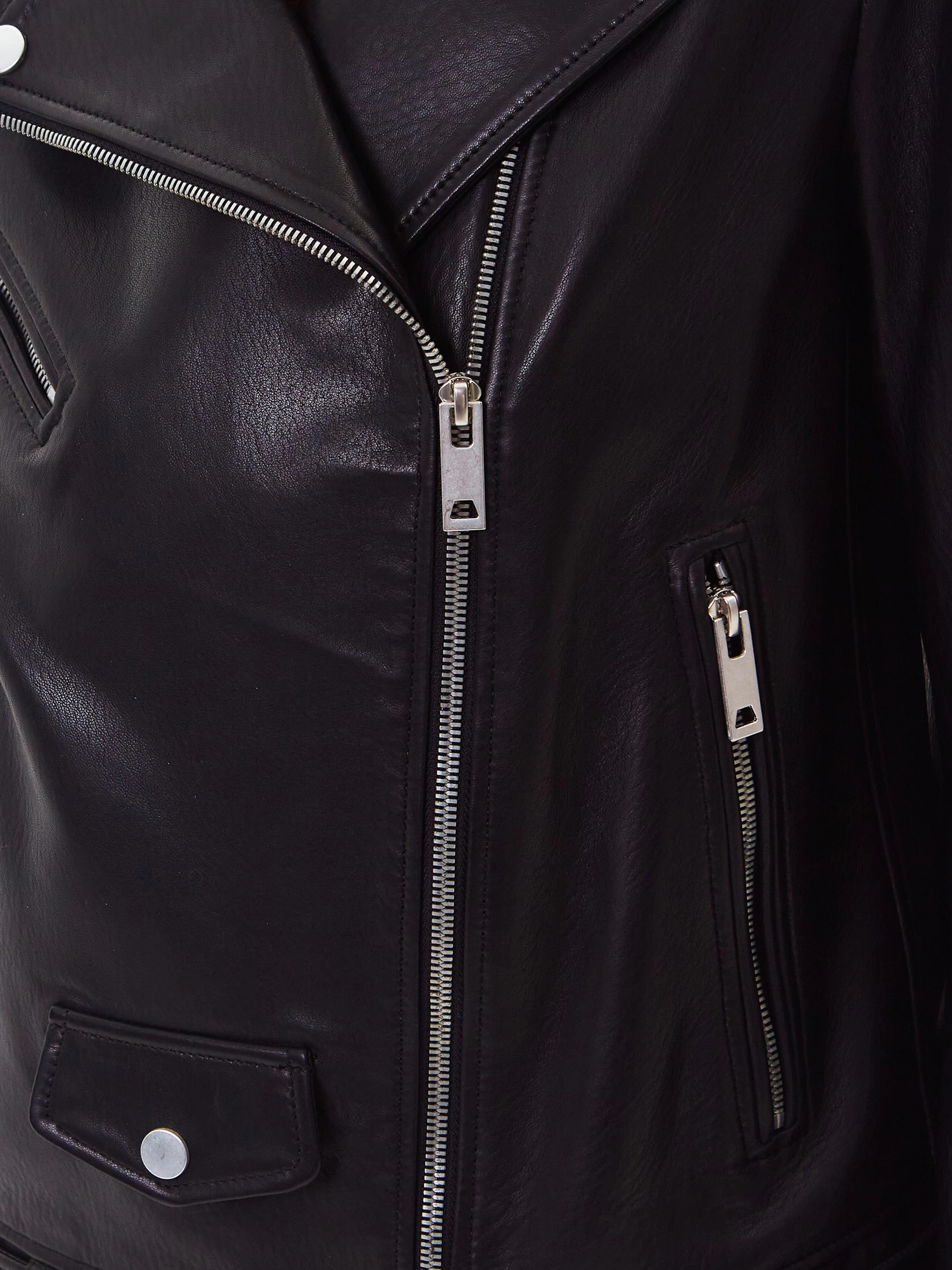Куртку с широкими лацканами выполнили из мягкой натуральной кожи черного цвета. Сама модель, манжеты и три кармана застегиваются крупными молниями. Косуху прямого силуэта дополнили съемным ремнем с пряжкой.
