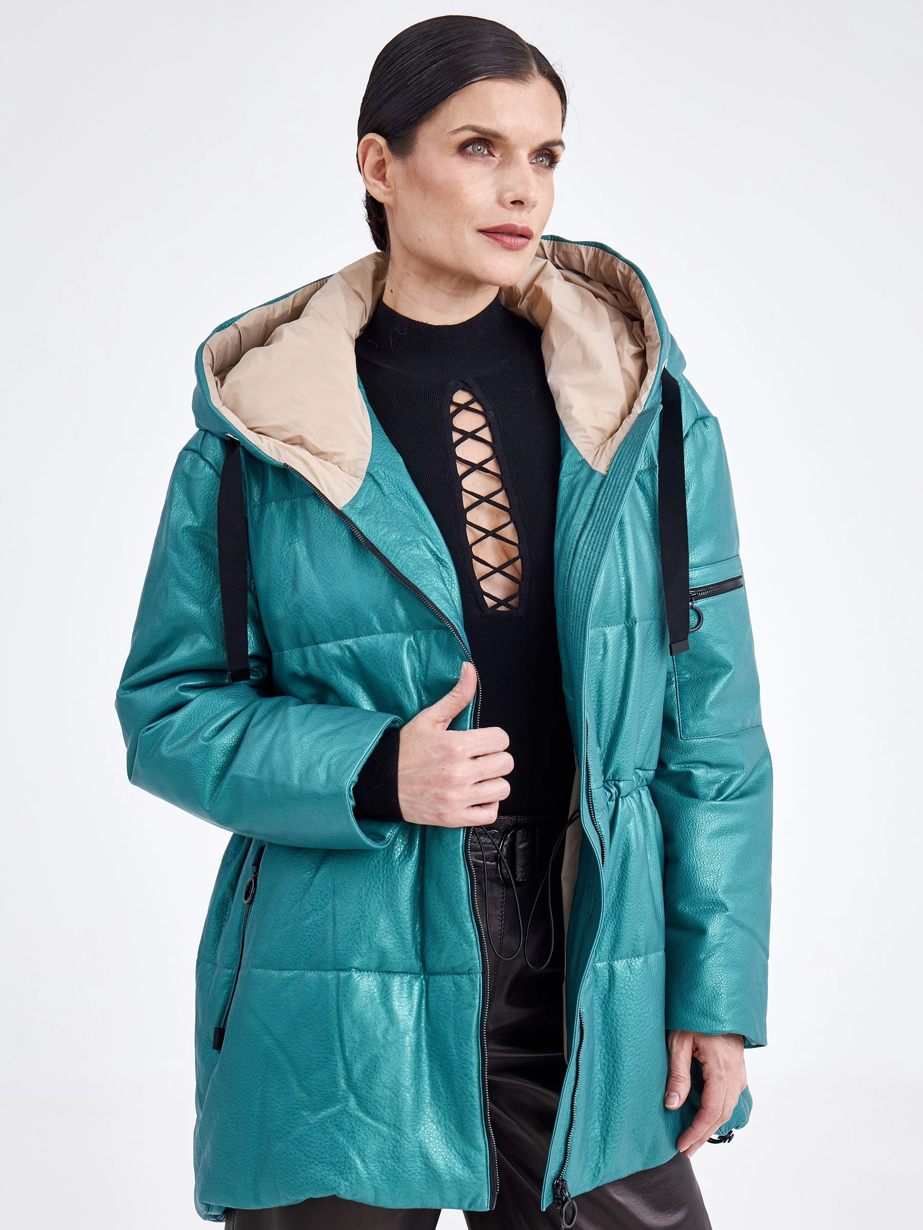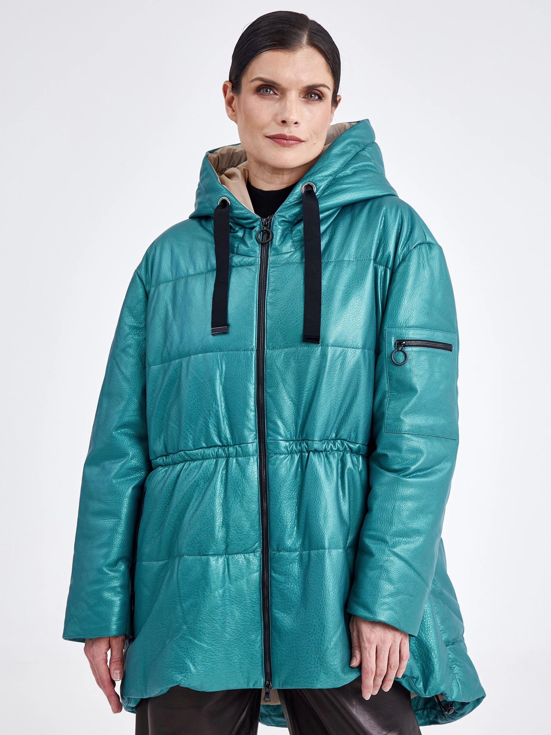 Товар кожаная женская куртка оверсайз с капюшоном премиум класса 3021, зеленая, размер 48, артикул 25470 выполнен из натуральной кожи с застежкой молния. Рассчитан на сезон: демисезон. Длина изделия 75-90 см, силуэт свободный.