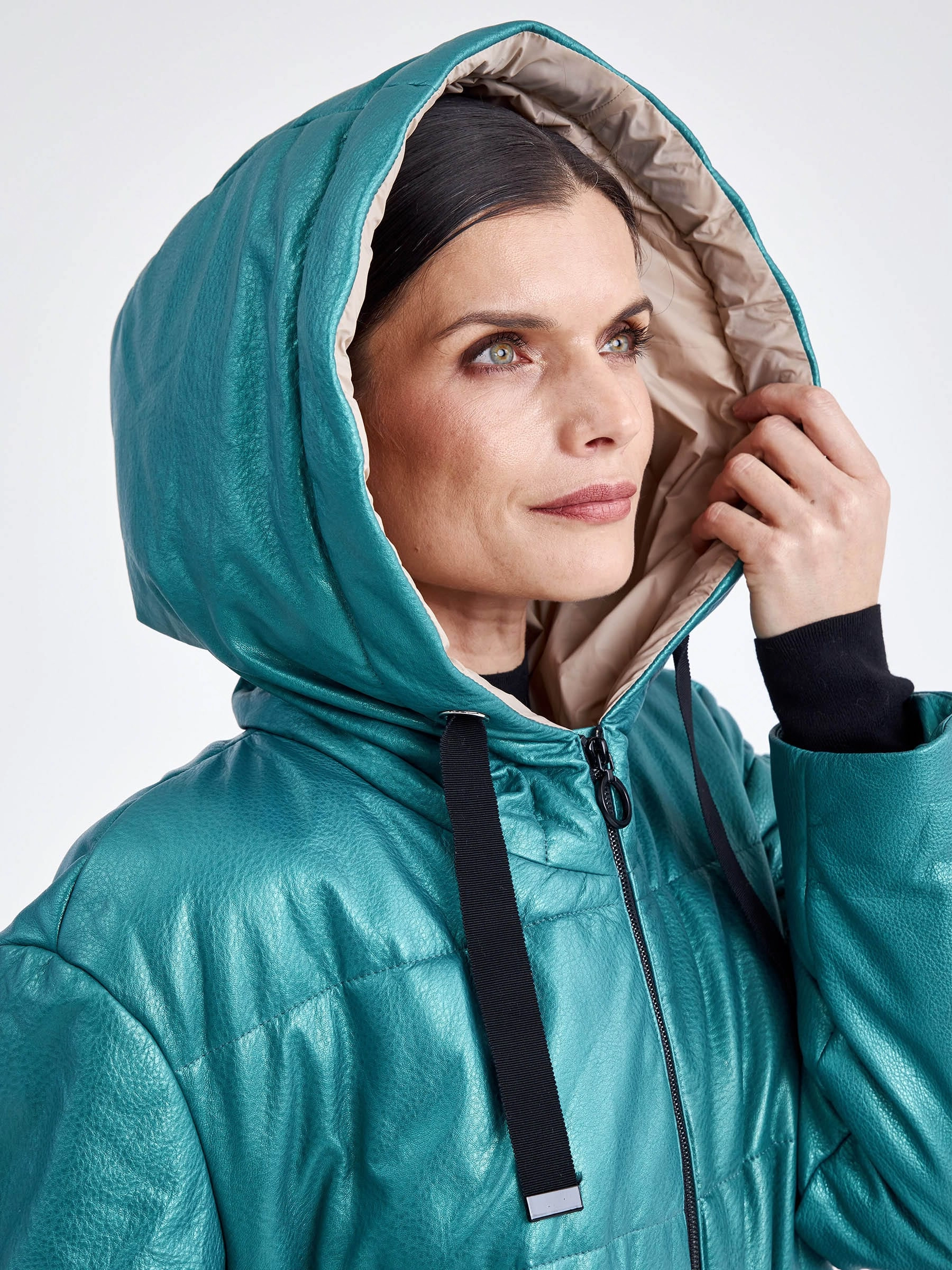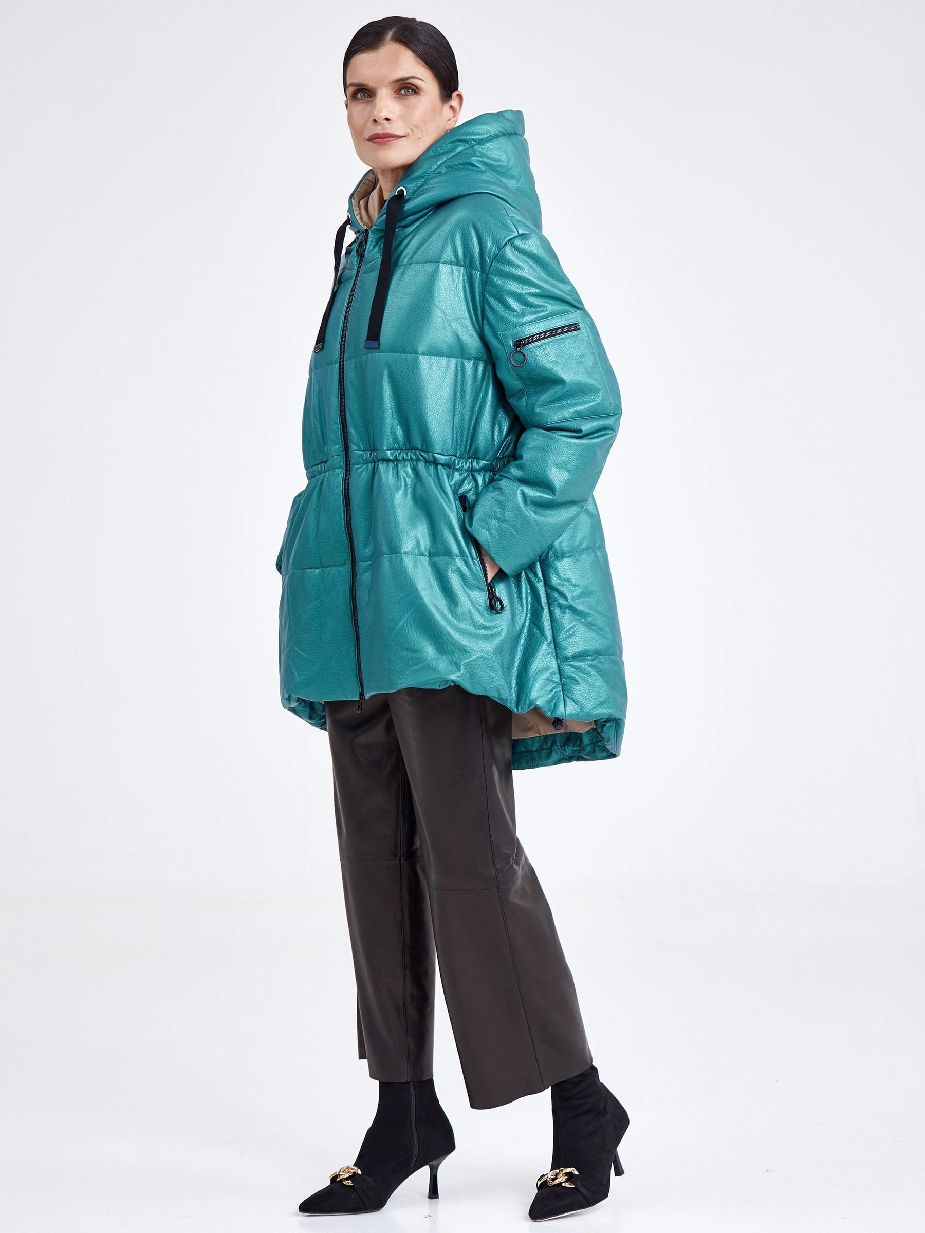 Утепленная куртка пуховик свободного кроя с капюшоном в зелено-перламутровым цвете. Наолнителем послужил немецкий синтепон Френденберг. Отличная теплоизоляция, превосходная парапроницаемость, простой уход. Застежка-молния. Силуэт можно приталить внутренним регулируемым поясом-кулиской. Великолепная посадка по фигуре не сковывает движение.