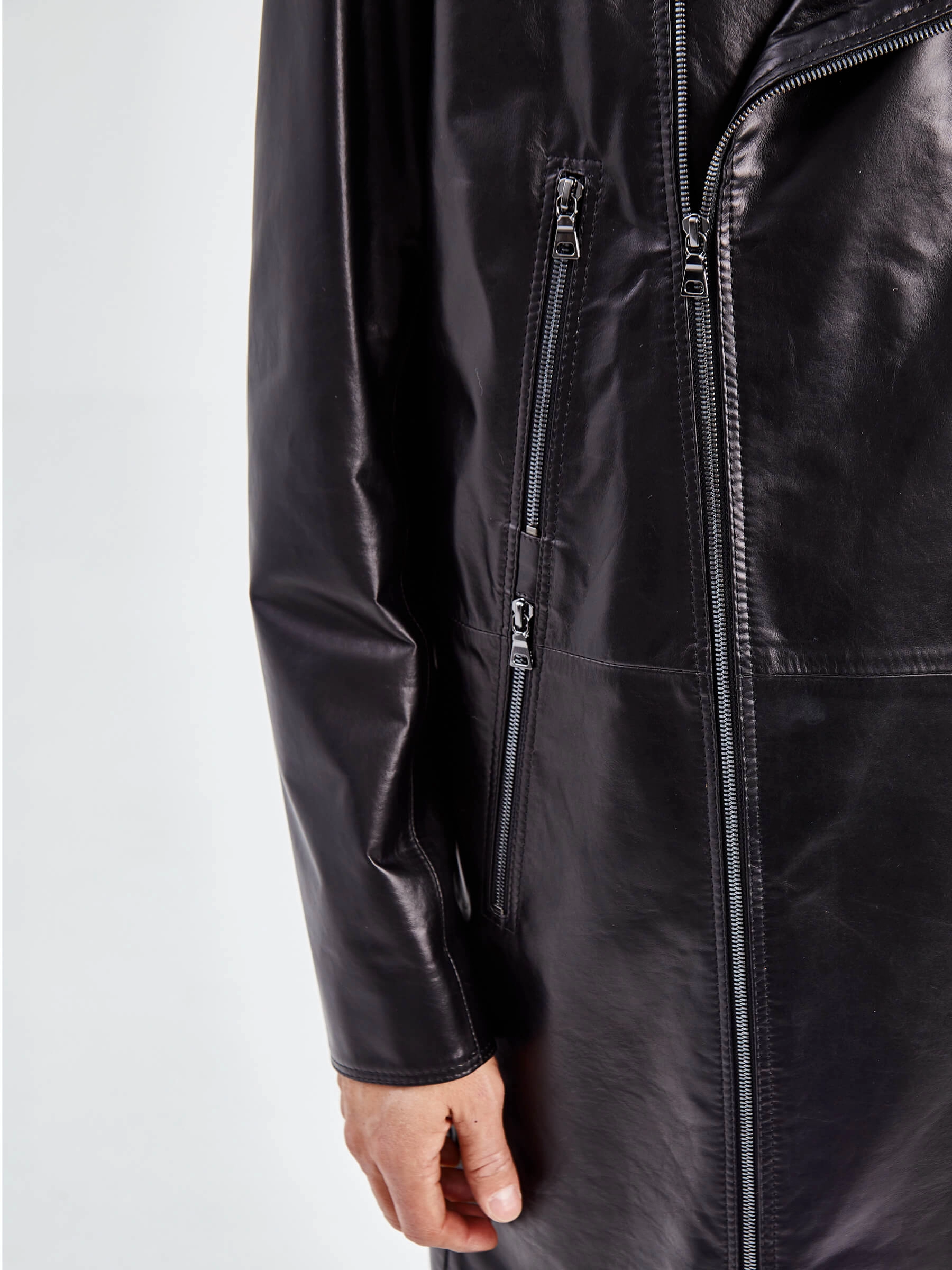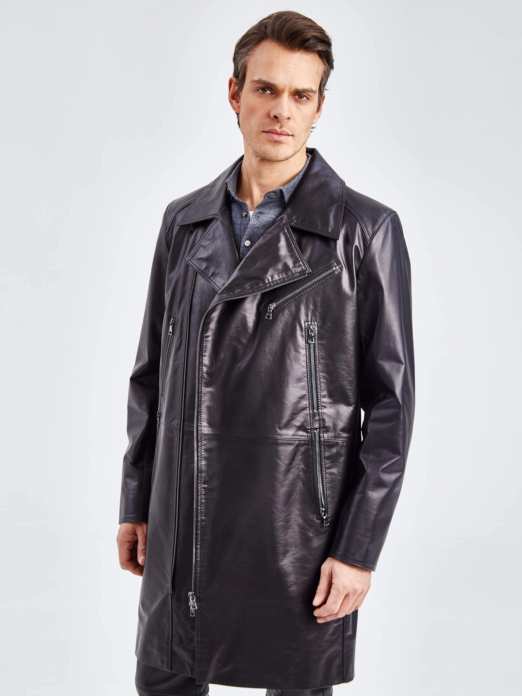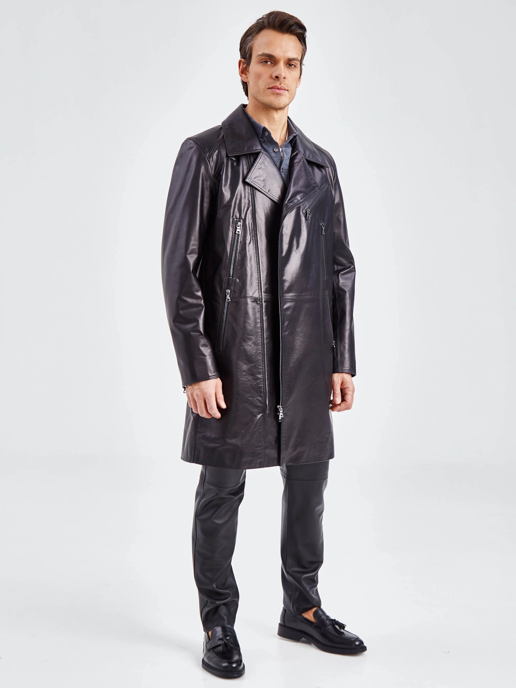 Мужское кожаное пальто в спортивном стиле с элементами классической куртки - косухи. Ассиметричная застежка-молния. Боковые карманы и нагрудный карман на молниях. Молнии украшают и втачные рукава. Комфортную свободу движений обеспечивает шлица внизу центрального шва спинки.