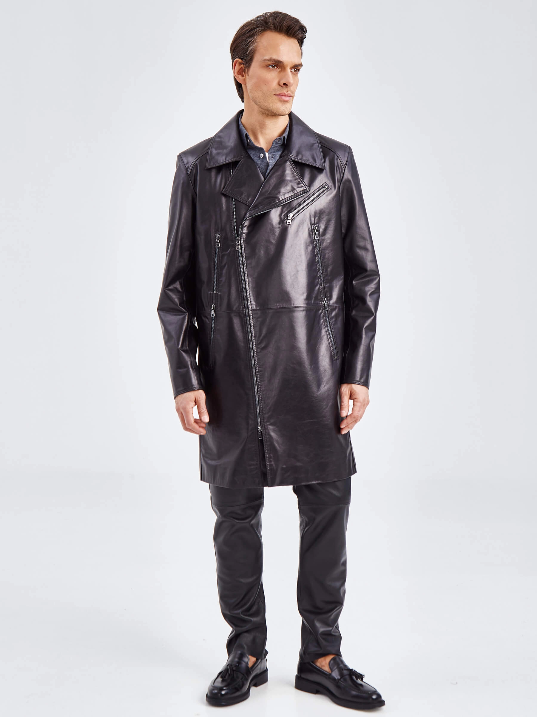 Товар мужское кожаное пальто из натуральной кожи премиум класса 554, черное, размер 54, артикул 71350 выполнен из натуральной кожи с застежкой молния. Рассчитан на сезон: демисезон. Длина изделия 98 см, силуэт прямой.