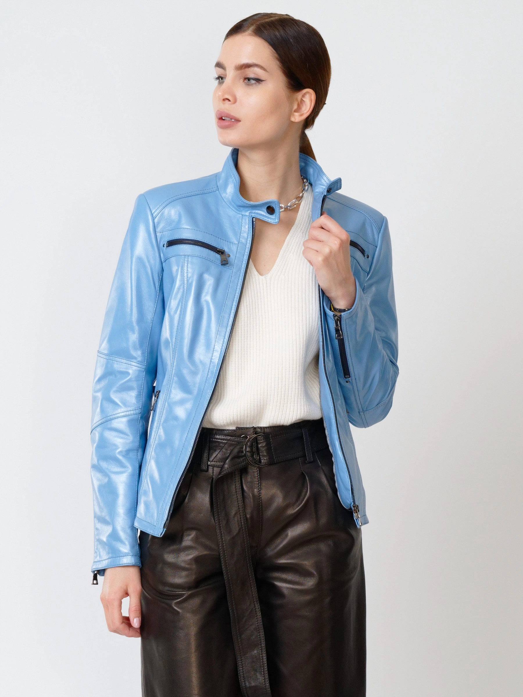 Товар кожаный комплект женский: куртка 301 + брюки 05, голубой перламутр/черный, р. 44, арт. 111167. Рассчитан на сезон: весна-лето.