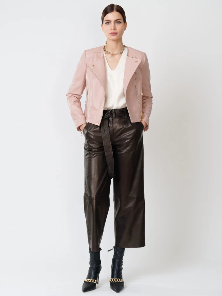Еще один шикарный образ и красивое сочетание. Широкие кожаные брюки хорошо гармонируют с укороченной курткой-косухой. Подобный образ подойдет не только для повседневной носки, но и для деловых встреч. Высшее качество кожи. Безупречная работа наших портных.