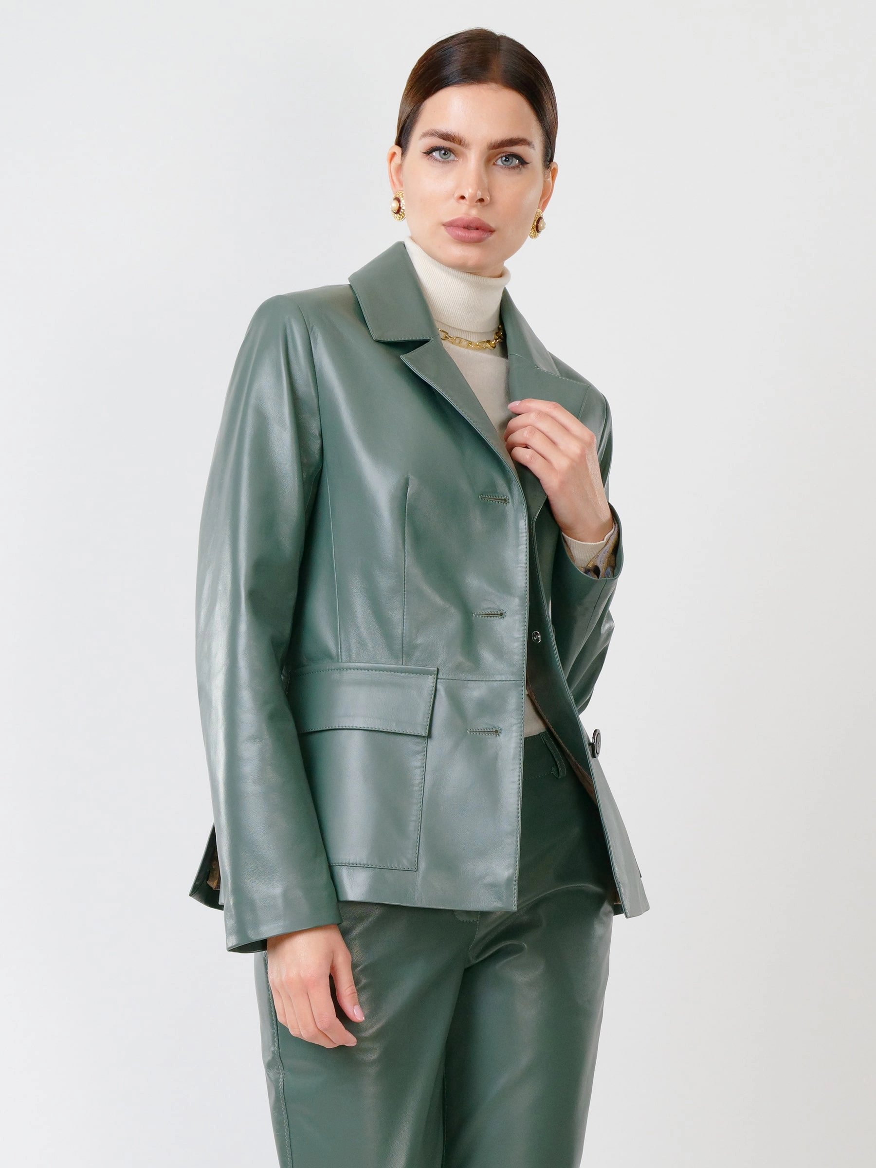 Элегантный кожаный пиджак цвета олива в тандеме с брюками из натуральной нежной кожи. Все в тон. Все выдержано. Дорого, стильно. Премиум-класс.