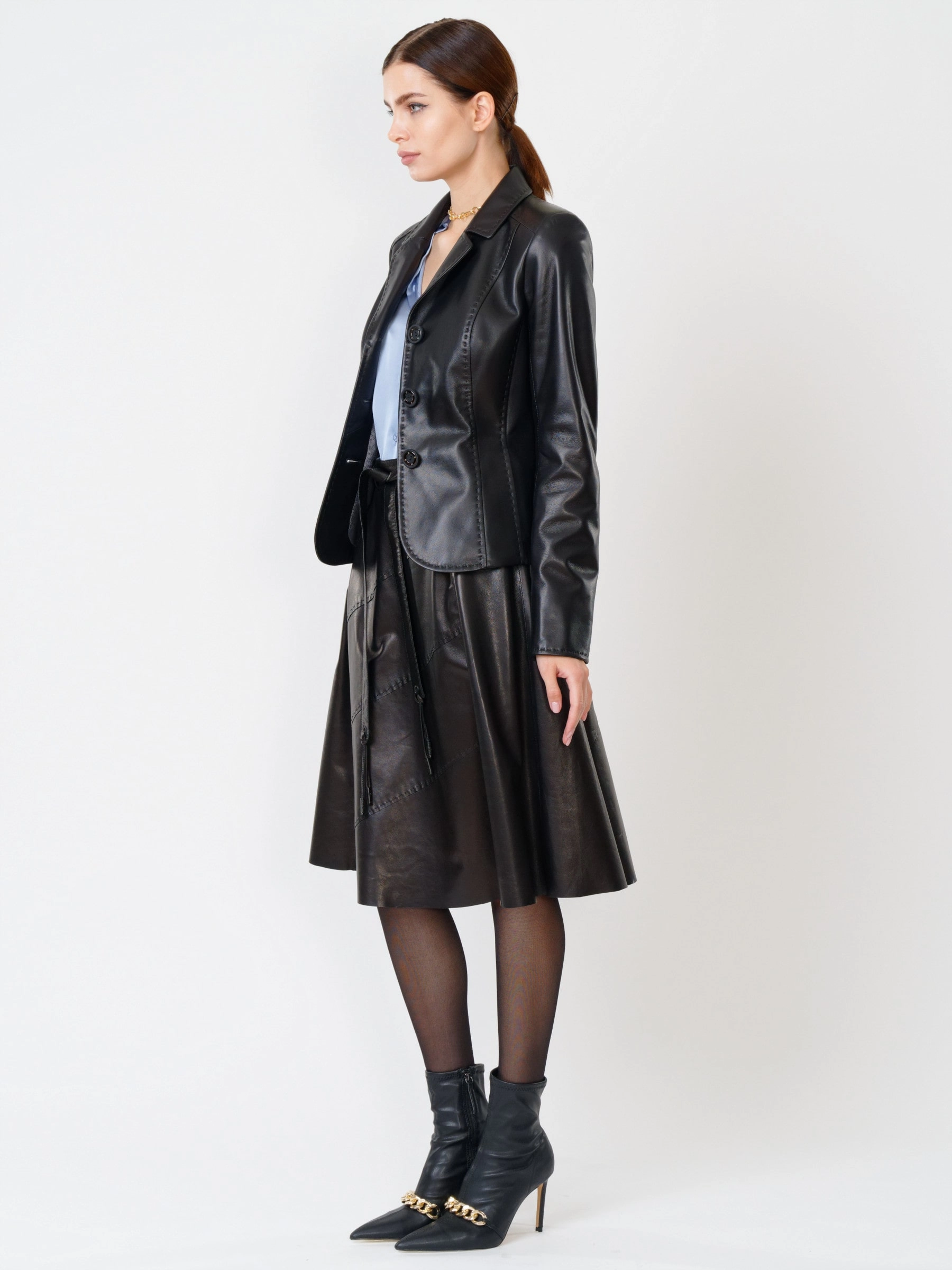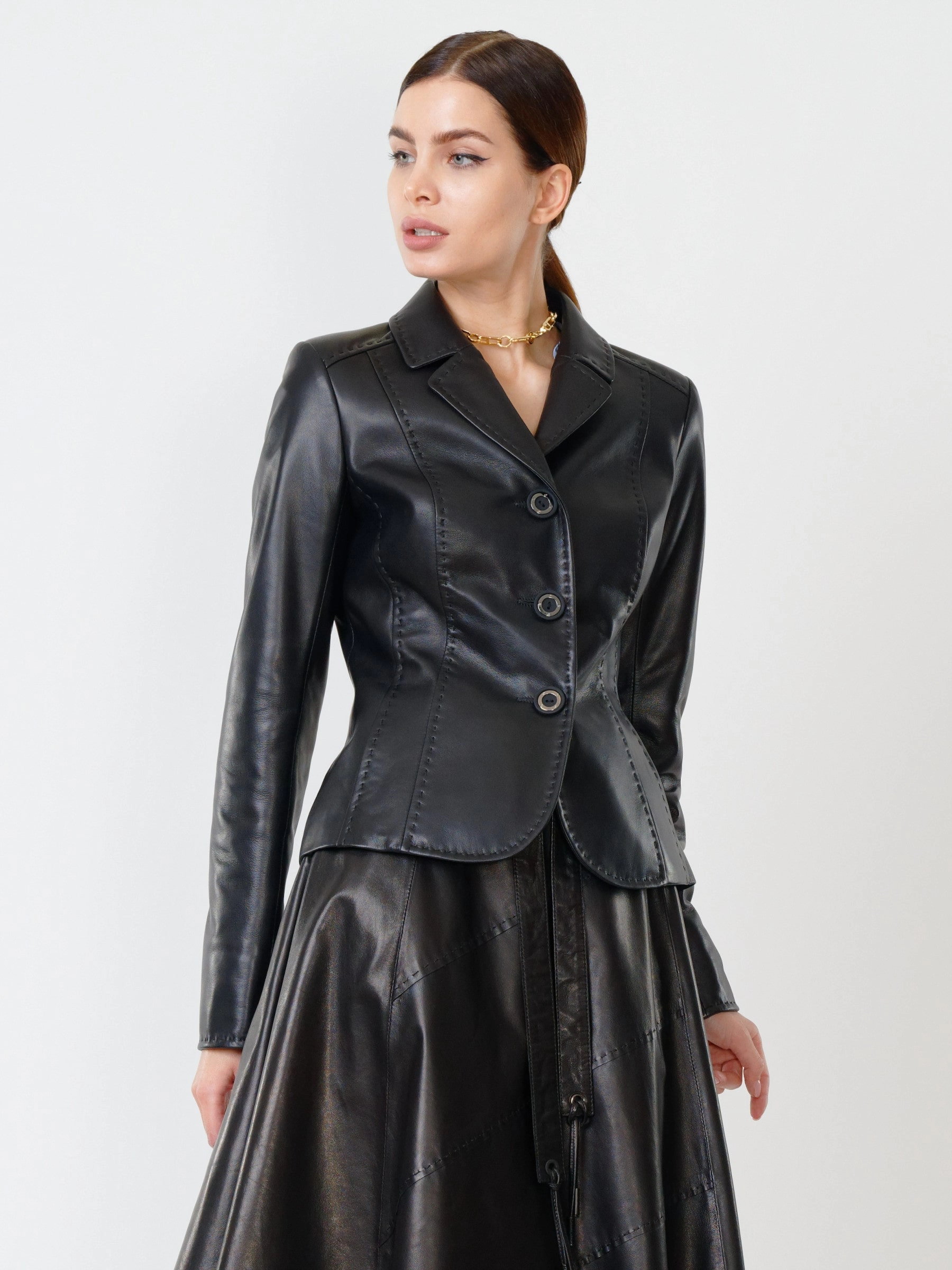 Что может быть круче классического кожаного пиджака украшенного ручным стежком в дуэте с расклешенной юбкой из нежной, мягкой кожи.Универсальность данных моделий заключается в том, что с ними все сочетается. Только комфорт, только высшее качество.