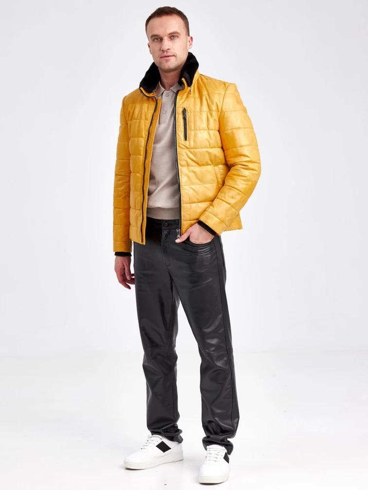Зимний короткий кожаный пуховик для мужчин 40132, желтый, размер 48 , артикул 23110
