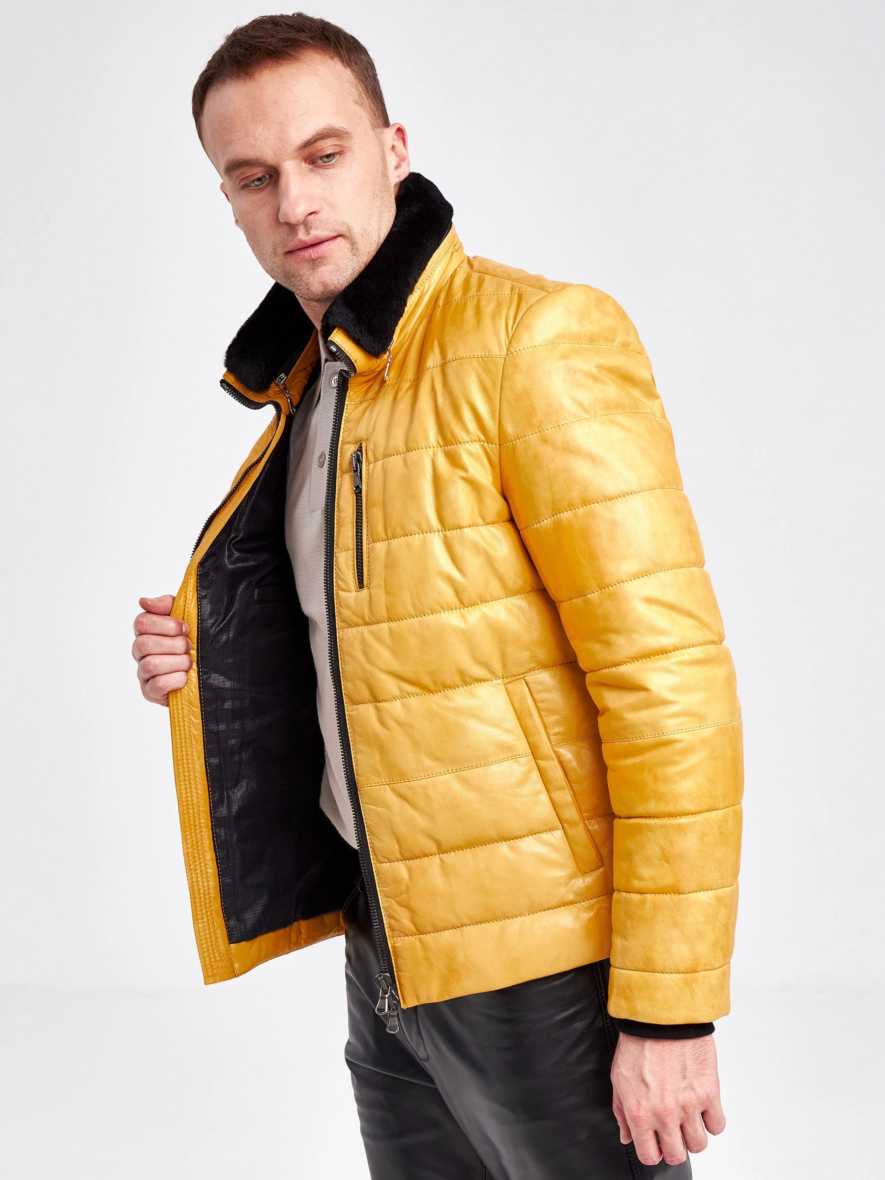 Товар зимний короткий кожаный пуховик для мужчин 40132, желтый, размер 48 , артикул 23110 выполнен из натуральной кожи с застежкой молния. Рассчитан на сезон: осень-зима. Длина изделия 69 см, силуэт полуприлегающий.