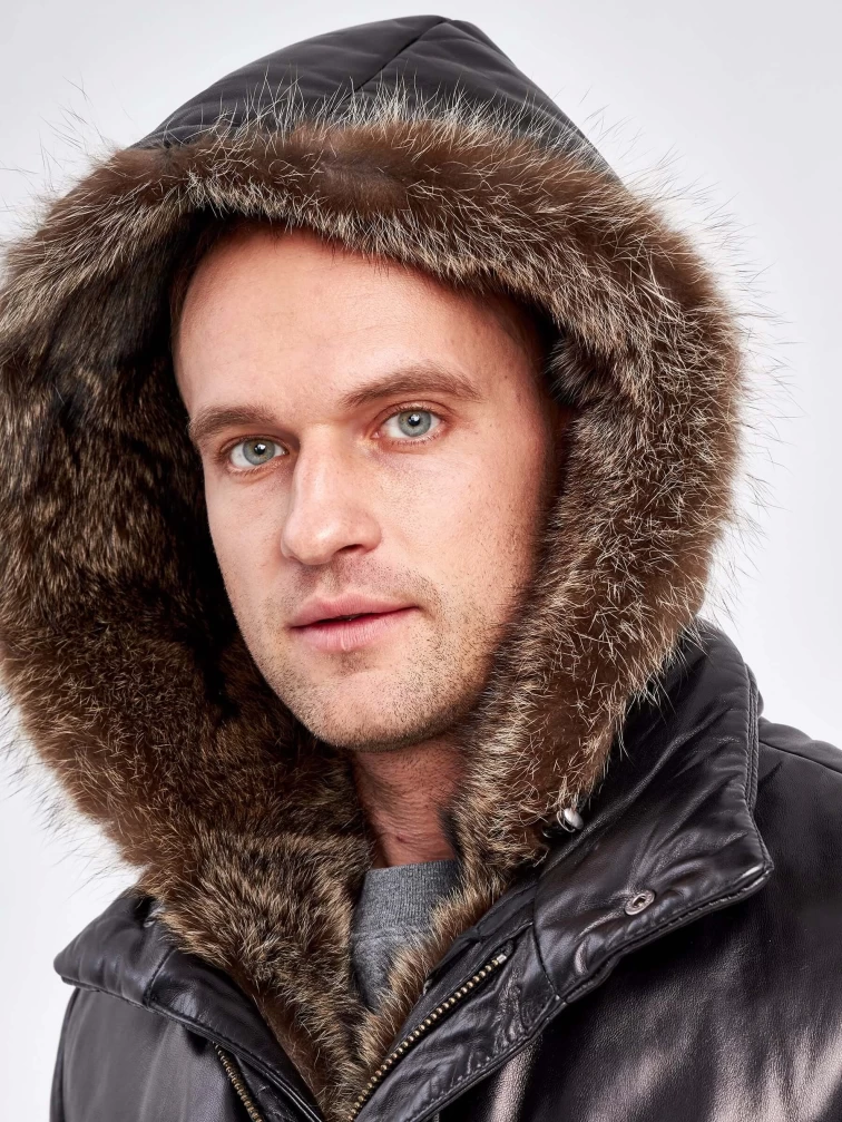 Зимняя куртка премиального качества из натуральной кожи, большим сьемным енотовым капюшоном и отделкой мехом серебристого енота на передней планке.