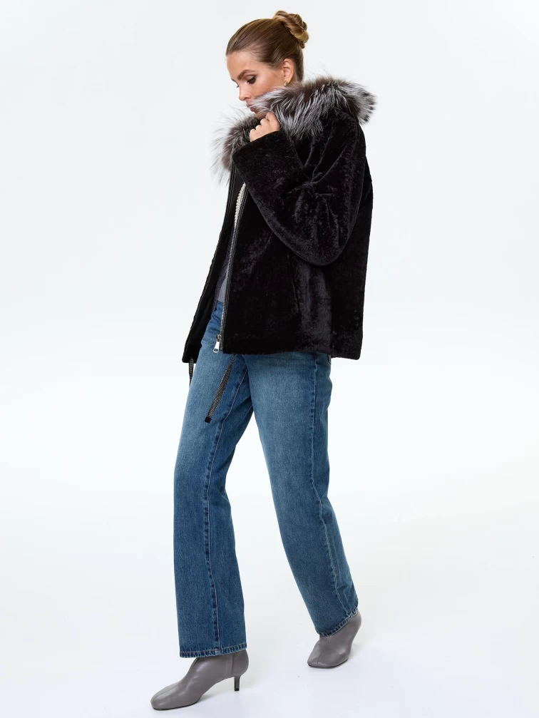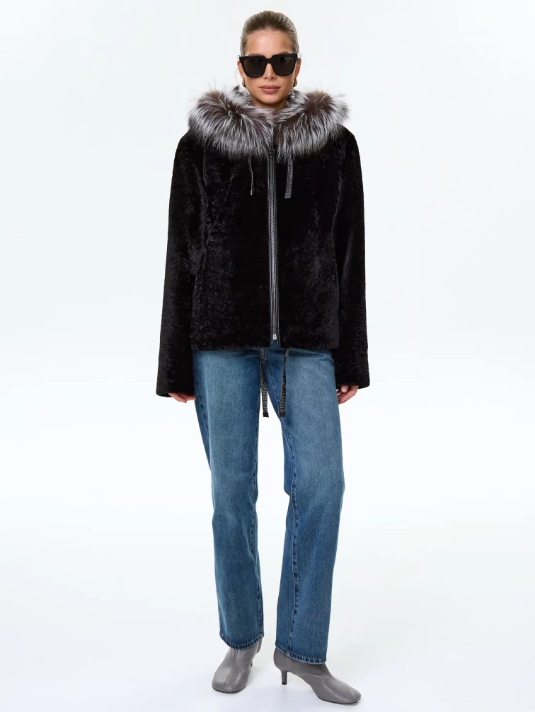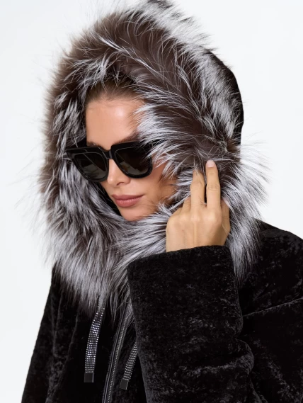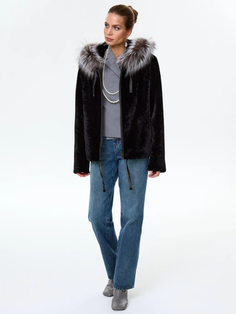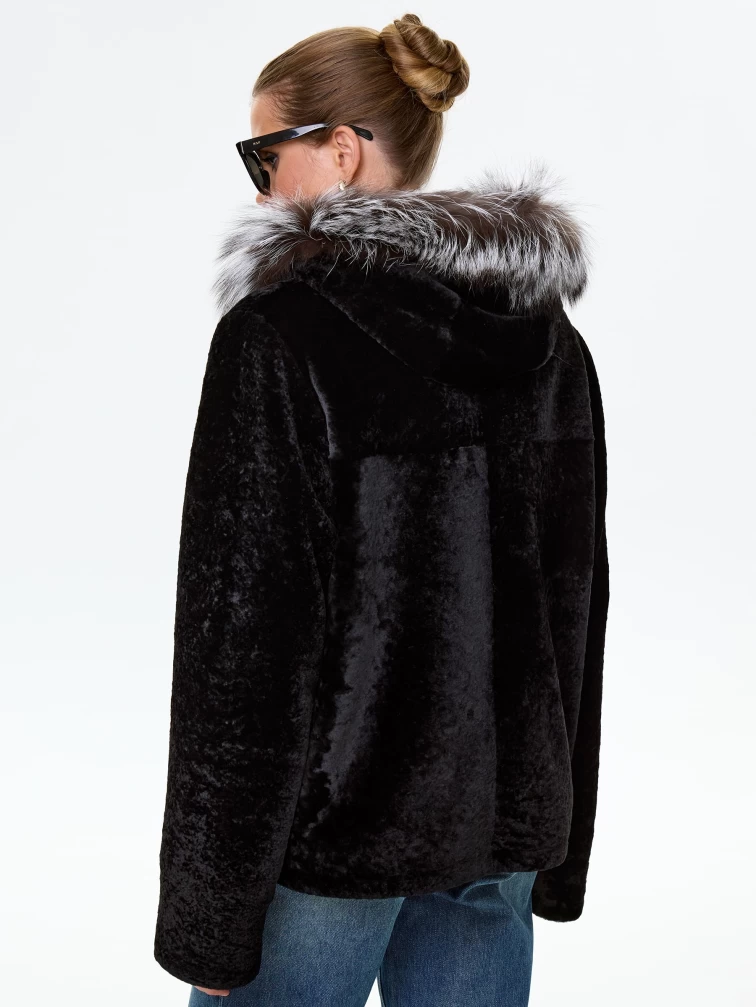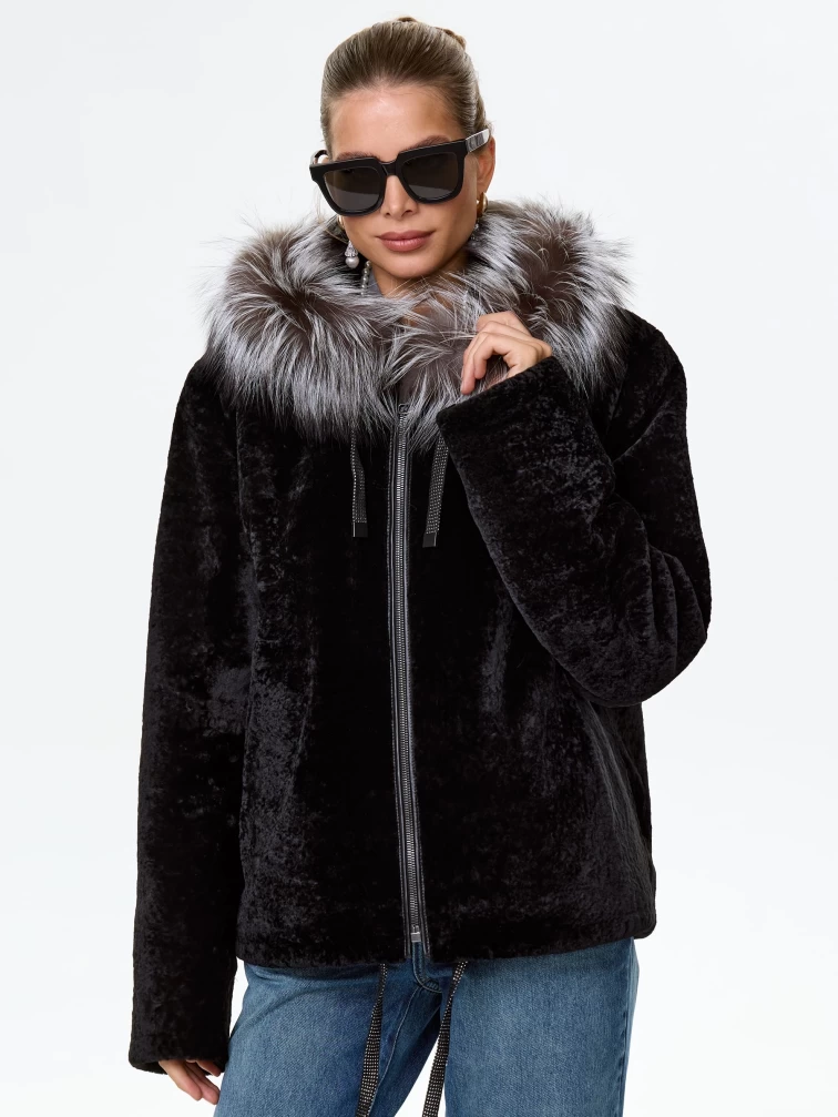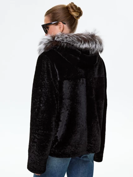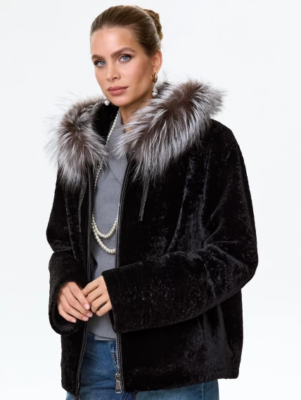 Короткая дубленка из астрагана с капюшоном и мехом песца для женщин 50мех, черная, размер 46, артикул 17570
