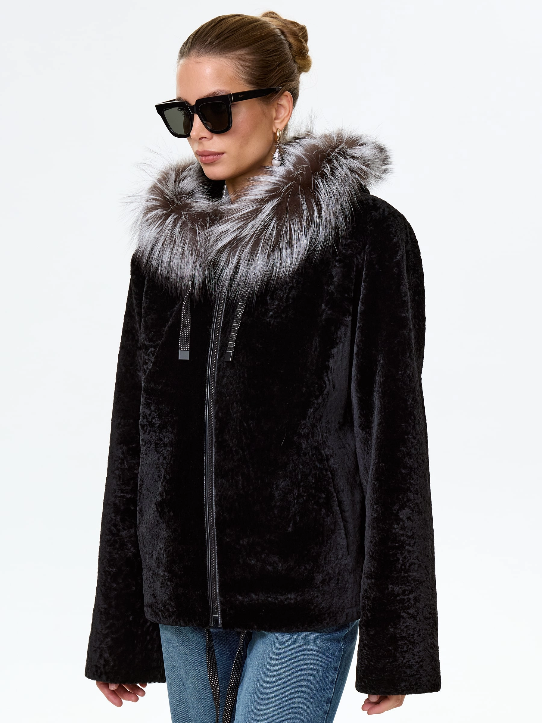 Товар короткая дубленка из астрагана с капюшоном и мехом песца для женщин 50мех, черная, размер 46, артикул 17570 выполнен из астраган с застежкой молния. Рассчитан на сезон: осень-зима. Длина изделия 68 см, силуэт свободный.
