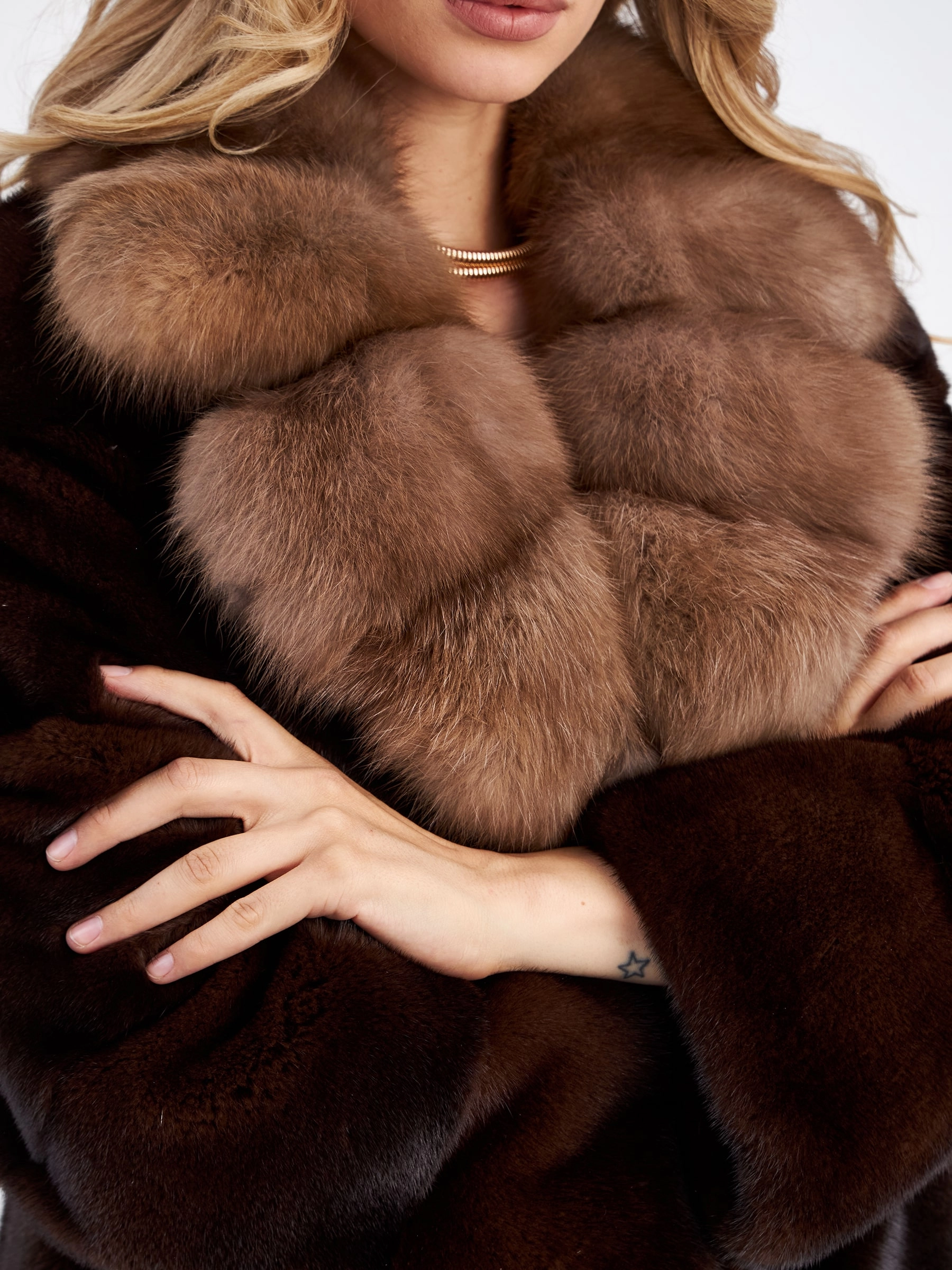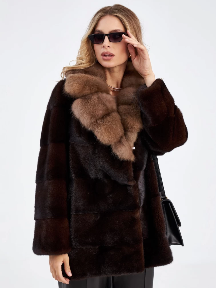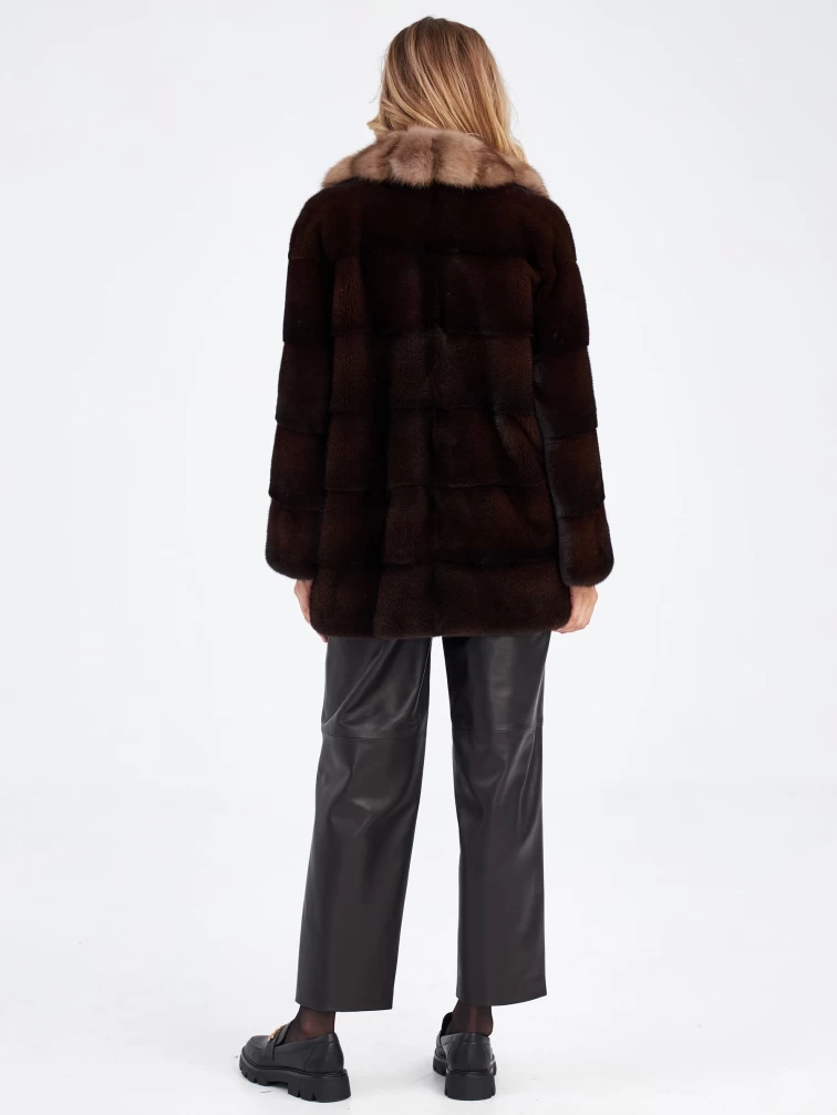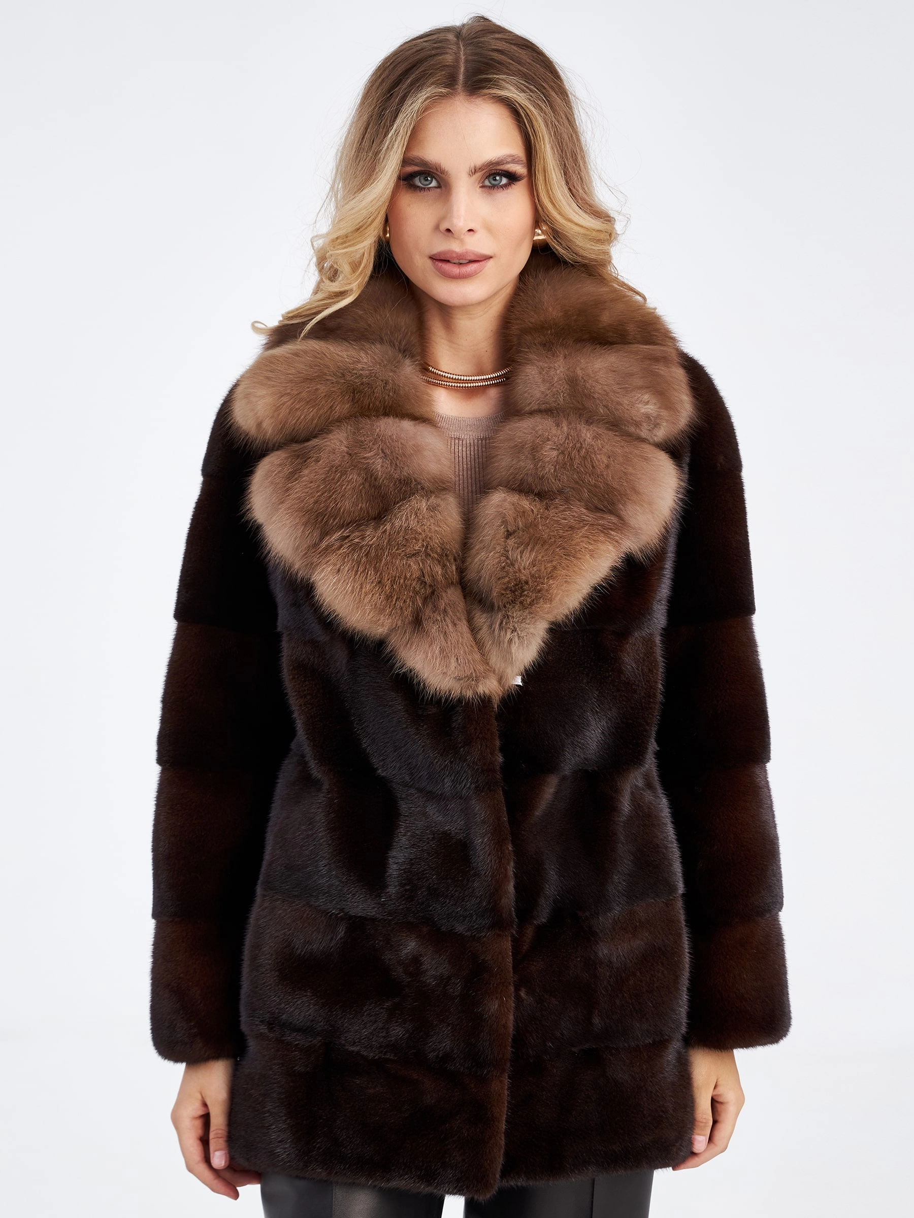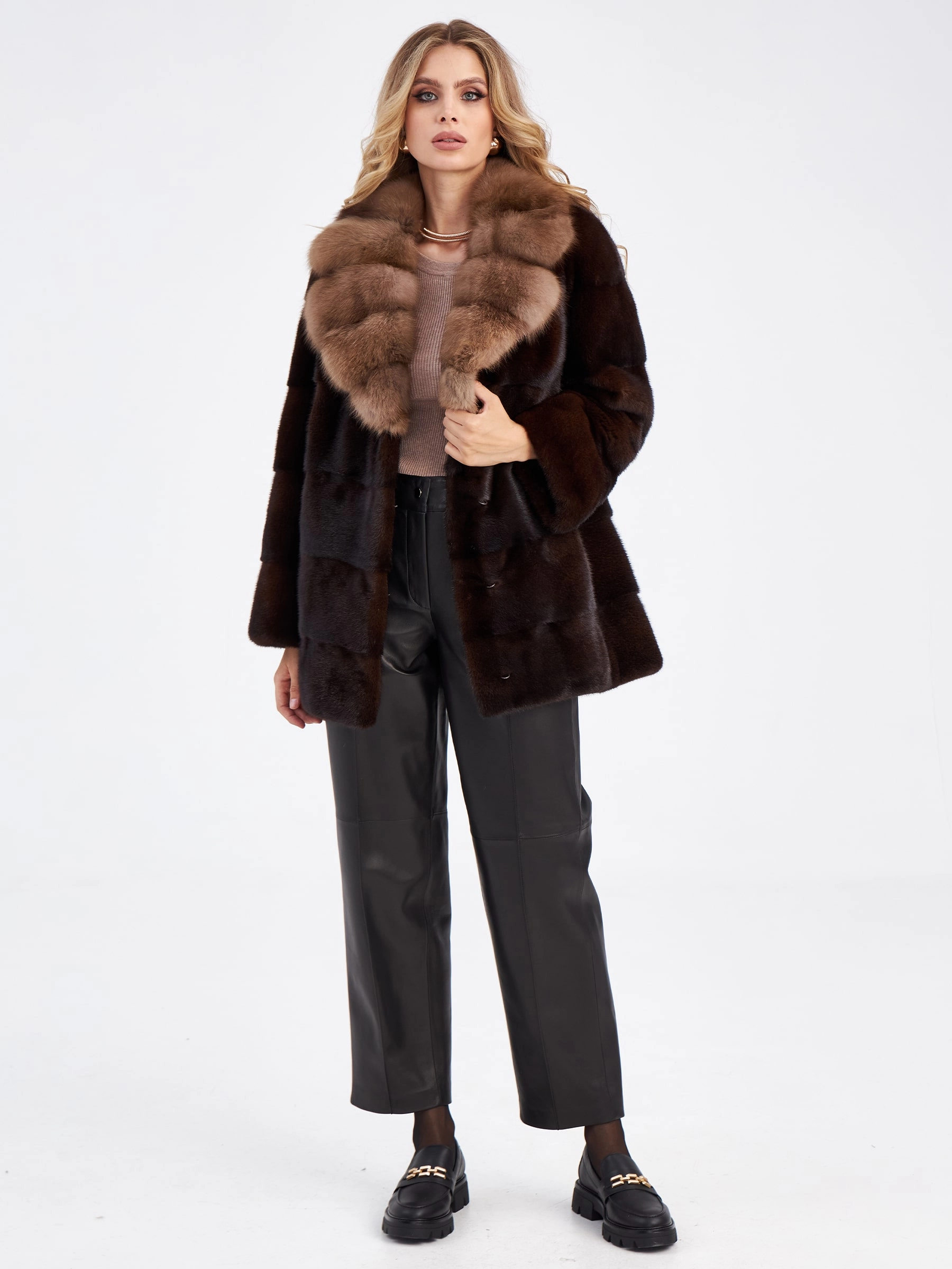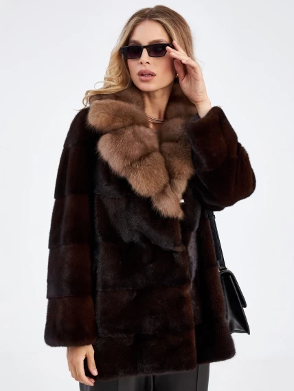 Женская куртка автоледи из меха норки с воротником из меха куницы 2а-к(авк), темно-коричневая, размер 48, артикул 33830