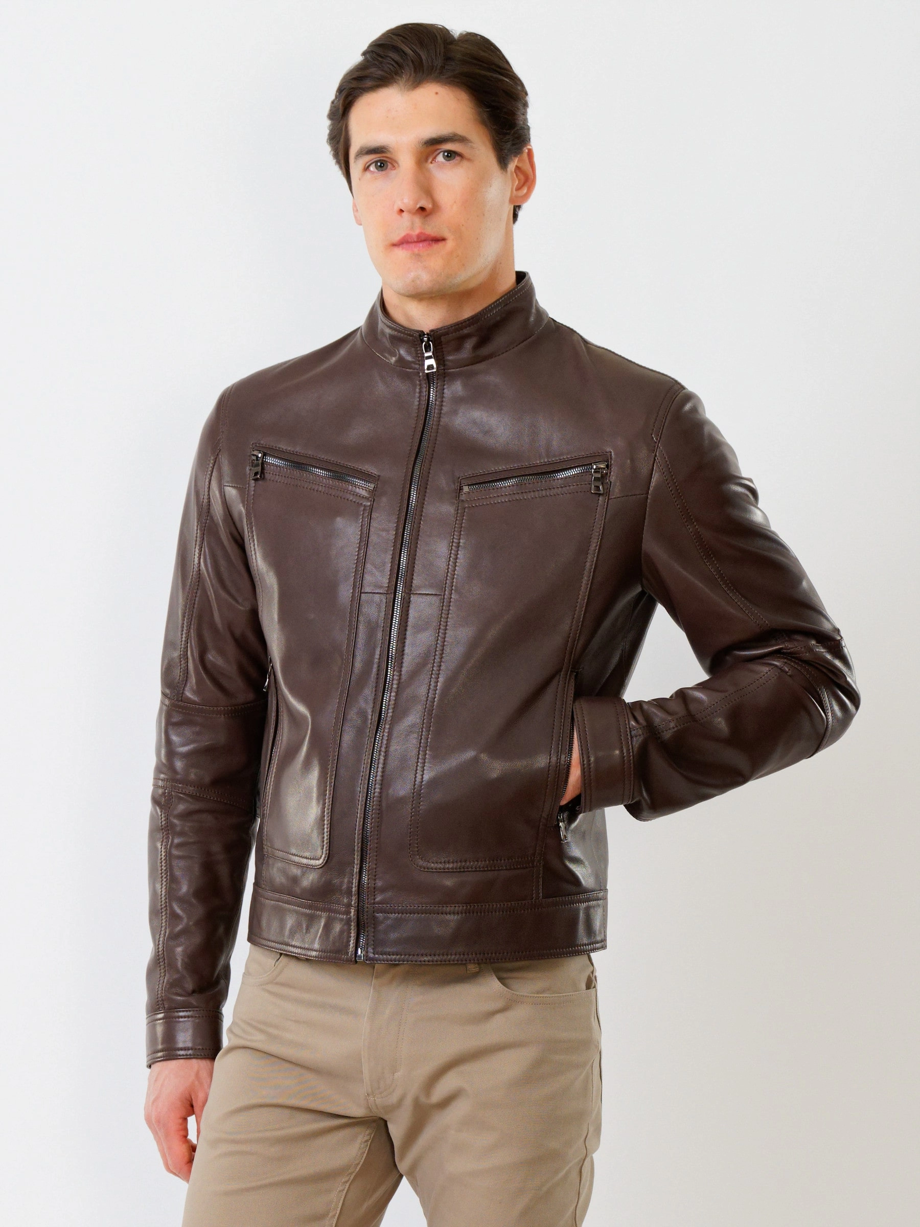 Для пошива короткой куртки использовали гладкую кожу премиального качества. Воротник-стойка оптимальный по высоте. Застёжка-молния. Рукав втачной. Боковые и нагрудные карманы на молниях. Предусмотрены удобные внутренние карманы для документов. Безупречная работа наших портных. Обеспечена идеальная посадка по фигуре и прекрасная свобода движений.