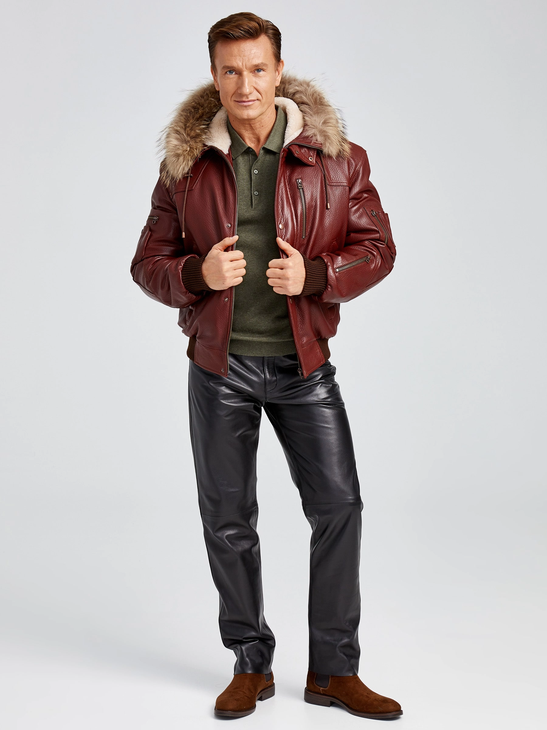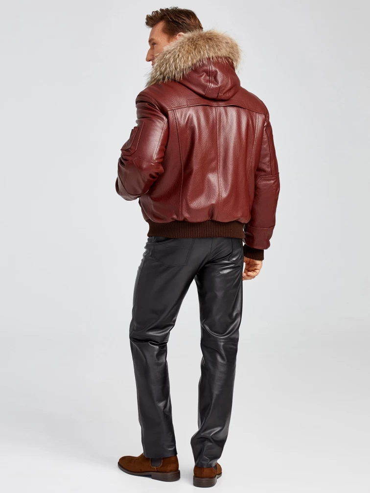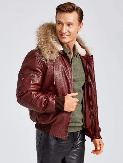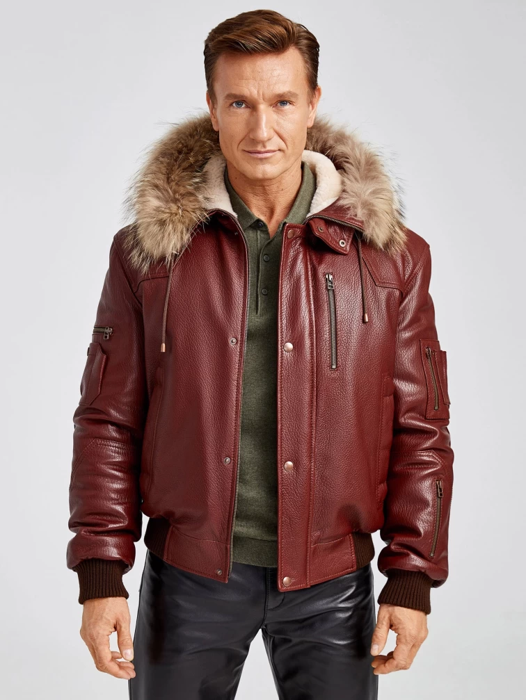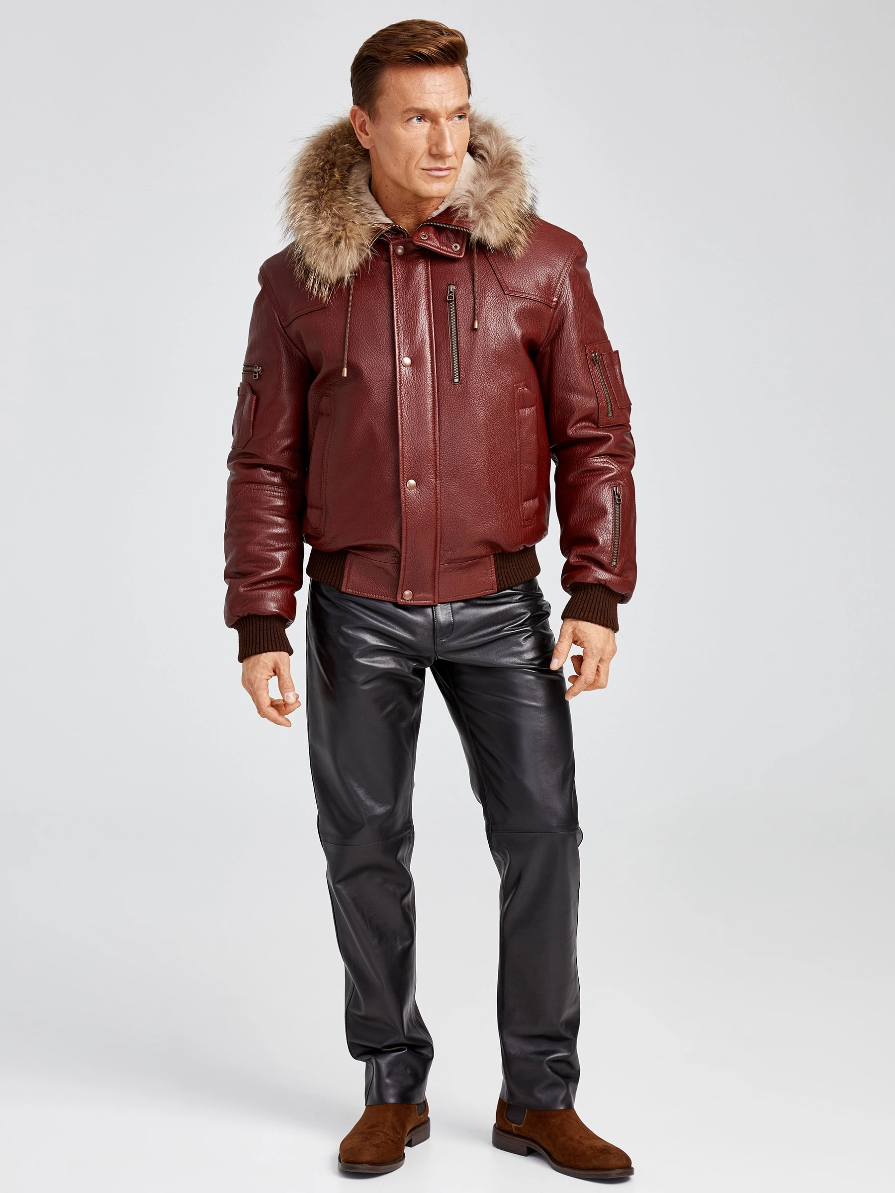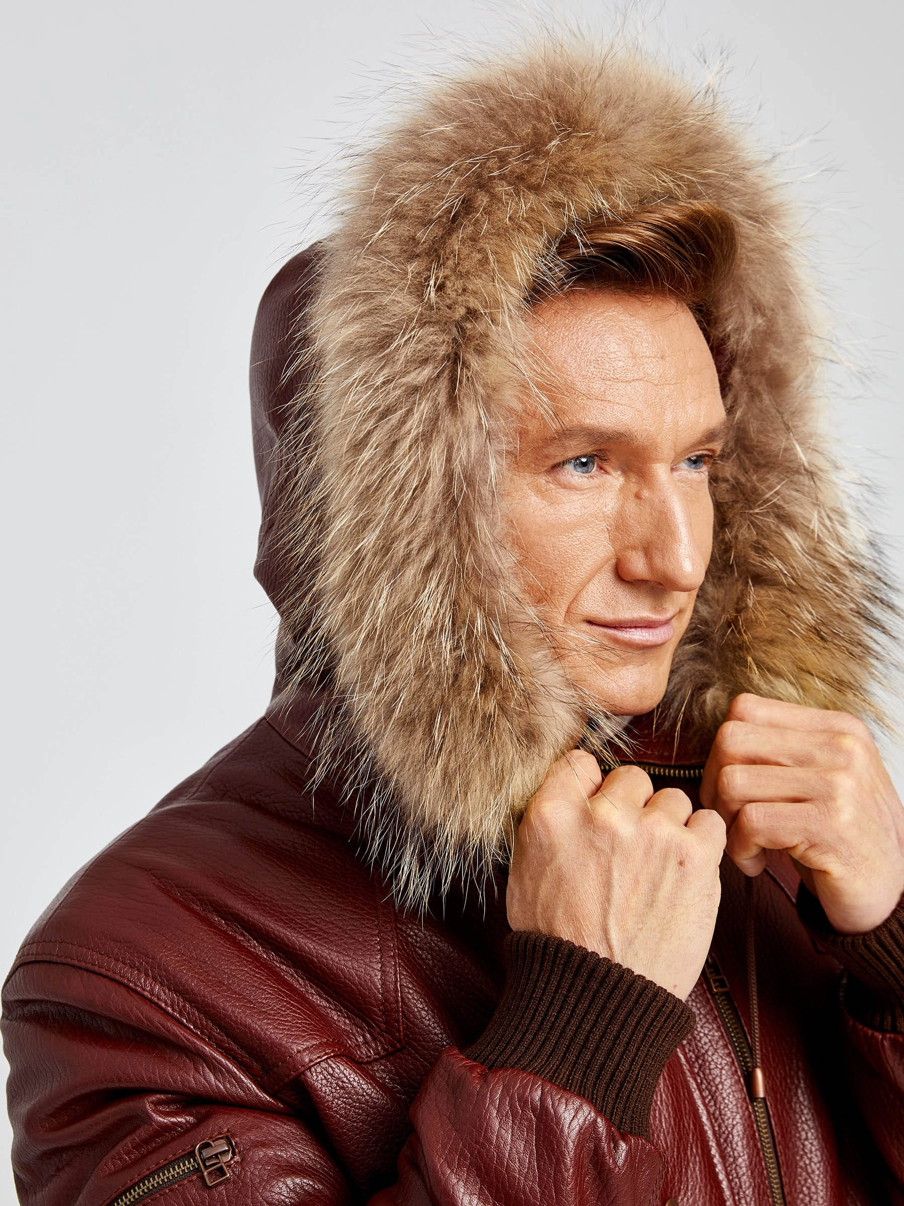 Кожаная мужская куртка аляска утепленная с мехом енота 509, виски, размер 48, артикул 40392