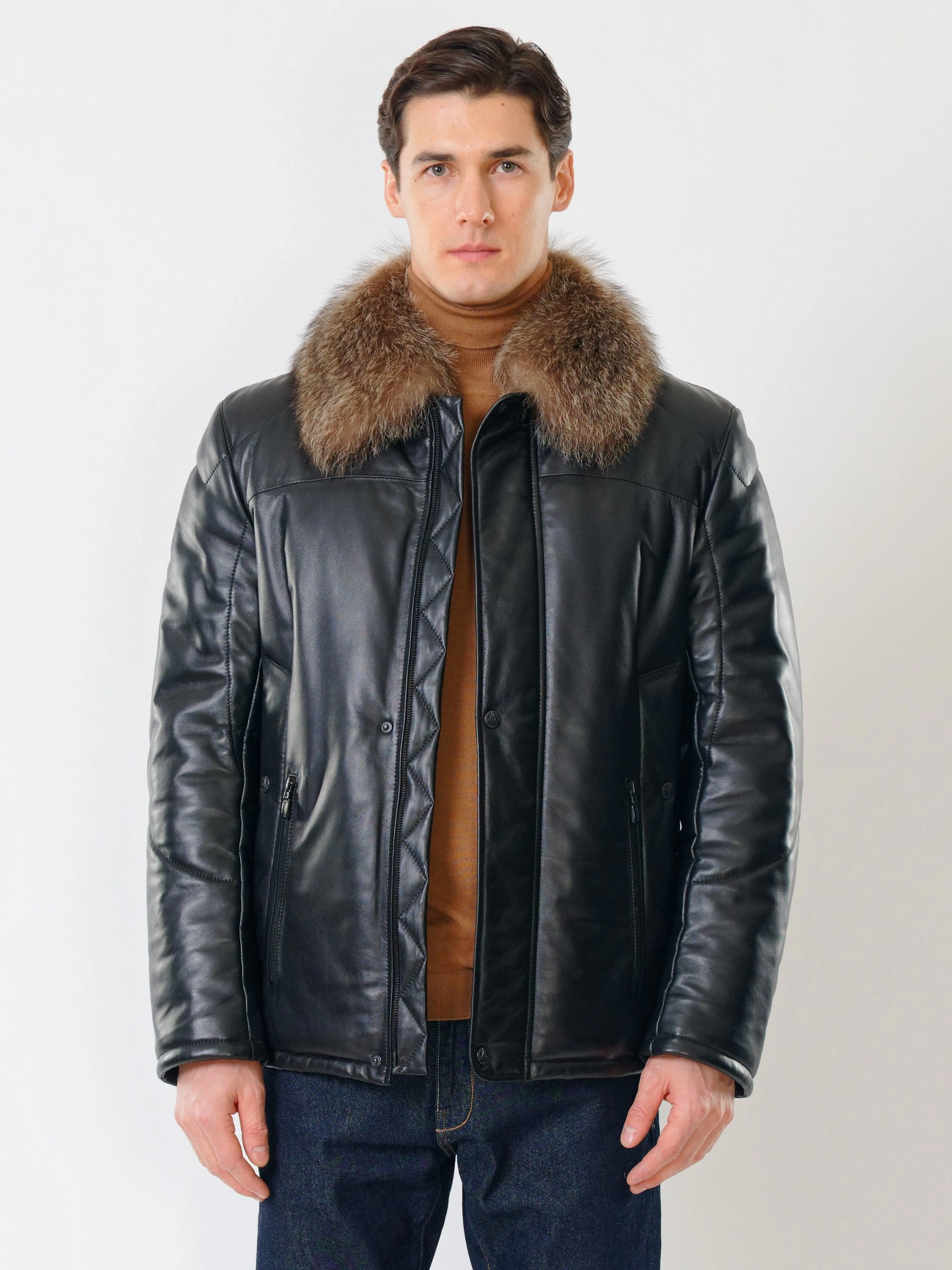 Товар мужской кожаный пуховик с воротником меха енота премиум класса джастин, черный, размер 48, артикул 40311 выполнен из натуральной кожи с застежкой молния. Рассчитан на сезон: осень-зима. Длина изделия 74 см, силуэт полуприлегающий.