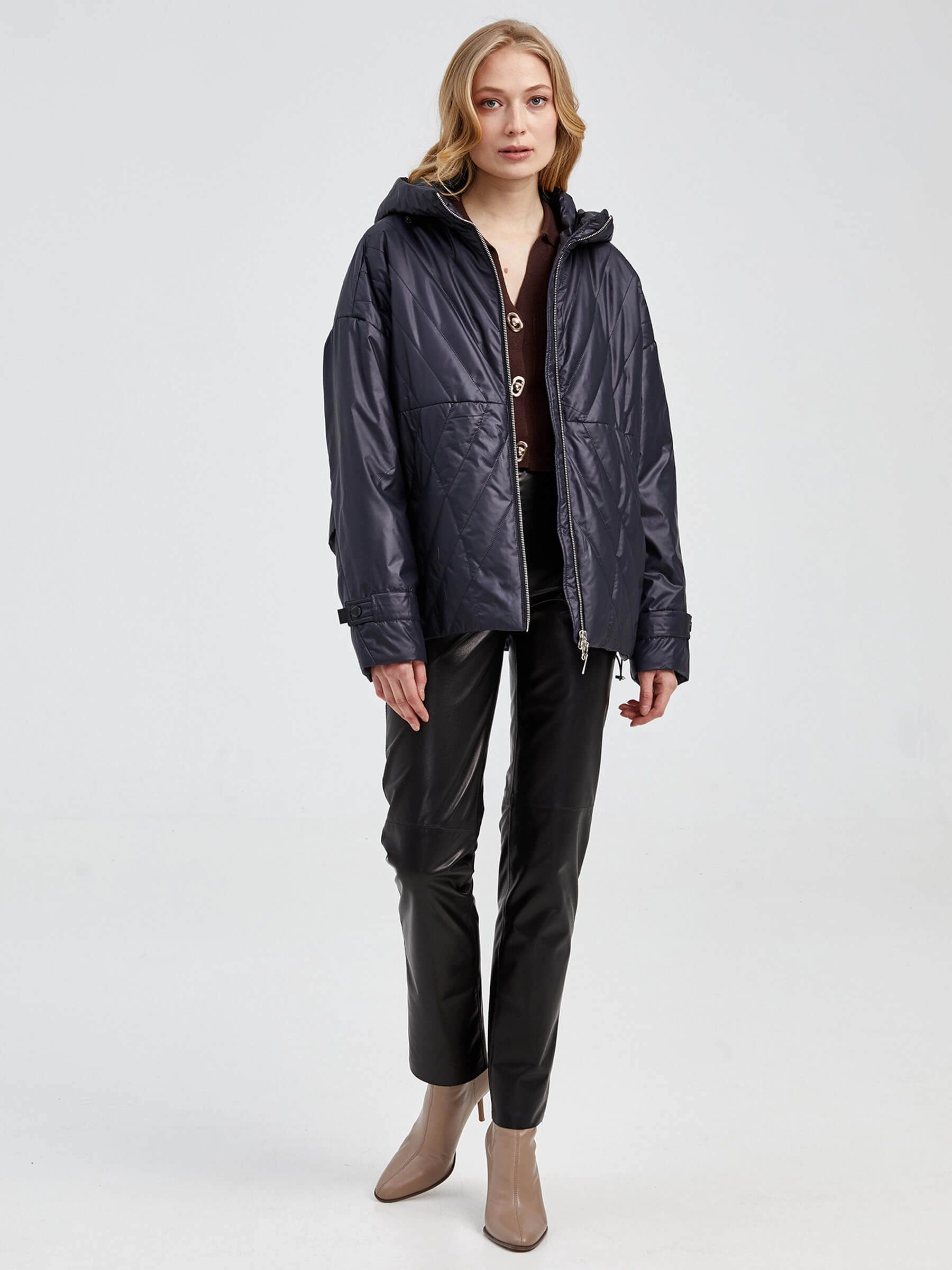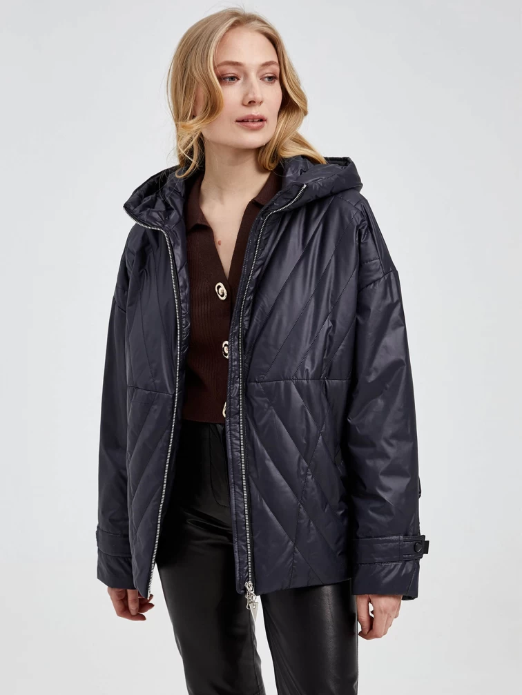 Стеганая женская куртка свободного кроя с застежкой на молнии. Наполнитель – синтепон, воротник- капюшон, два боковых кармана.