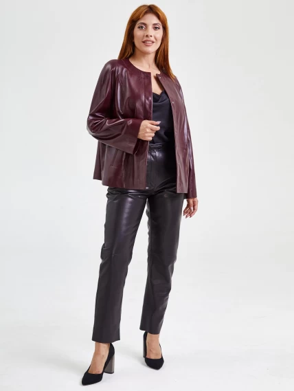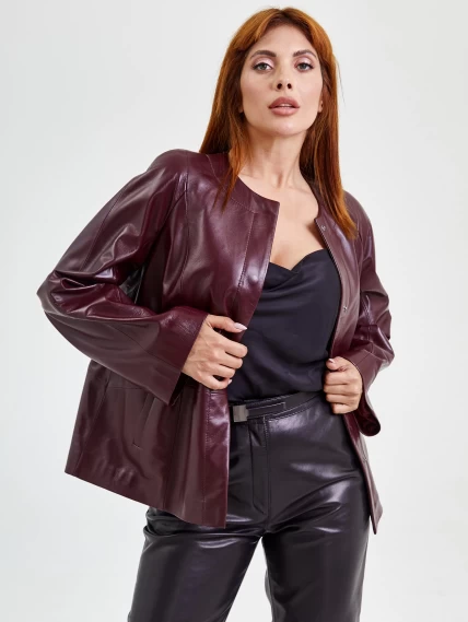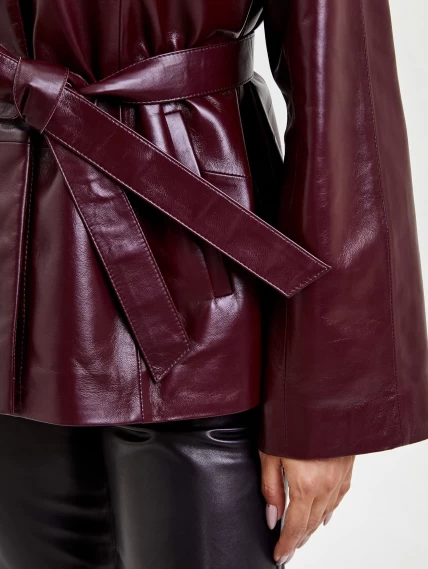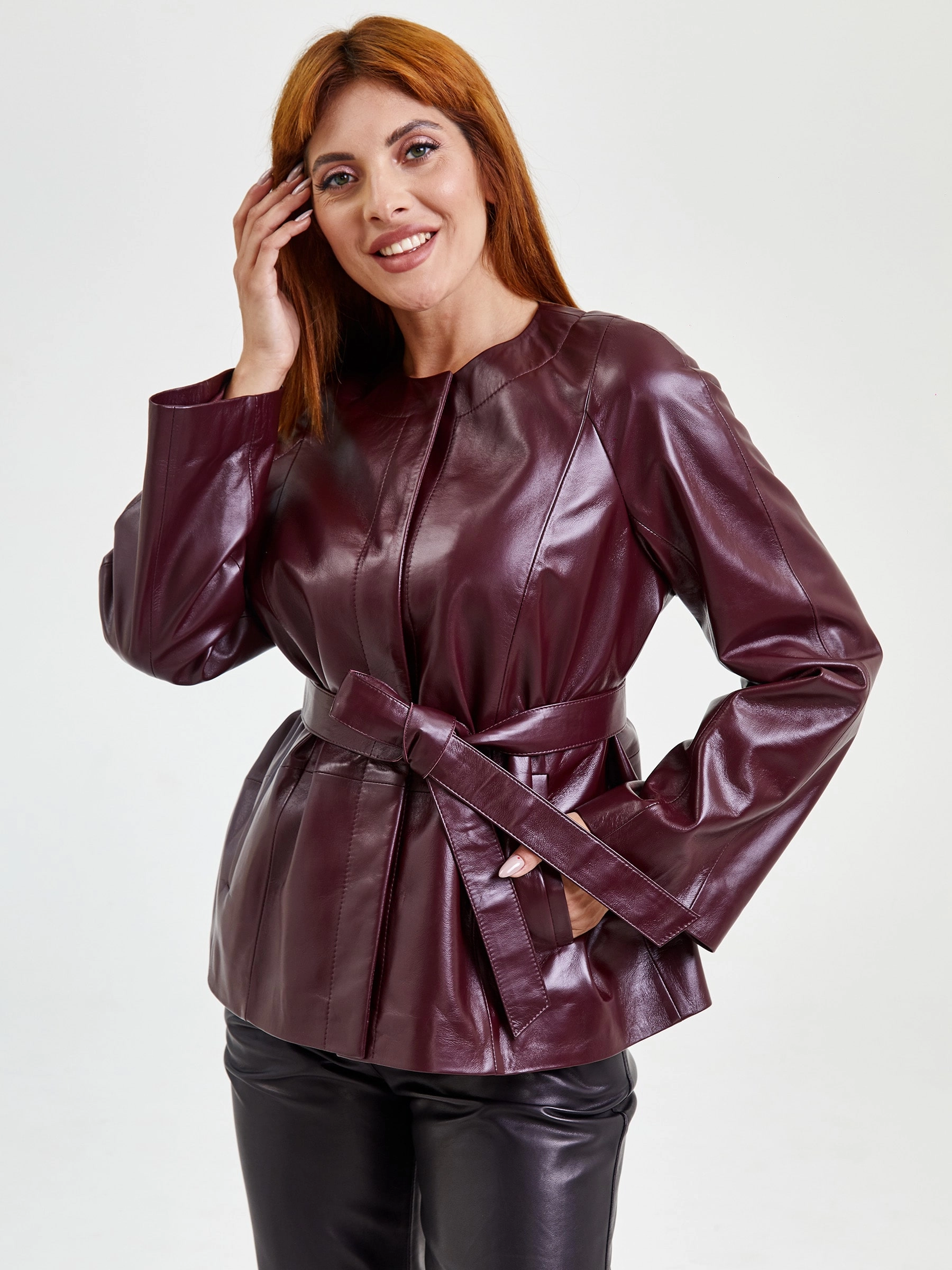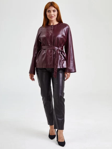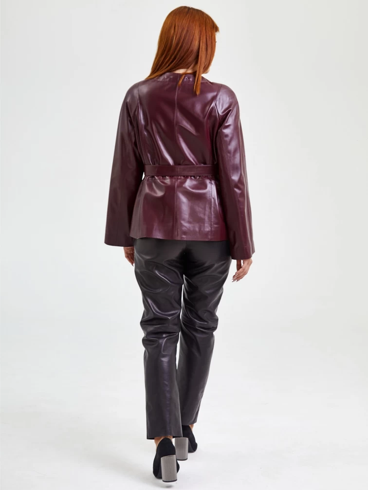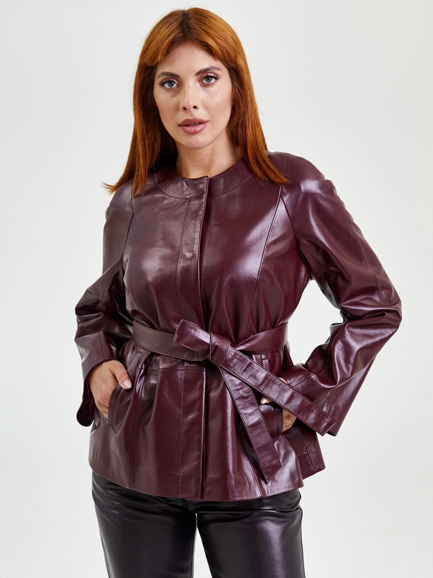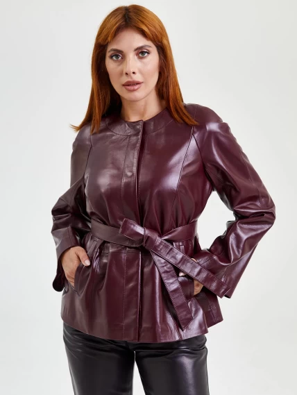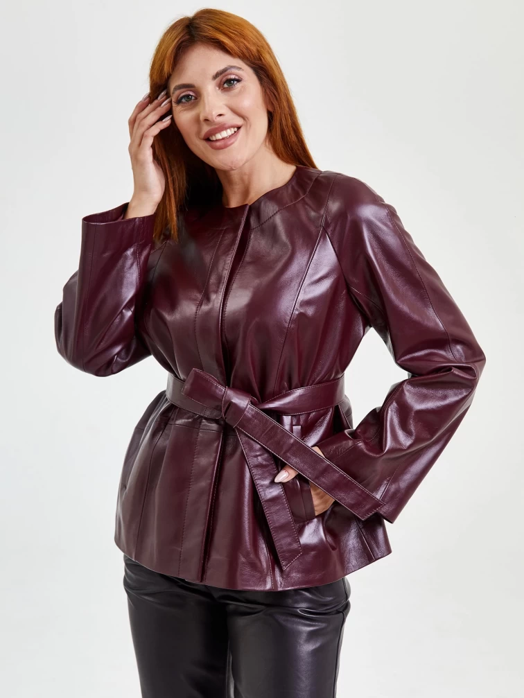 Кожаная женская куртка без воротника с поясом 3019, бордовая, размер 48, артикул 91700