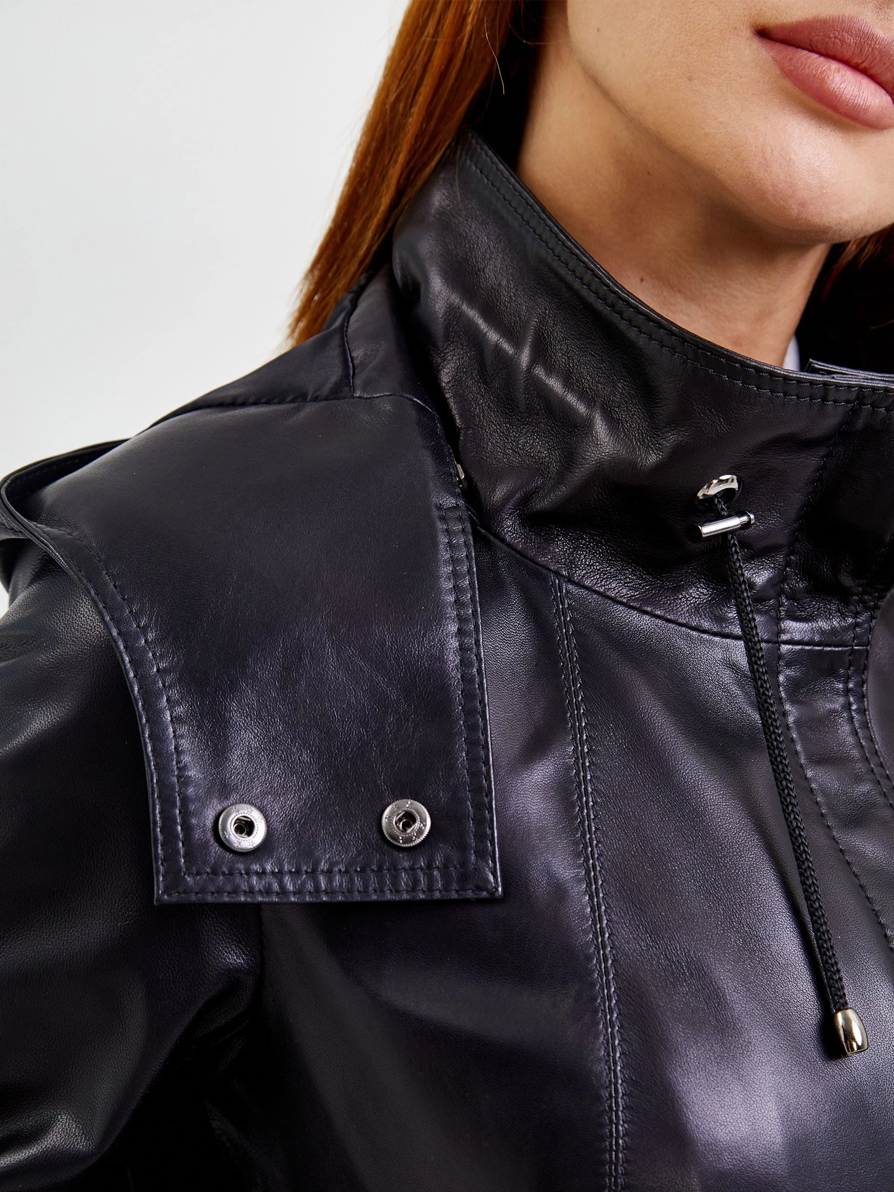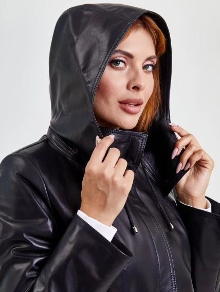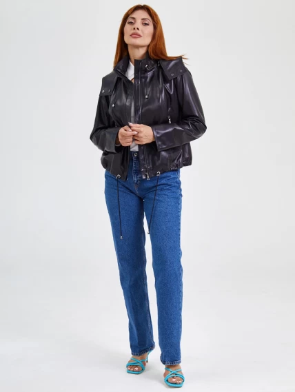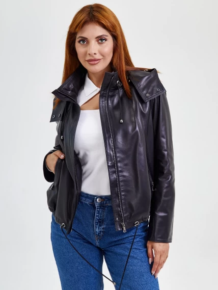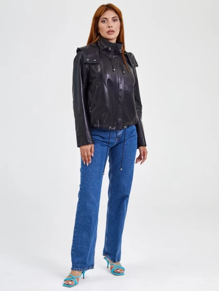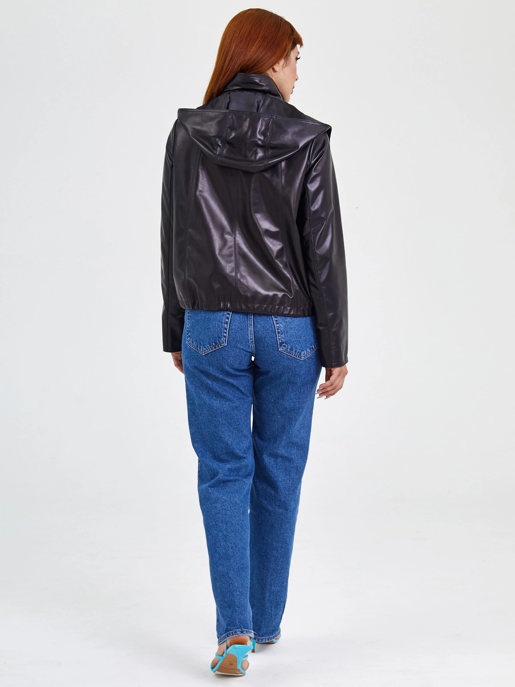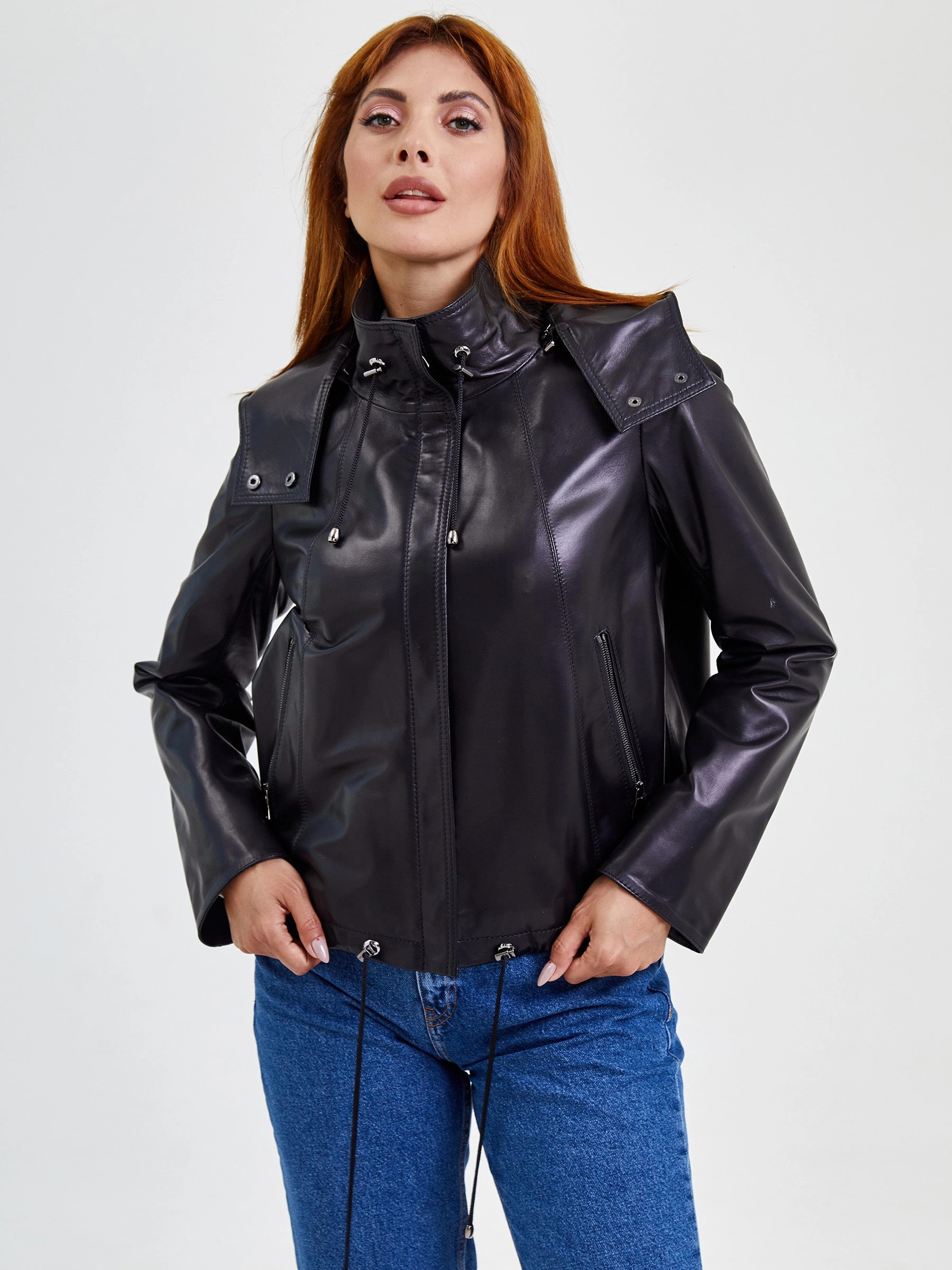 Кожаная женская куртка бомбер с капюшоном 305, черная, размер 46, артикул 91761