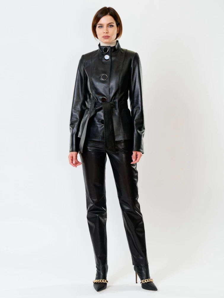 Товар кожаная женская куртка с поясом 334, черная, размер 40, артикул 91101 выполнен из натуральной кожи с застежкой пуговицы. Рассчитан на сезон: весна-лето. Длина изделия 66 см, силуэт приталенный .